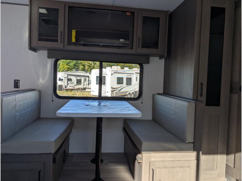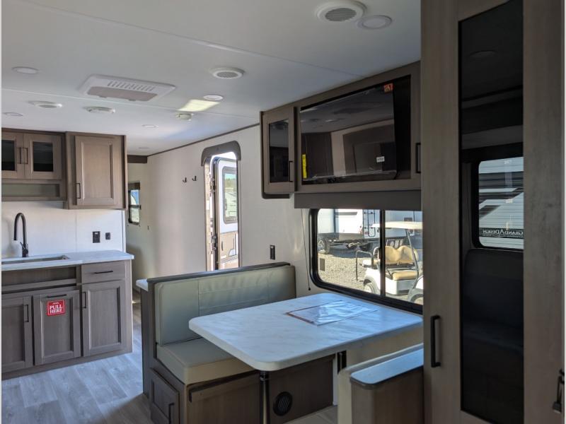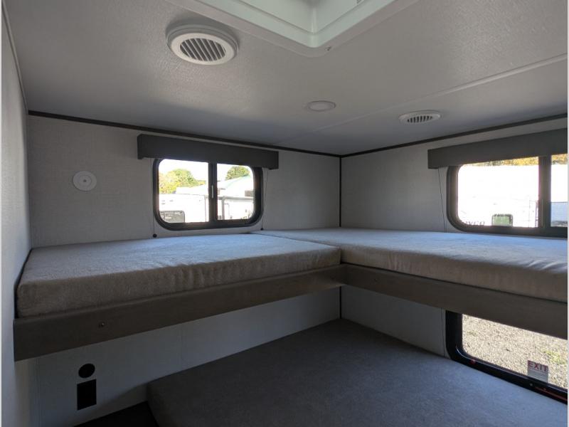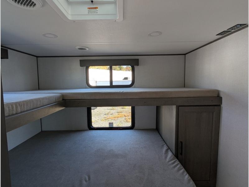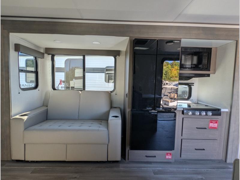 You're going to love every minute spent in this Transcend travel trailer! Your guests or the little ones will have the rear bunkhouse all to themselves that includes a residential full-size bed and two bunks, storage drawers, and TV prep if you want to add a television here. You'll enjoy your own space up front in the private bedroom with a queen bed, storage drawers, and TV prep here also. The combined kitchen and living area includes a sleeper sofa with an optional theater seating, a booth dinette where you can dine together, and a 32" TV for movie nights! The exterior is just as accommodating with its 20' awning, rear storage, plus exterior griddle and refrigerator!