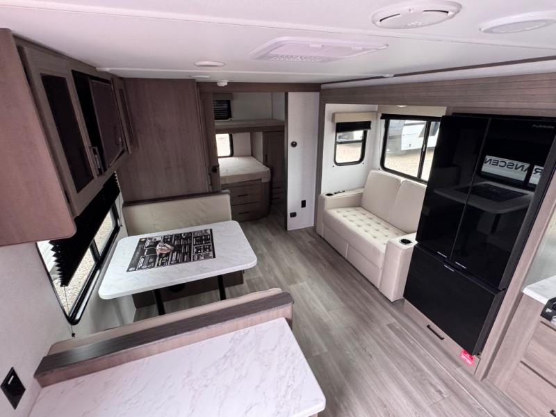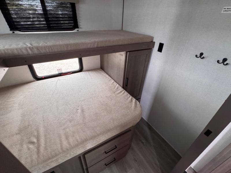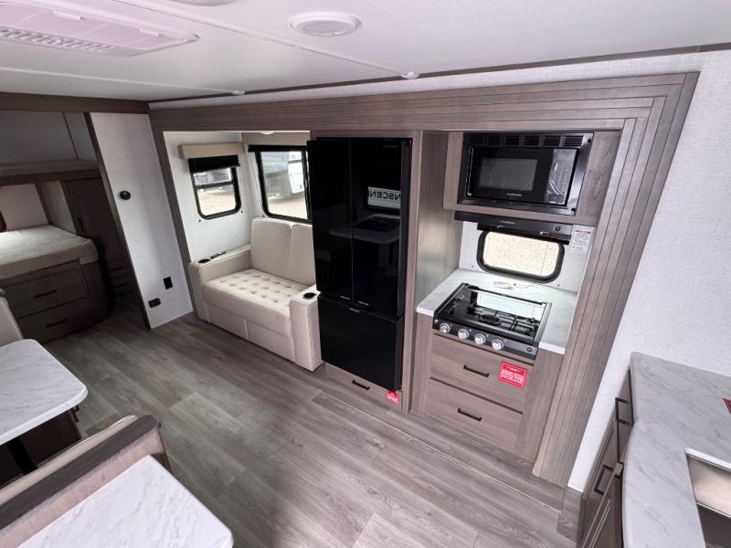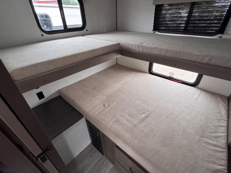 You're going to love every minute spent in this Transcend travel trailer! Your guests or the little ones will have the rear bunkhouse all to themselves that includes a residential full-size bed and two bunks, storage drawers, and TV prep if you want to add a television here. You'll enjoy your own space up front in the private bedroom with a queen bed, storage drawers, and TV prep here also. The combined kitchen and living area includes a sleeper sofa with an optional theater seating, a booth dinette where you can dine together, and a 32" TV for movie nights! The exterior is just as accommodating with its 20' awning, rear storage, plus exterior griddle and refrigerator!