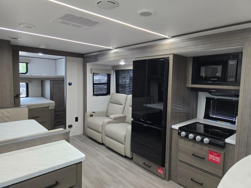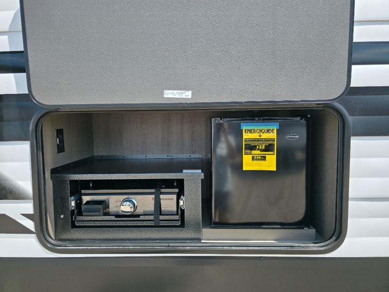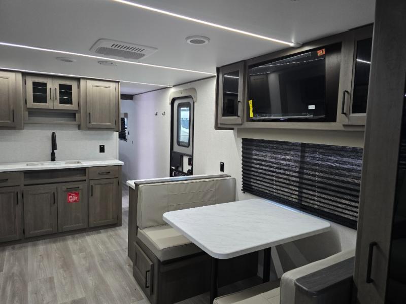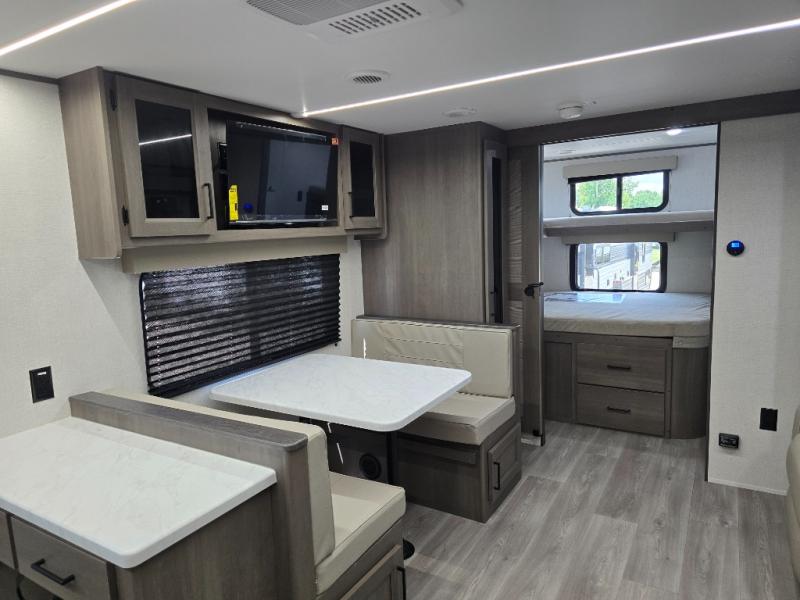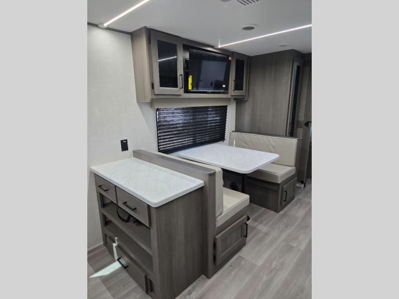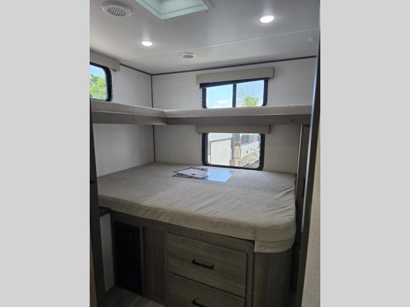You're going to love every minute spent in this Transcend travel trailer! Your guests or the little ones will have the rear bunkhouse all to themselves that includes a residential full-size bed and two bunks, storage drawers, and TV prep if you want to add a television here. You'll enjoy your own space up front in the private bedroom with a queen bed, storage drawers, and TV prep here also. The combined kitchen and living area includes a sleeper sofa with an optional theater seating, a booth dinette where you can dine together, and a 32" TV for movie nights! The exterior is just as accommodating with its 20' awning, rear storage, plus exterior griddle and refrigerator!