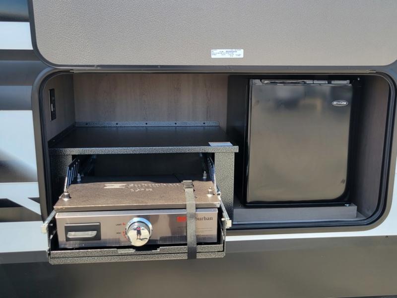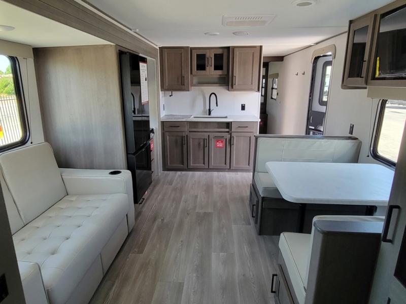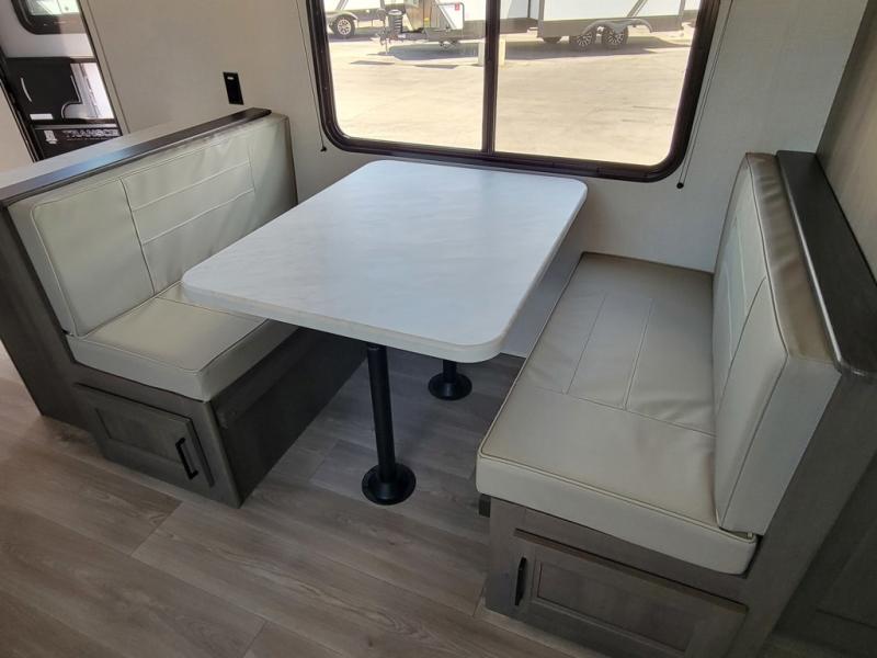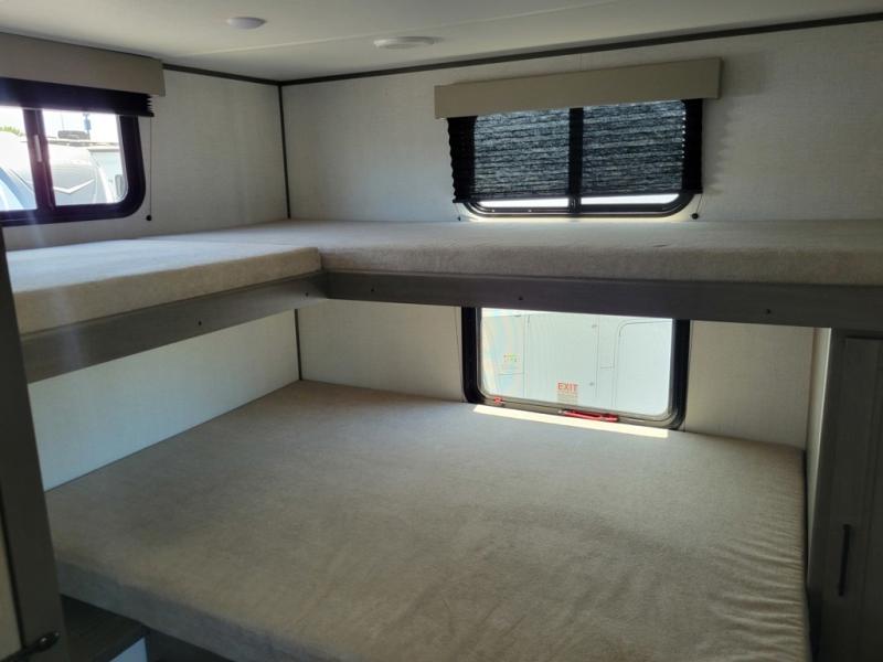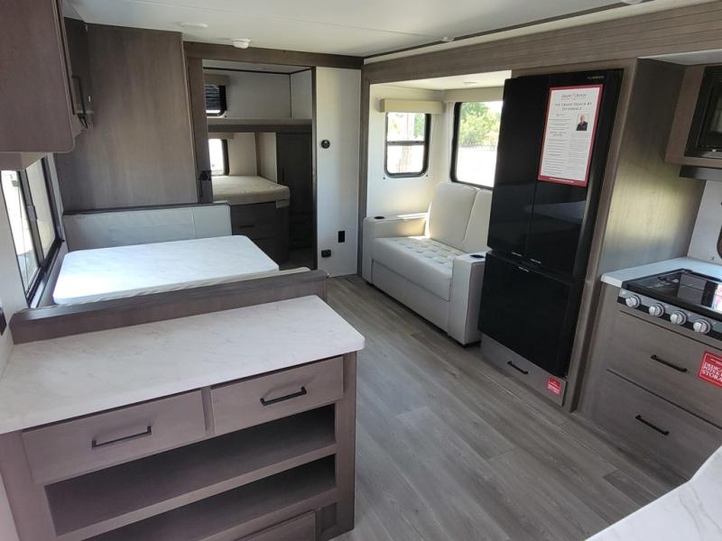 You're going to love every minute spent in this Transcend travel trailer! Your guests or the little ones will have the rear bunkhouse all to themselves that includes a residential full-size bed and two bunks, storage drawers, and TV prep if you want to add a television here. You'll enjoy your own space up front in the private bedroom with a queen bed, storage drawers, and TV prep here also. The combined kitchen and living area includes a sleeper sofa with an optional theater seating, a booth dinette where you can dine together, and a 32" TV for movie nights! The exterior is just as accommodating with its 20' awning, rear storage, plus exterior griddle and refrigerator!