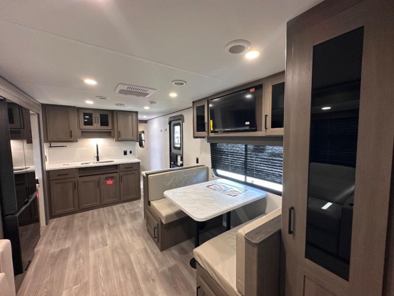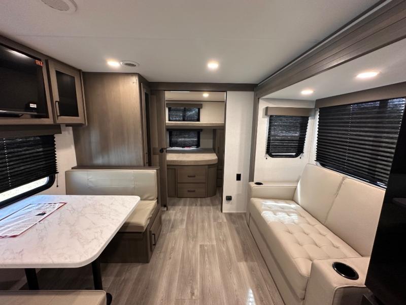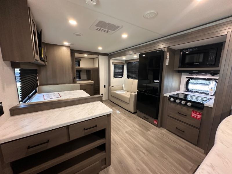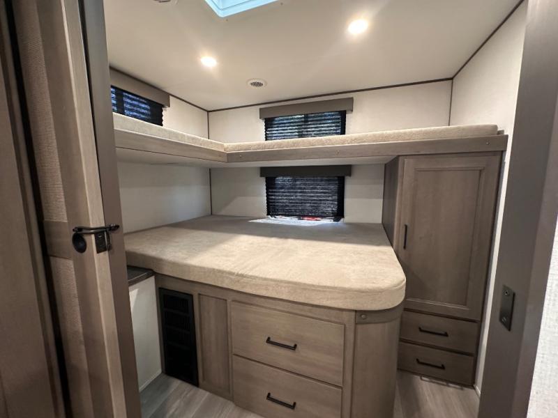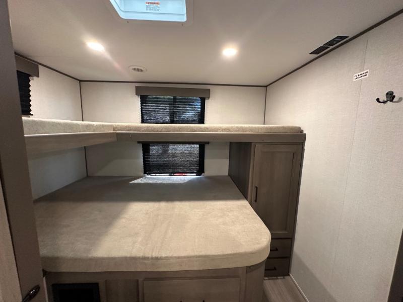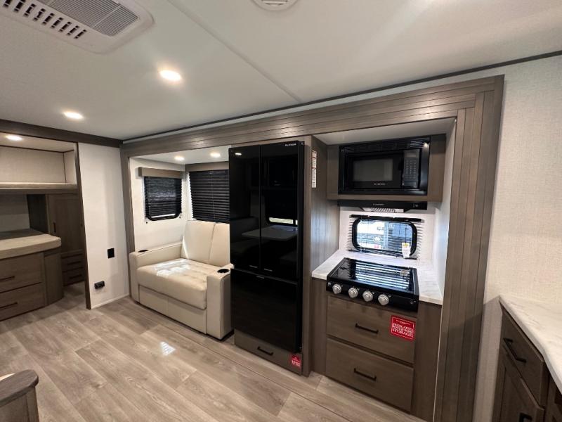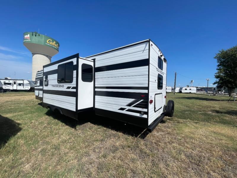 You're going to love every minute spent in this Transcend travel trailer! Your guests or the little ones will have the rear bunkhouse all to themselves that includes a residential full-size bed and two bunks, storage drawers, and TV prep if you want to add a television here. You'll enjoy your own space up front in the private bedroom with a queen bed, storage drawers, and TV prep here also. The combined kitchen and living area includes a sleeper sofa with an optional theater seating, a booth dinette where you can dine together, and a 32" TV for movie nights! The exterior is just as accommodating with its 20' awning, rear storage, plus exterior griddle and refrigerator!