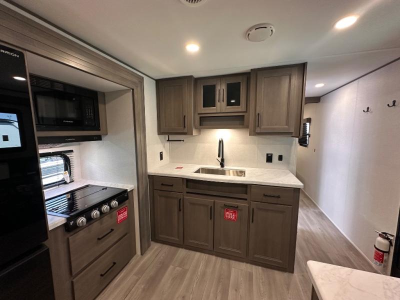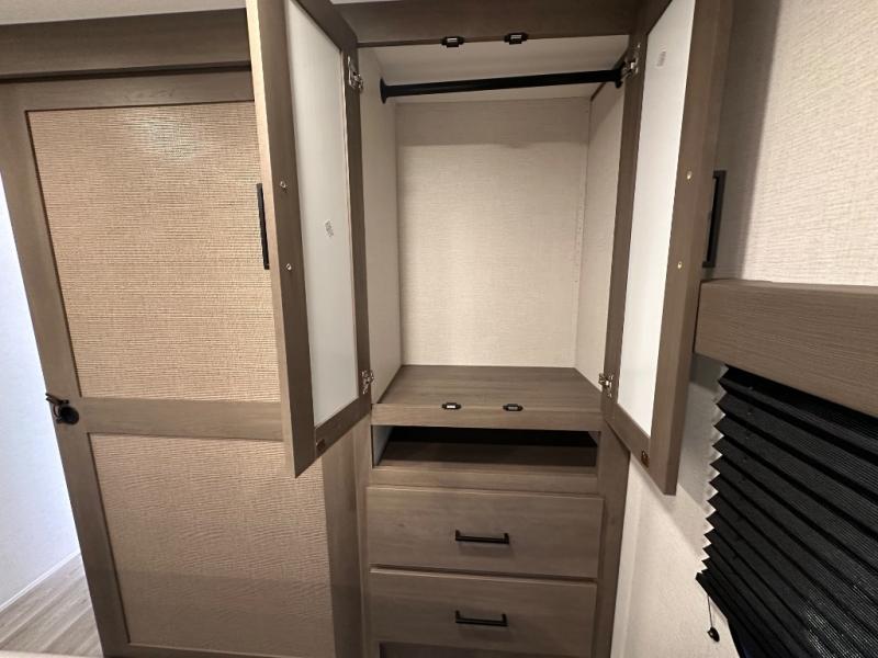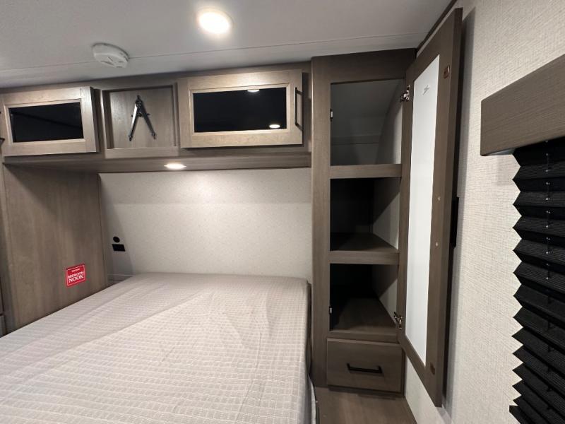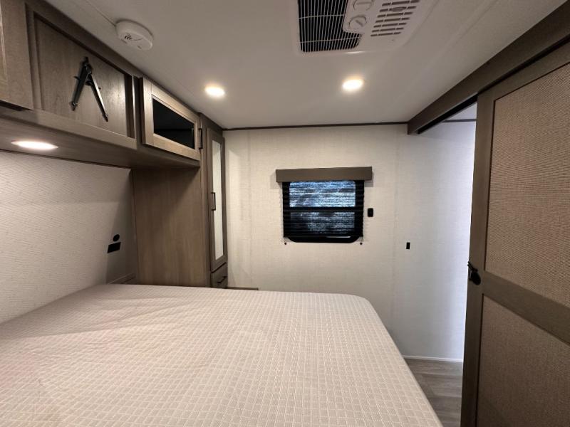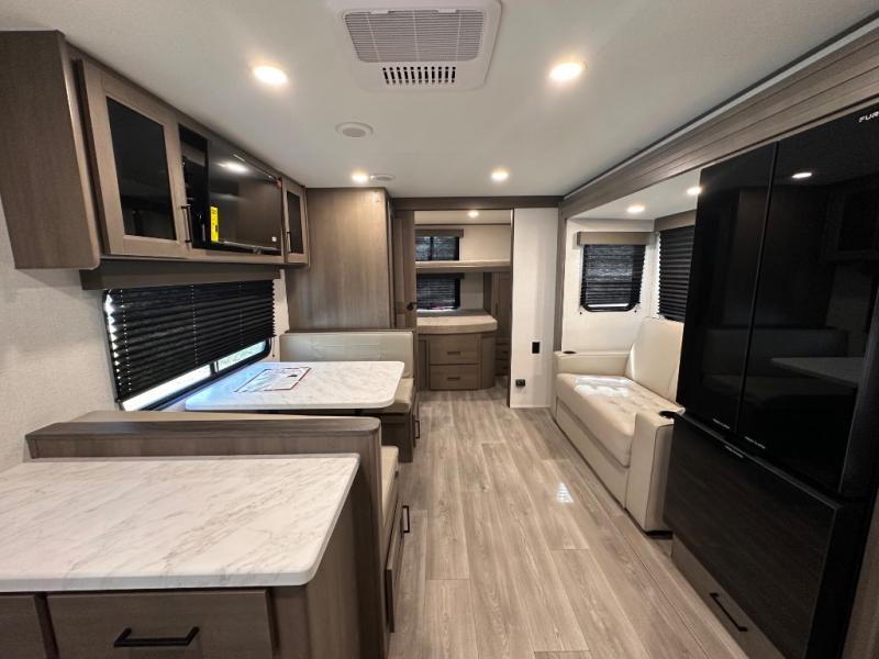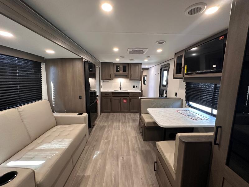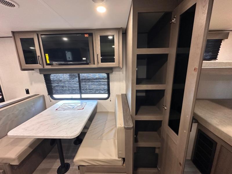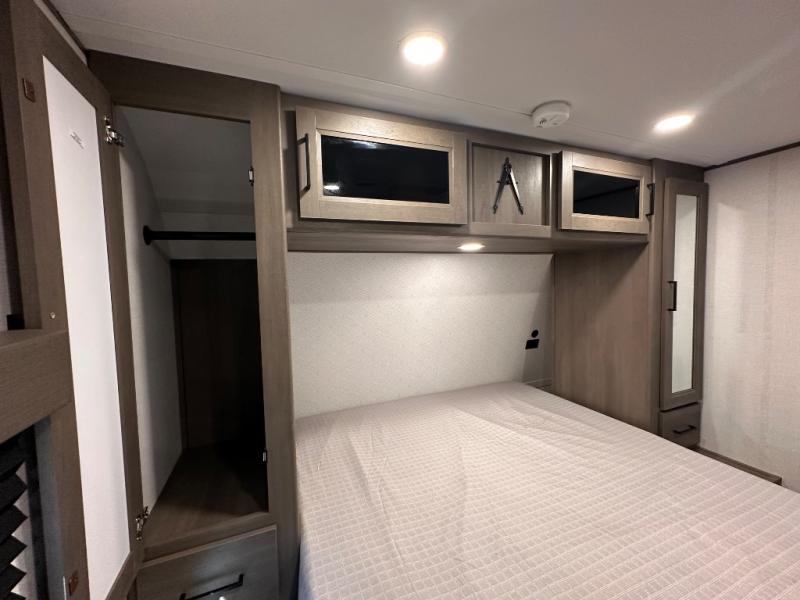 You're going to love every minute spent in this Transcend travel trailer! Your guests or the little ones will have the rear bunkhouse all to themselves that includes a residential full-size bed and two bunks, storage drawers, and TV prep if you want to add a television here. You'll enjoy your own space up front in the private bedroom with a queen bed, storage drawers, and TV prep here also. The combined kitchen and living area includes a sleeper sofa with an optional theater seating, a booth dinette where you can dine together, and a 32" TV for movie nights! The exterior is just as accommodating with its 20' awning, rear storage, plus exterior griddle and refrigerator!