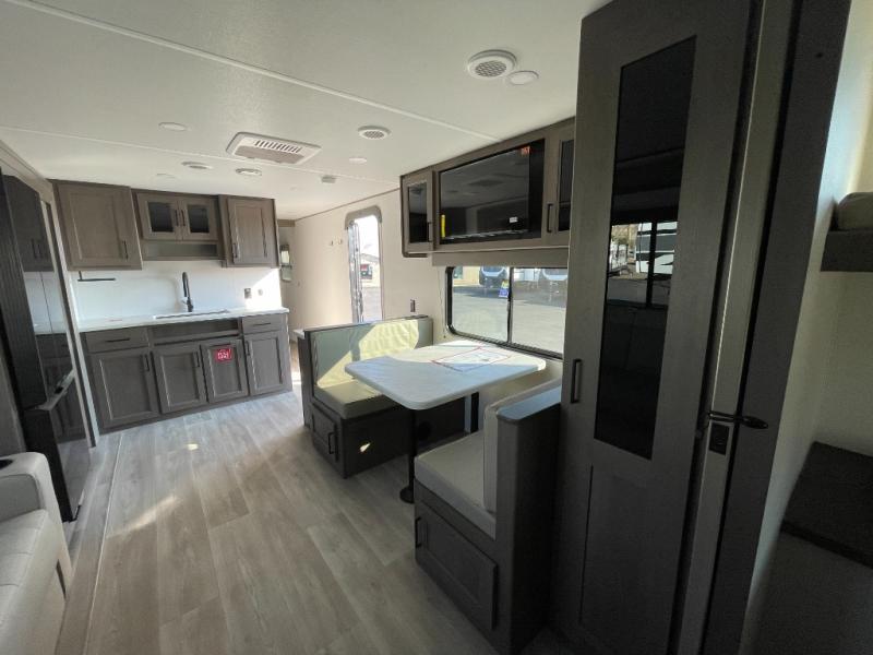 You're going to love every minute spent in this Transcend travel trailer! Your guests or the little ones will have the rear bunkhouse all to themselves that includes a residential full-size bed and two bunks, storage drawers, and TV prep if you want to add a television here. You'll enjoy your own space up front in the private bedroom with a queen bed, storage drawers, and TV prep here also. The combined kitchen and living area includes a sleeper sofa with an optional theater seating, a booth dinette where you can dine together, and a 32" TV for movie nights! The exterior is just as accommodating with its 20' awning, rear storage, plus exterior griddle and refrigerator!