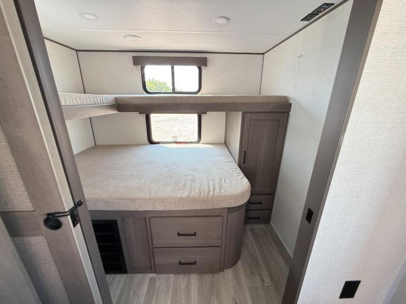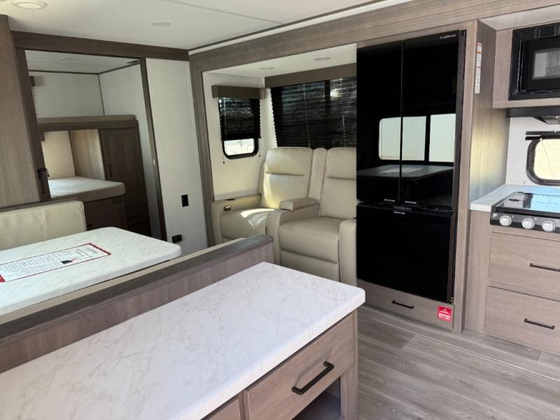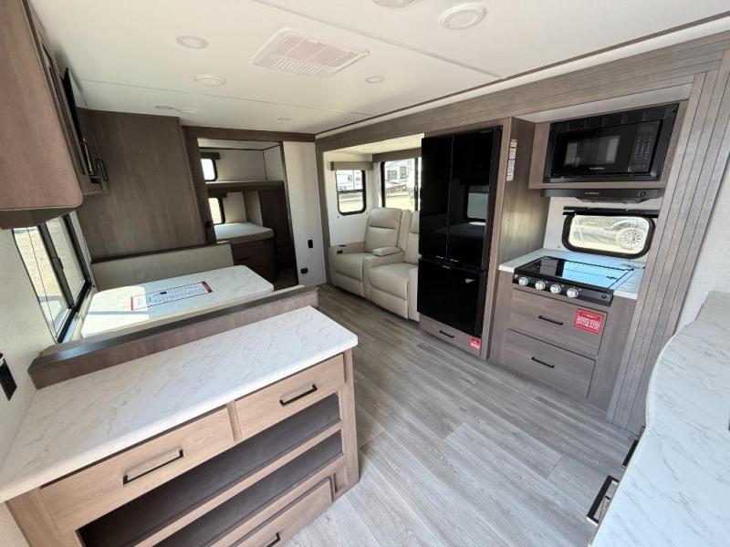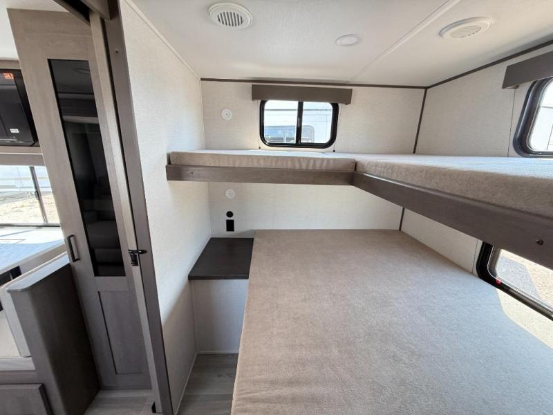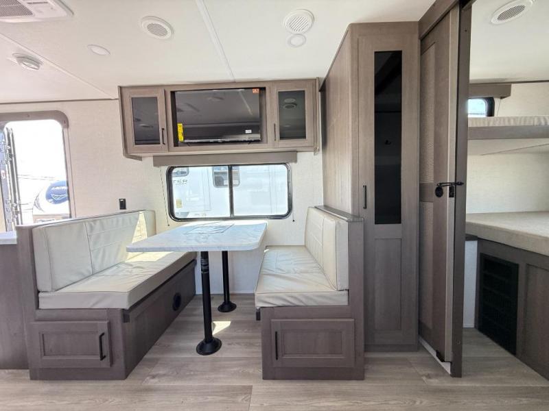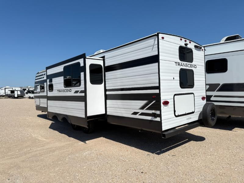 You're going to love every minute spent in this Transcend travel trailer! Your guests or the little ones will have the rear bunkhouse all to themselves that includes a residential full-size bed and two bunks, storage drawers, and TV prep if you want to add a television here. You'll enjoy your own space up front in the private bedroom with a queen bed, storage drawers, and TV prep here also. The combined kitchen and living area includes a sleeper sofa with an optional theater seating, a booth dinette where you can dine together, and a 32" TV for movie nights! The exterior is just as accommodating with its 20' awning, rear storage, plus exterior griddle and refrigerator!