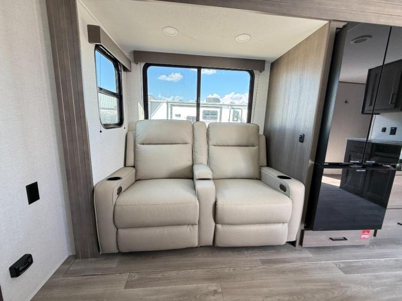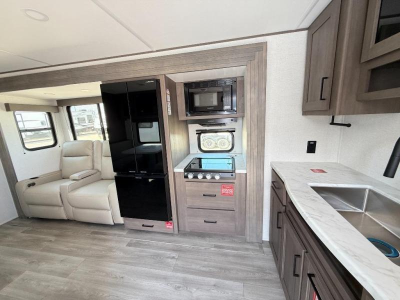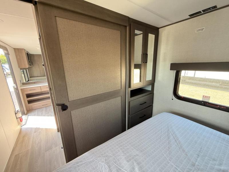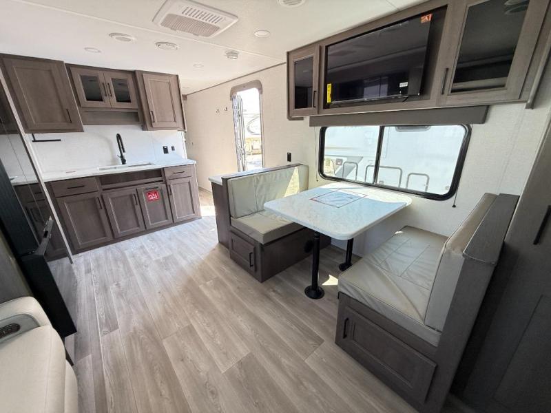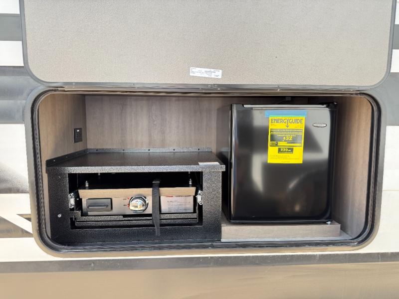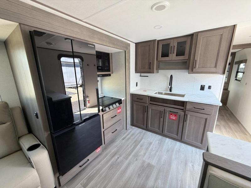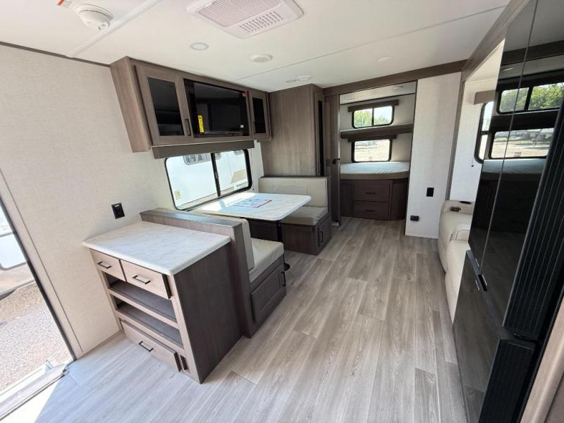 You're going to love every minute spent in this Transcend travel trailer! Your guests or the little ones will have the rear bunkhouse all to themselves that includes a residential full-size bed and two bunks, storage drawers, and TV prep if you want to add a television here. You'll enjoy your own space up front in the private bedroom with a queen bed, storage drawers, and TV prep here also. The combined kitchen and living area includes a sleeper sofa with an optional theater seating, a booth dinette where you can dine together, and a 32" TV for movie nights! The exterior is just as accommodating with its 20' awning, rear storage, plus exterior griddle and refrigerator!