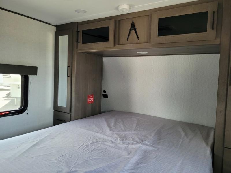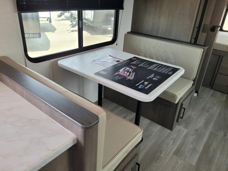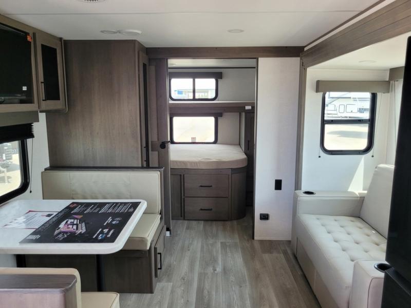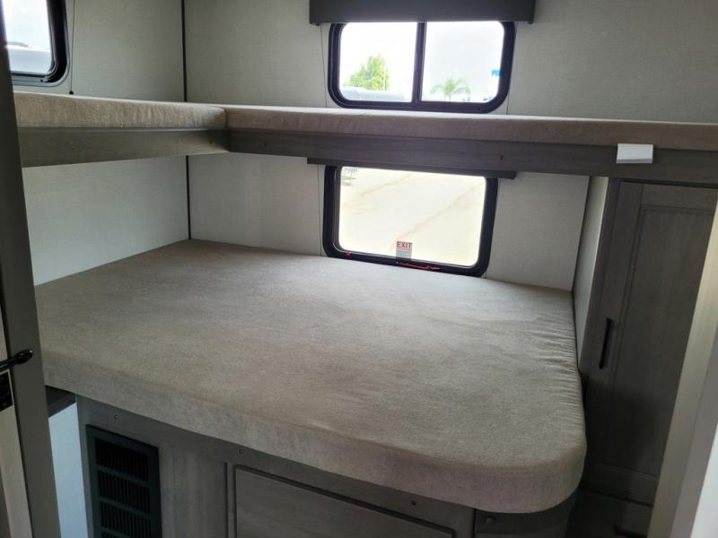 You're going to love every minute spent in this Transcend travel trailer! Your guests or the little ones will have the rear bunkhouse all to themselves that includes a residential full-size bed and two bunks, storage drawers, and TV prep if you want to add a television here. You'll enjoy your own space up front in the private bedroom with a queen bed, storage drawers, and TV prep here also. The combined kitchen and living area includes a sleeper sofa with an optional theater seating, a booth dinette where you can dine together, and a 32" TV for movie nights! The exterior is just as accommodating with its 20' awning, rear storage, plus exterior griddle and refrigerator!