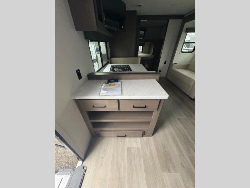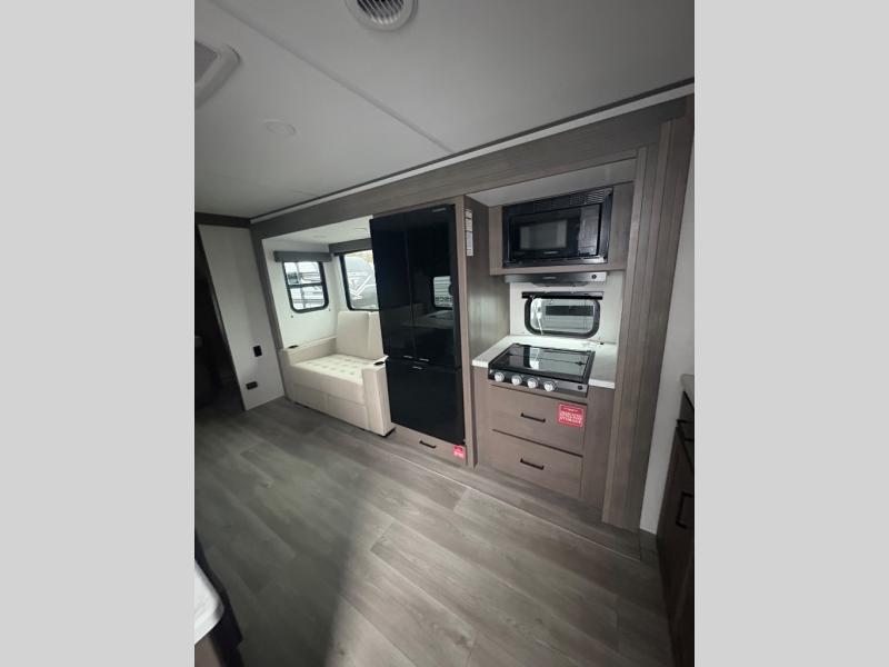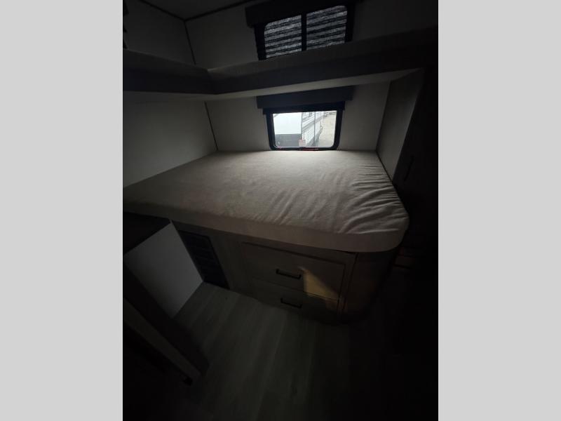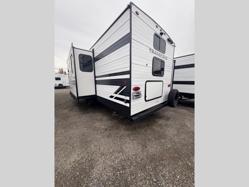 You're going to love every minute spent in this Transcend travel trailer! Your guests or the little ones will have the rear bunkhouse all to themselves that includes a residential full-size bed and two bunks, storage drawers, and TV prep if you want to add a television here. You'll enjoy your own space up front in the private bedroom with a queen bed, storage drawers, and TV prep here also. The combined kitchen and living area includes a sleeper sofa with an optional theater seating, a booth dinette where you can dine together, and a 32" TV for movie nights! The exterior is just as accommodating with its 20' awning, rear storage, plus exterior griddle and refrigerator!