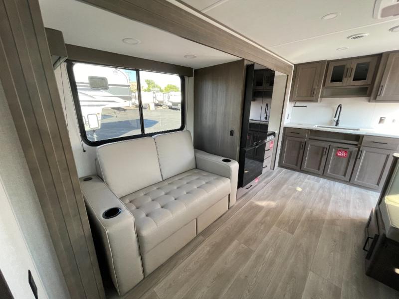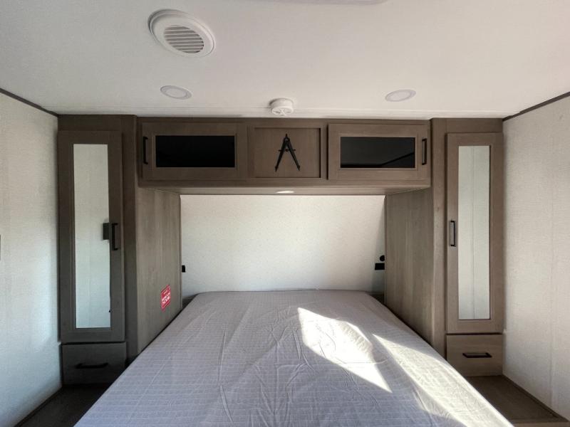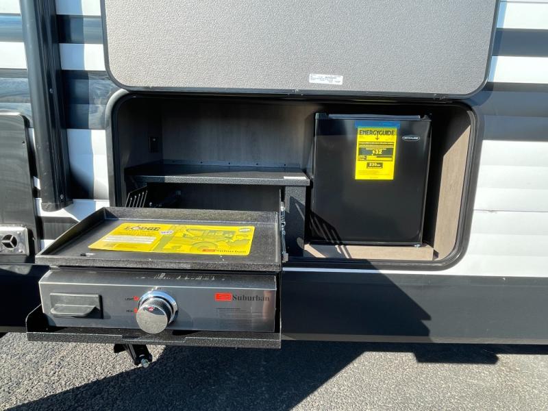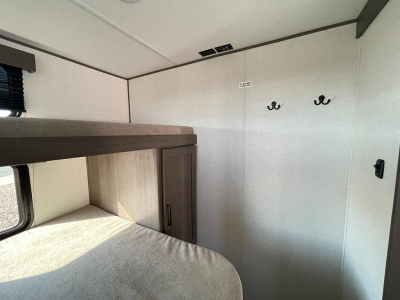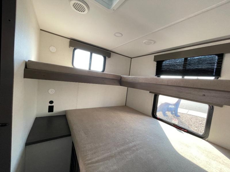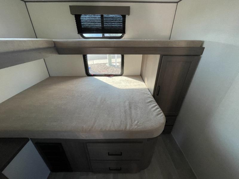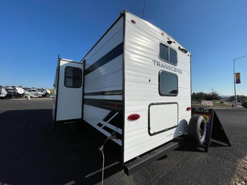 You're going to love every minute spent in this Transcend travel trailer! Your guests or the little ones will have the rear bunkhouse all to themselves that includes a residential full-size bed and two bunks, storage drawers, and TV prep if you want to add a television here. You'll enjoy your own space up front in the private bedroom with a queen bed, storage drawers, and TV prep here also. The combined kitchen and living area includes a sleeper sofa with an optional theater seating, a booth dinette where you can dine together, and a 32" TV for movie nights! The exterior is just as accommodating with its 20' awning, rear storage, plus exterior griddle and refrigerator!