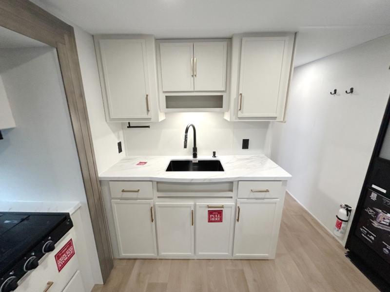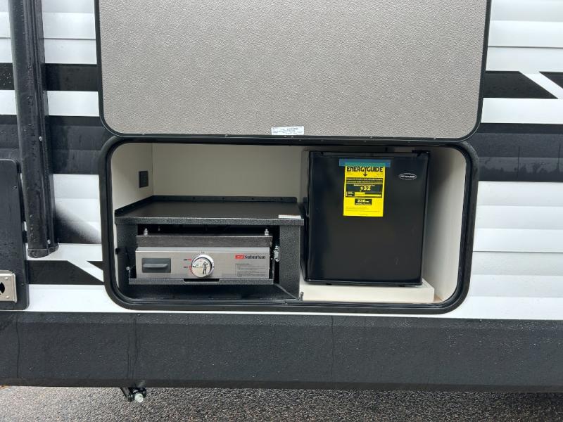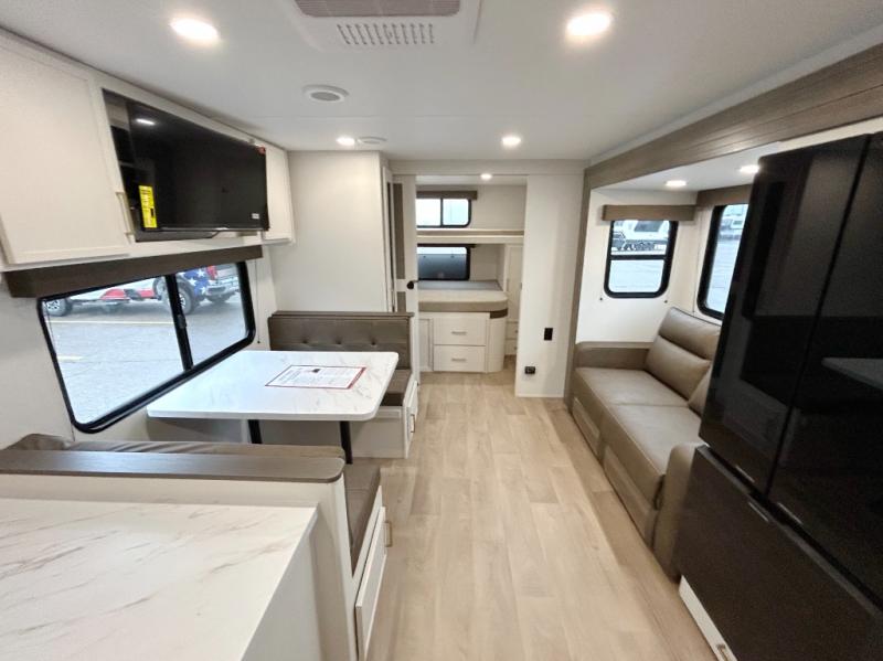 You're going to love every minute spent in this Transcend travel trailer! Your guests or the little ones will have the rear bunkhouse all to themselves that includes a residential full-size bed and two bunks, storage drawers, and TV prep if you want to add a television here. You'll enjoy your own space up front in the private bedroom with a queen bed, storage drawers, and TV prep here also. The combined kitchen and living area includes a sleeper sofa with an optional theater seating, a booth dinette where you can dine together, and a 32" TV for movie nights! The exterior is just as accommodating with its 20' awning, rear storage, plus exterior griddle and refrigerator!