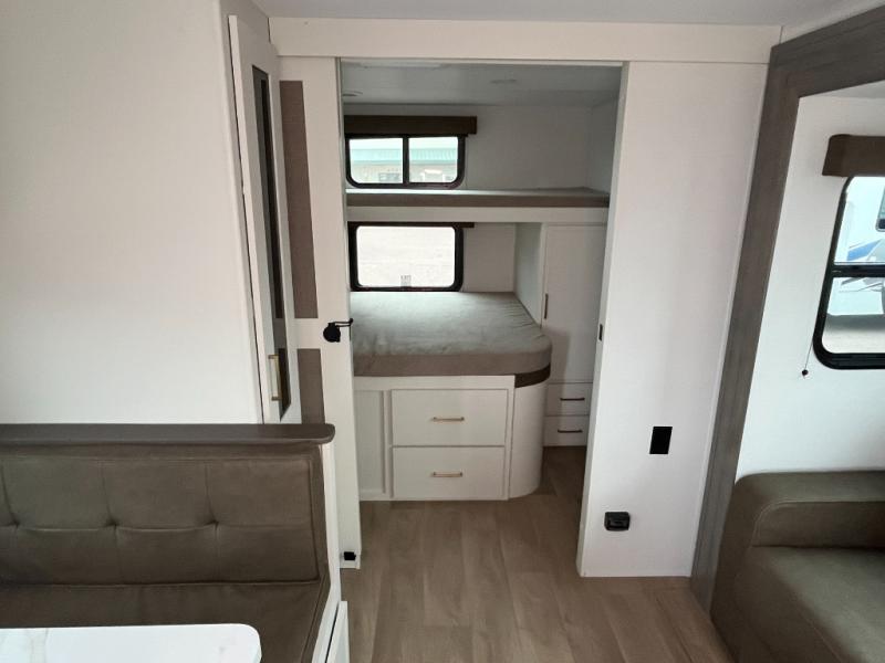 You're going to love every minute spent in this Transcend travel trailer! Your guests or the little ones will have the rear bunkhouse all to themselves that includes a residential full-size bed and two bunks, storage drawers, and TV prep if you want to add a television here. You'll enjoy your own space up front in the private bedroom with a queen bed, storage drawers, and TV prep here also. The combined kitchen and living area includes a sleeper sofa with an optional theater seating, a booth dinette where you can dine together, and a 32" TV for movie nights! The exterior is just as accommodating with its 20' awning, rear storage, plus exterior griddle and refrigerator!