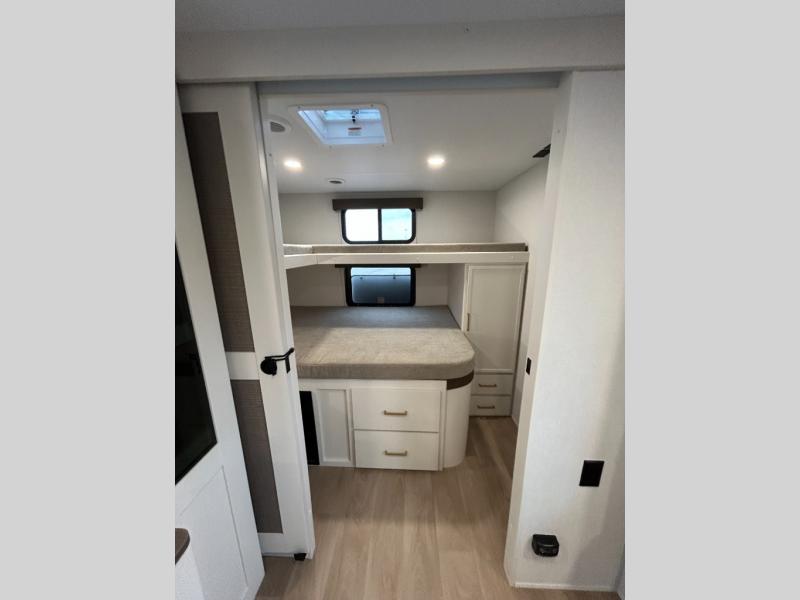 You're going to love every minute spent in this Transcend travel trailer! Your guests or the little ones will have the rear bunkhouse all to themselves that includes a residential full-size bed and two bunks, storage drawers, and TV prep if you want to add a television here. You'll enjoy your own space up front in the private bedroom with a queen bed, storage drawers, and TV prep here also. The combined kitchen and living area includes a sleeper sofa with an optional theater seating, a booth dinette where you can dine together, and a 32" TV for movie nights! The exterior is just as accommodating with its 20' awning, rear storage, plus exterior griddle and refrigerator!