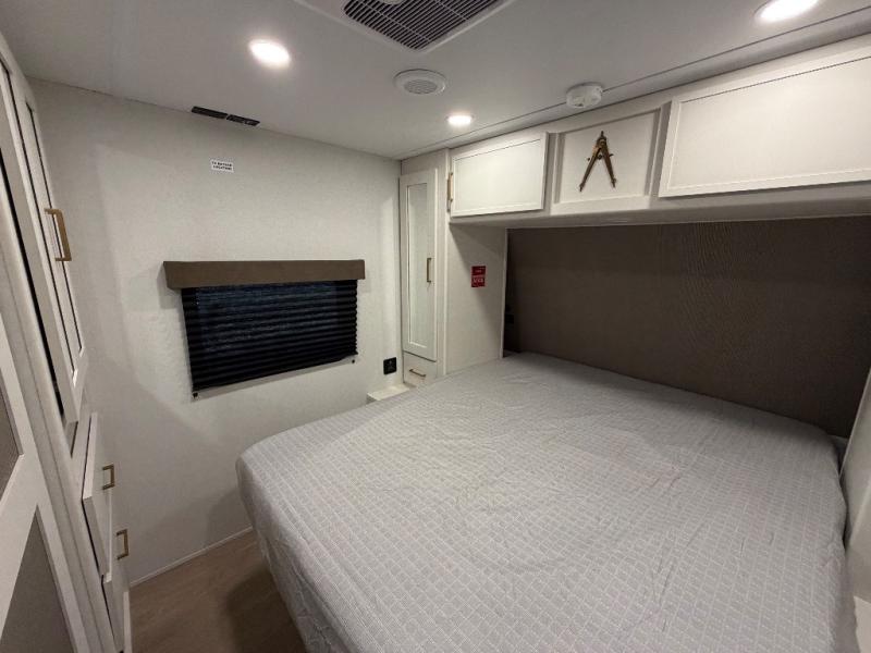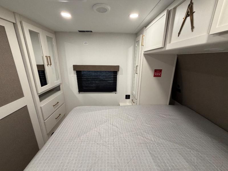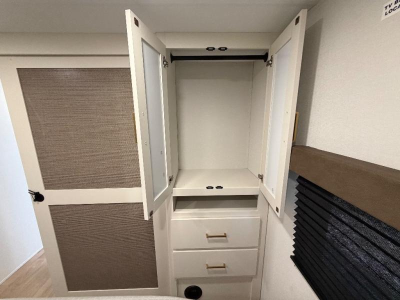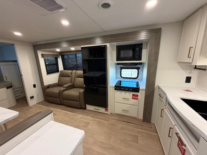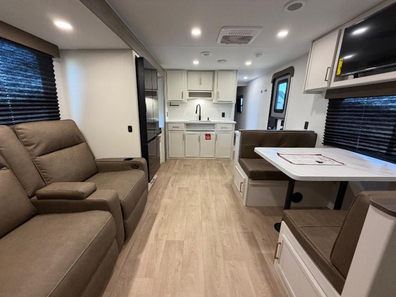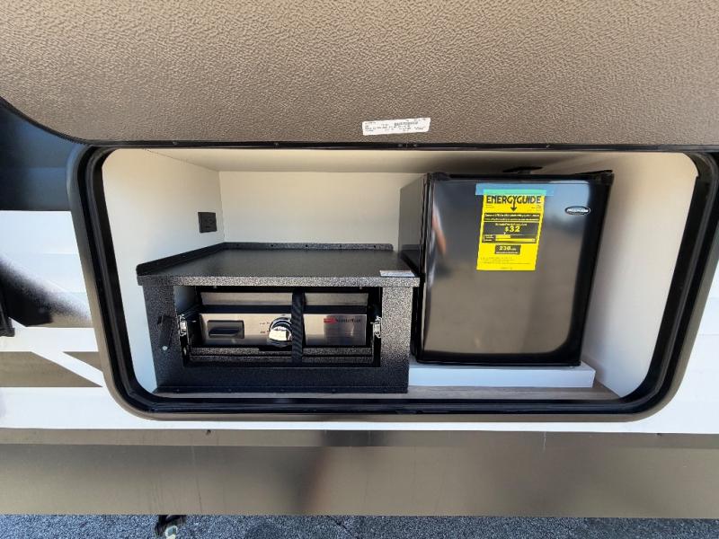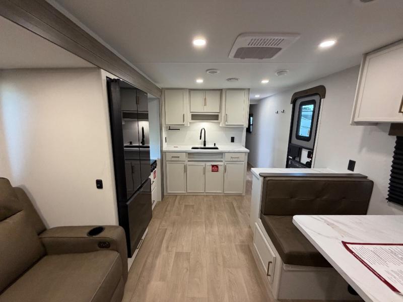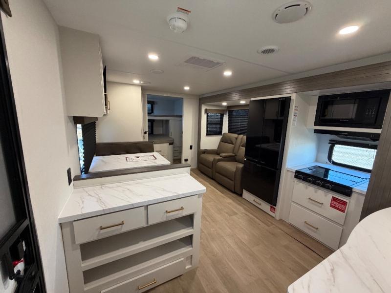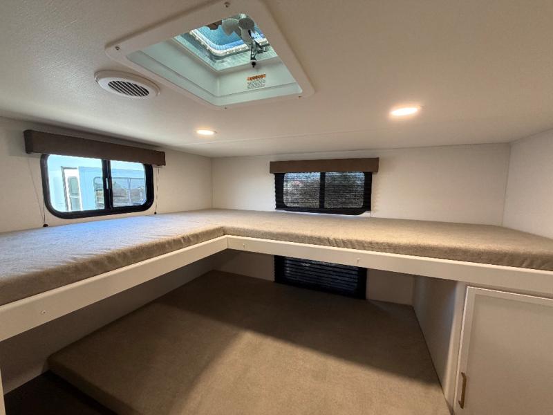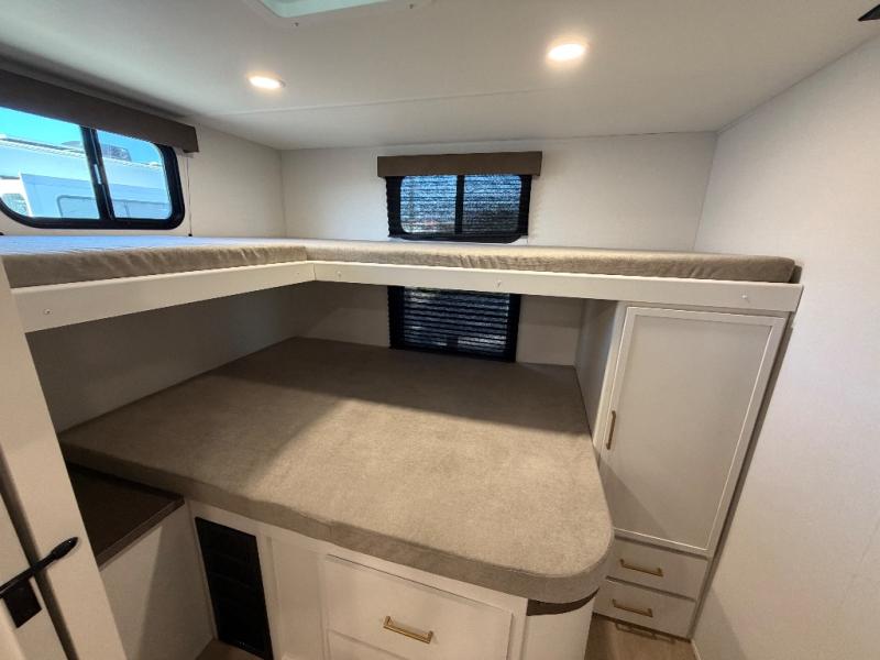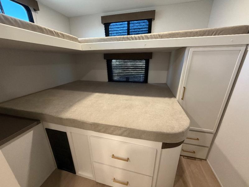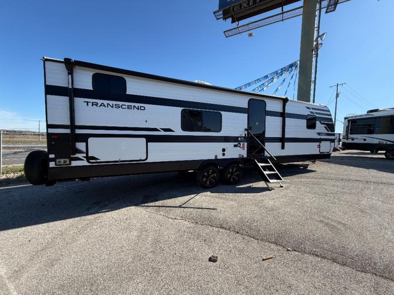You're going to love every minute spent in this Transcend travel trailer! Your guests or the little ones will have the rear bunkhouse all to themselves that includes a residential full-size bed and two bunks, storage drawers, and TV prep if you want to add a television here. You'll enjoy your own space up front in the private bedroom with a queen bed, storage drawers, and TV prep here also. The combined kitchen and living area includes a sleeper sofa with an optional theater seating, a booth dinette where you can dine together, and a 32" TV for movie nights! The exterior is just as accommodating with its 20' awning, rear storage, plus exterior griddle and refrigerator!
