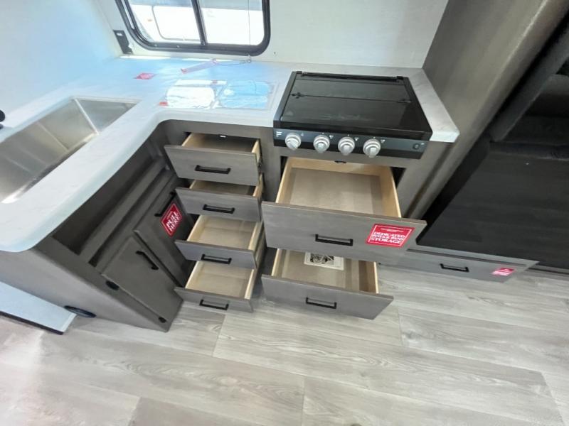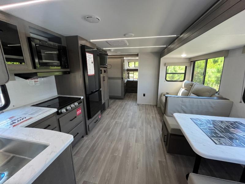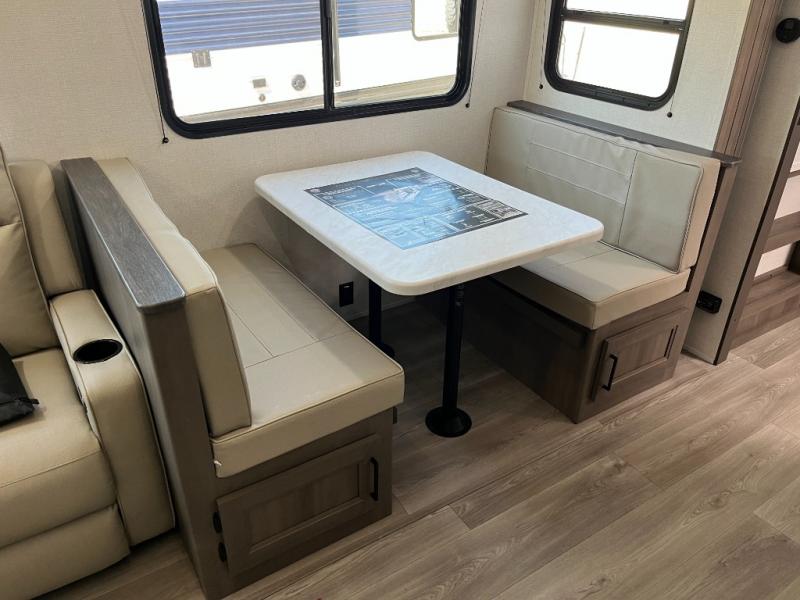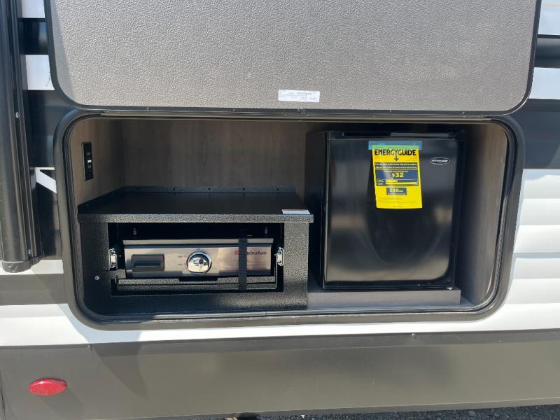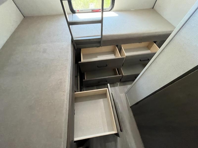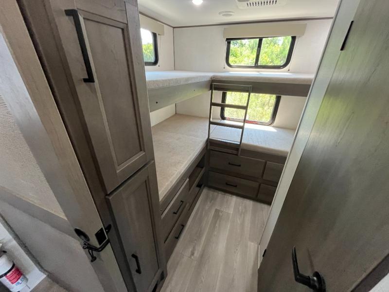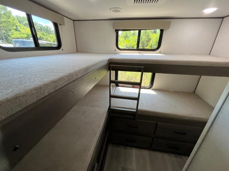 Your crew of nine will love camping in this spacious travel trailer! There are four bunks in the rear bunkhouse, along with storage drawers, and a convenient half bath! A full walk-thru bath will create a front master bedroom you are sure to love, especially with its queen bed, wardrobe storage, and private exterior entry door! The main living area will be a favorite place to hang out with its booth dinette, sleeper sofa and 32" TV. If the weather is nice, you may just find yourselves outdoors since there is an exterior griddle and 1.7 cu. ft. refrigerator!