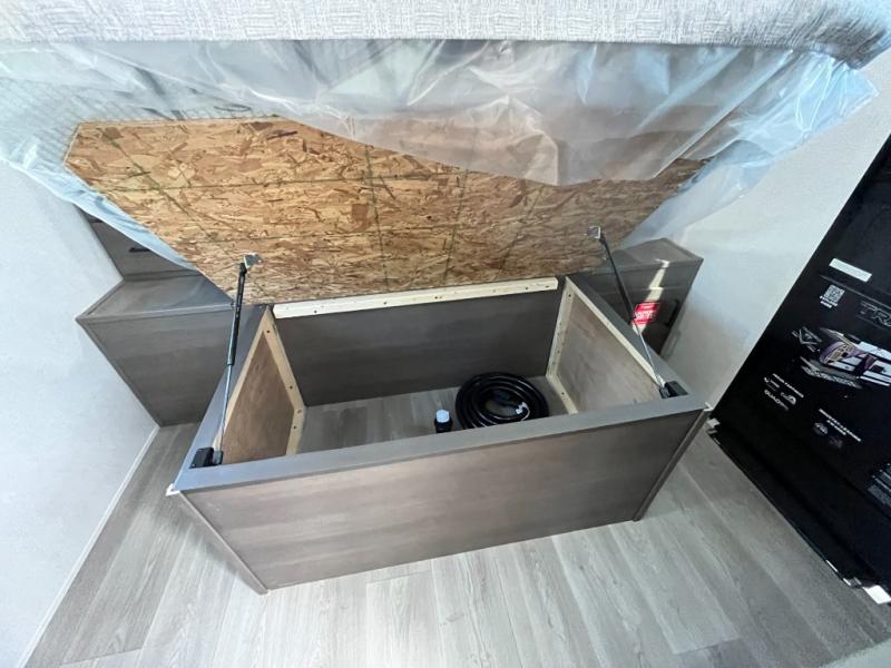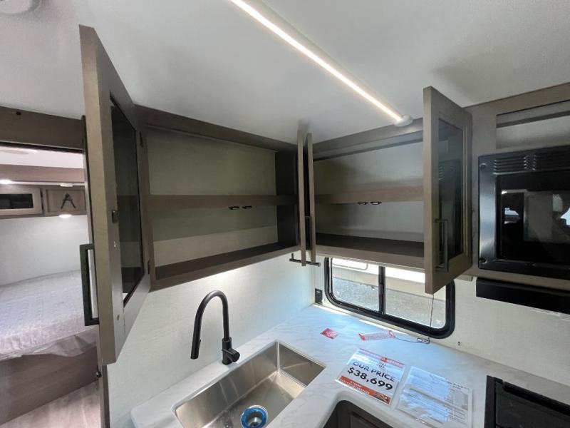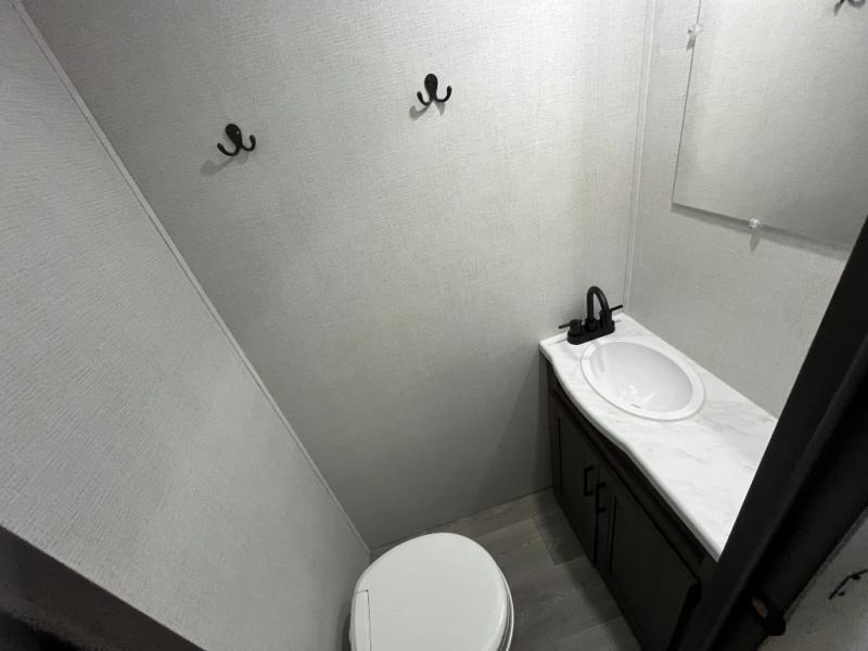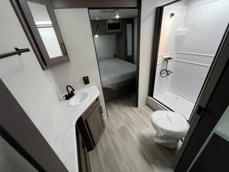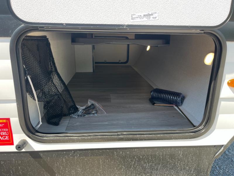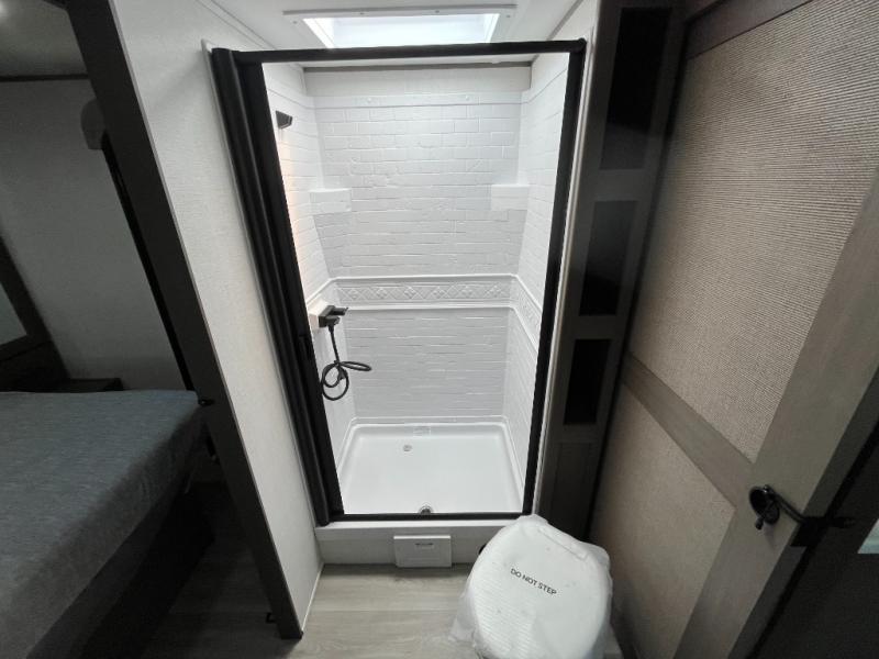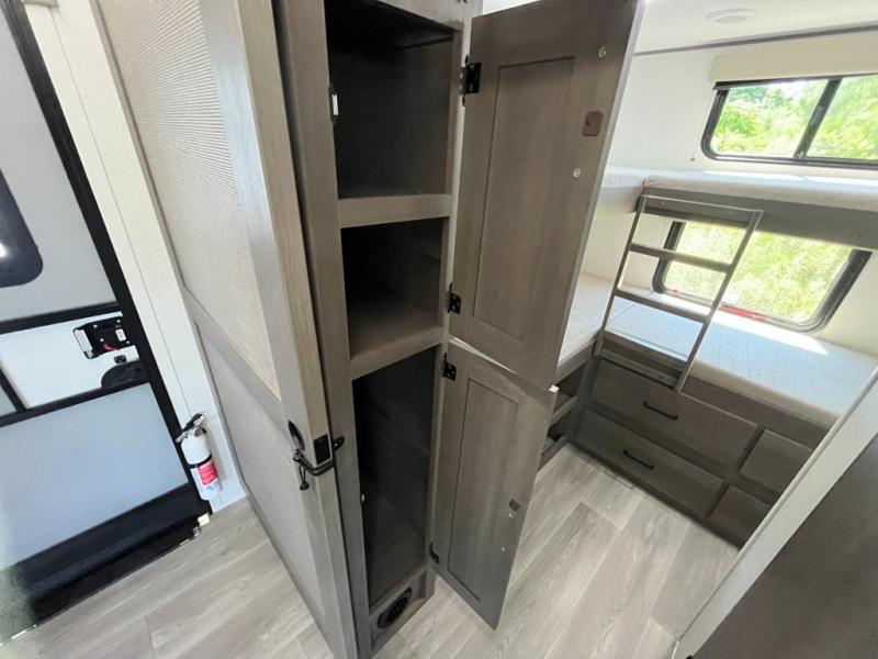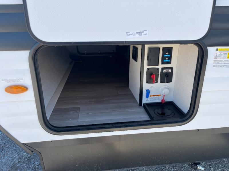 Your crew of nine will love camping in this spacious travel trailer! There are four bunks in the rear bunkhouse, along with storage drawers, and a convenient half bath! A full walk-thru bath will create a front master bedroom you are sure to love, especially with its queen bed, wardrobe storage, and private exterior entry door! The main living area will be a favorite place to hang out with its booth dinette, sleeper sofa and 32" TV. If the weather is nice, you may just find yourselves outdoors since there is an exterior griddle and 1.7 cu. ft. refrigerator!