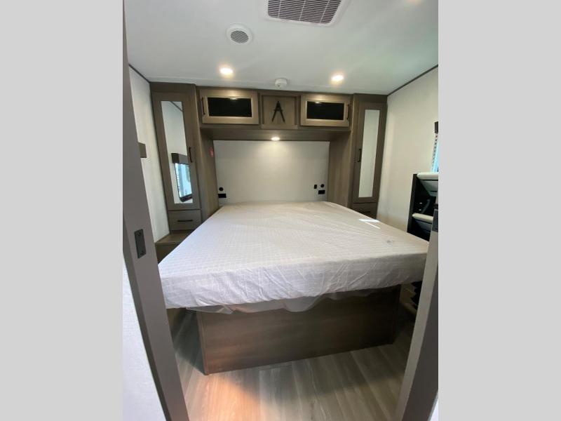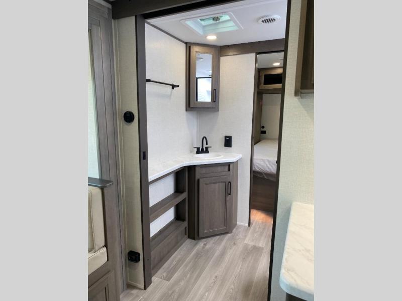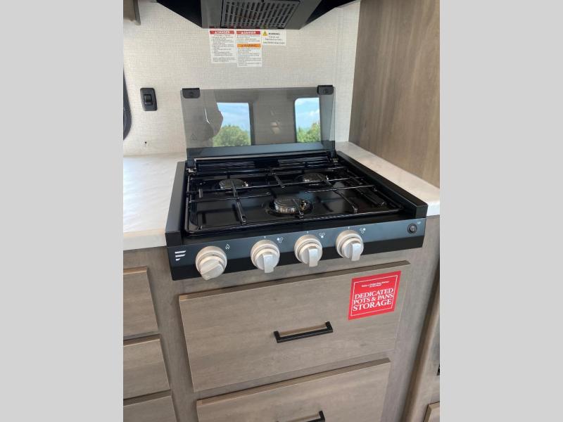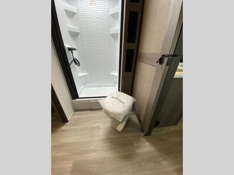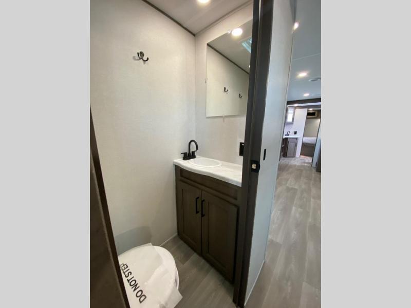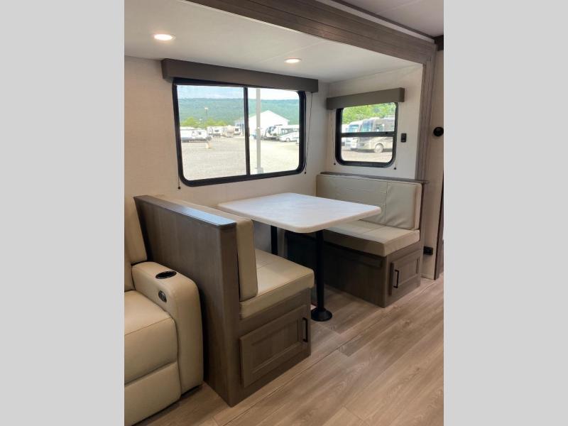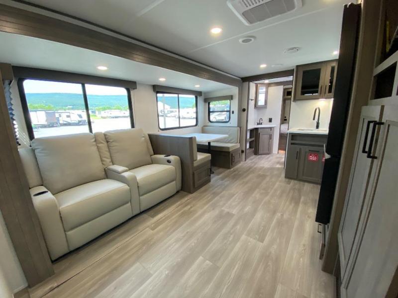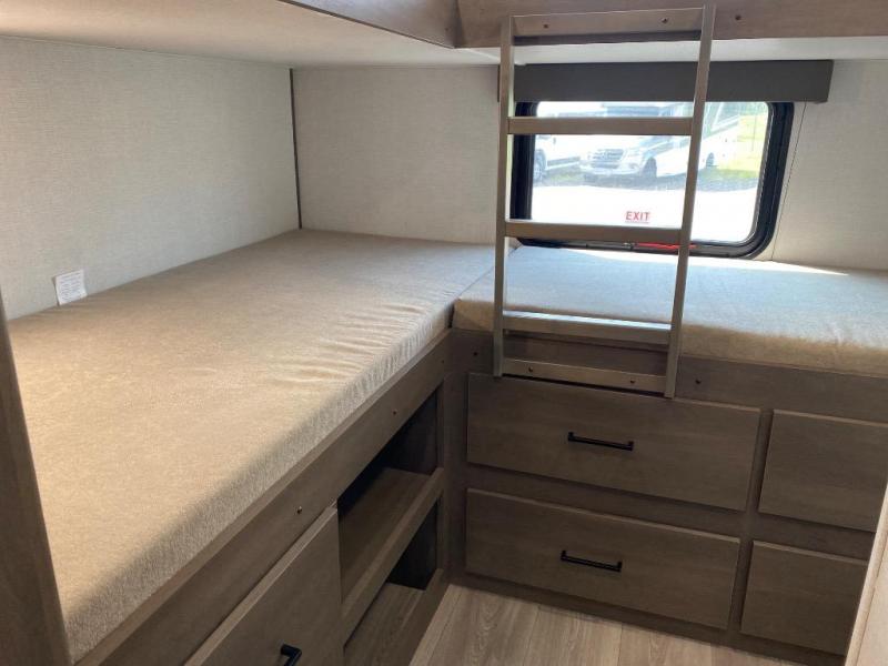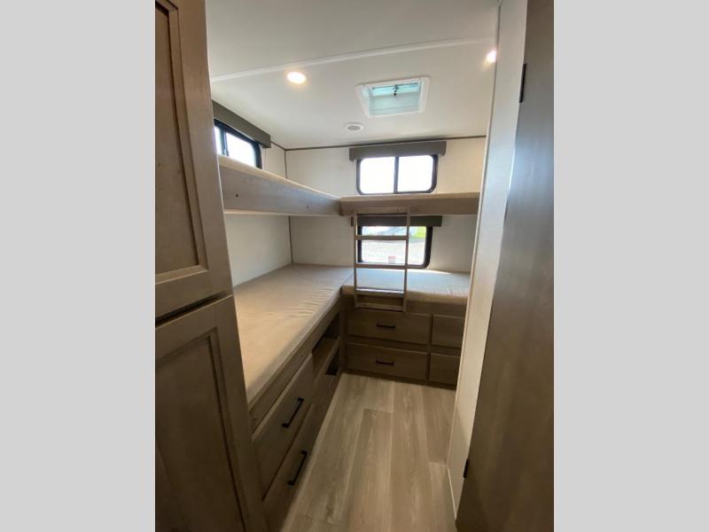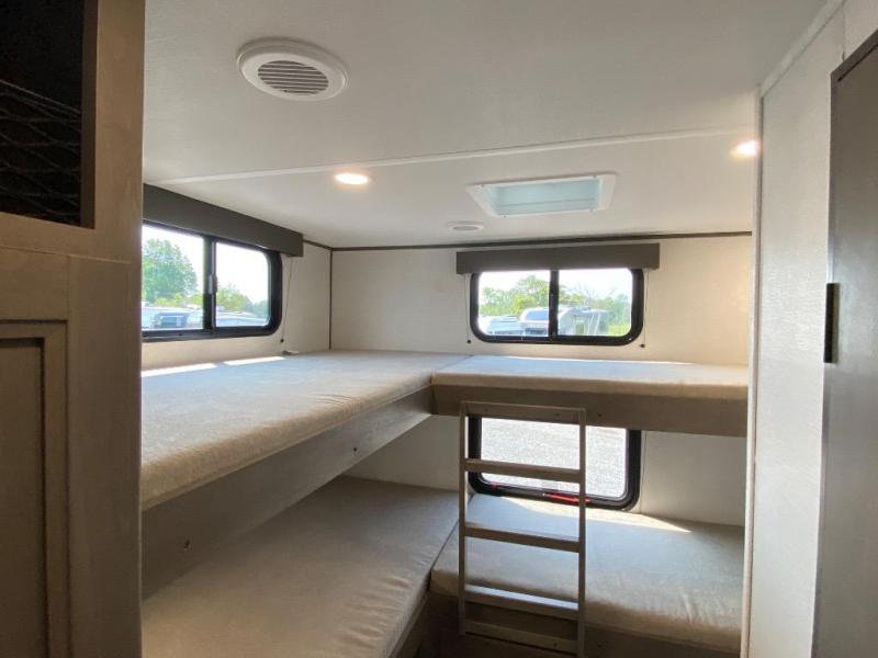 Your crew of nine will love camping in this spacious travel trailer! There are four bunks in the rear bunkhouse, along with storage drawers, and a convenient half bath! A full walk-thru bath will create a front master bedroom you are sure to love, especially with its queen bed, wardrobe storage, and private exterior entry door! The main living area will be a favorite place to hang out with its booth dinette, sleeper sofa and 32" TV. If the weather is nice, you may just find yourselves outdoors since there is an exterior griddle and 1.7 cu. ft. refrigerator!