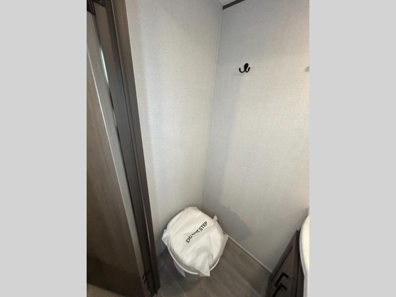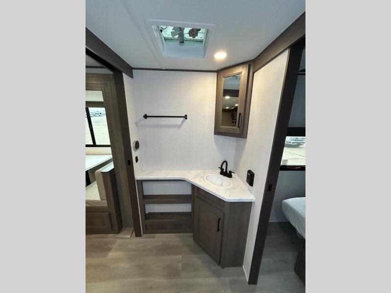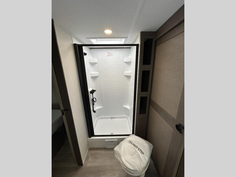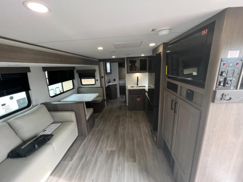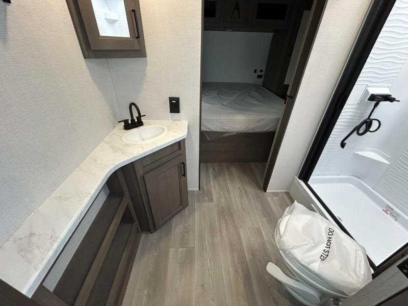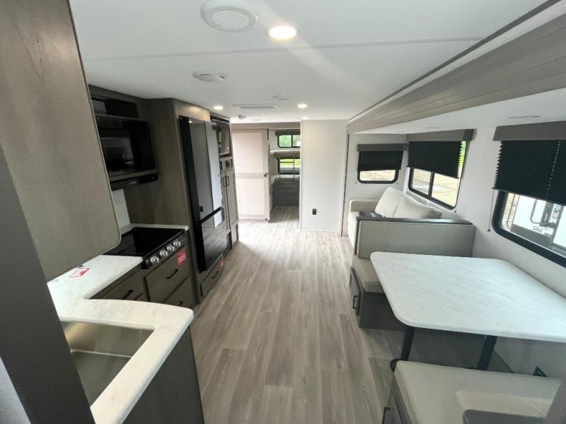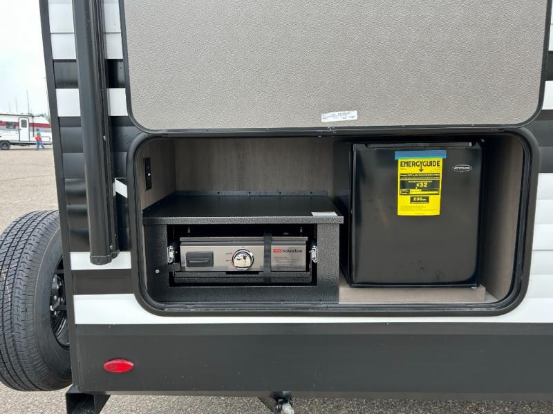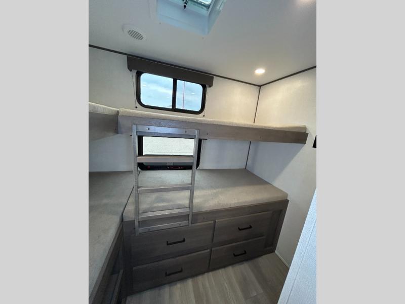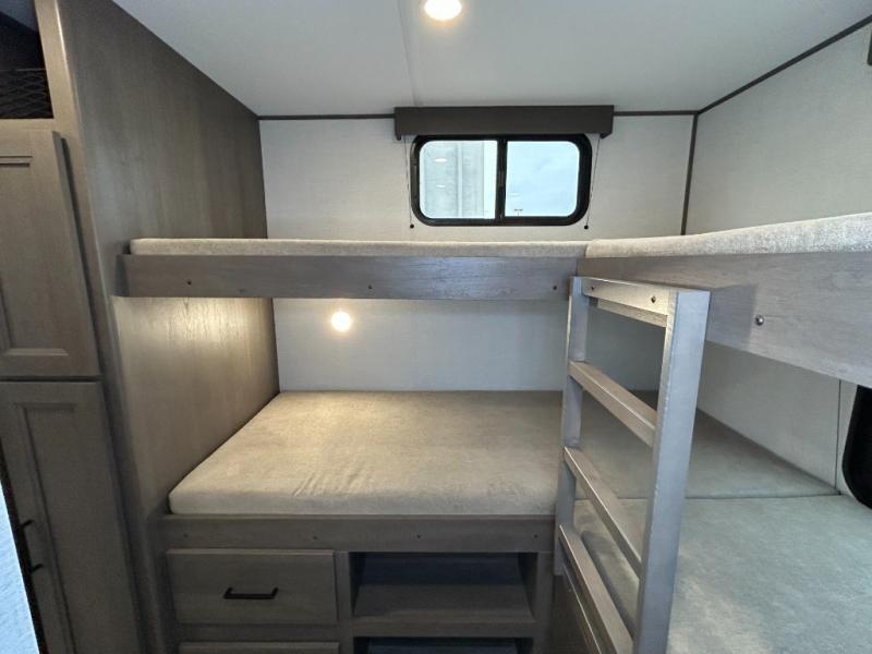 Your crew of nine will love camping in this spacious travel trailer! There are four bunks in the rear bunkhouse, along with storage drawers, and a convenient half bath! A full walk-thru bath will create a front master bedroom you are sure to love, especially with its queen bed, wardrobe storage, and private exterior entry door! The main living area will be a favorite place to hang out with its booth dinette, sleeper sofa and 32" TV. If the weather is nice, you may just find yourselves outdoors since there is an exterior griddle and 1.7 cu. ft. refrigerator!