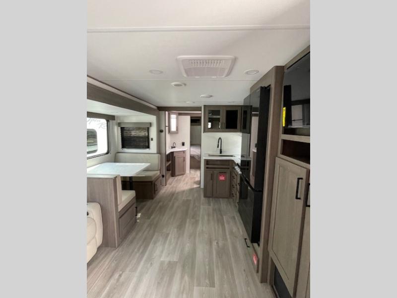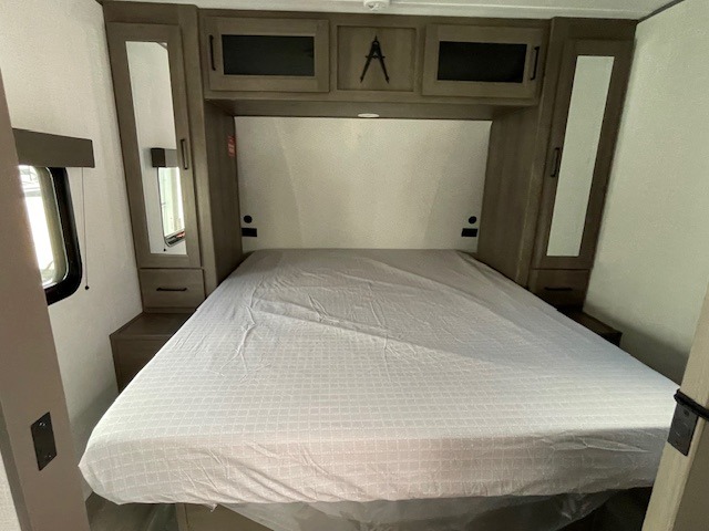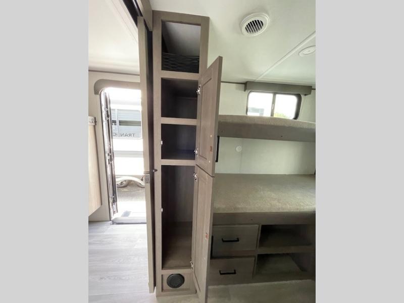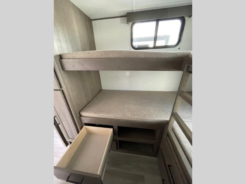 Your crew of nine will love camping in this spacious travel trailer! There are four bunks in the rear bunkhouse, along with storage drawers, and a convenient half bath! A full walk-thru bath will create a front master bedroom you are sure to love, especially with its queen bed, wardrobe storage, and private exterior entry door! The main living area will be a favorite place to hang out with its booth dinette, sleeper sofa and 32" TV. If the weather is nice, you may just find yourselves outdoors since there is an exterior griddle and 1.7 cu. ft. refrigerator!