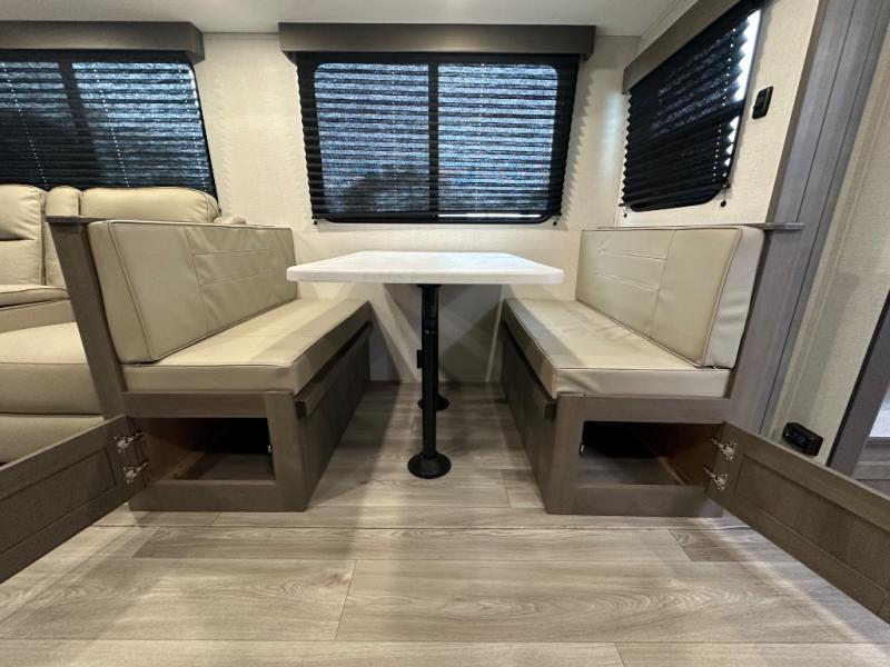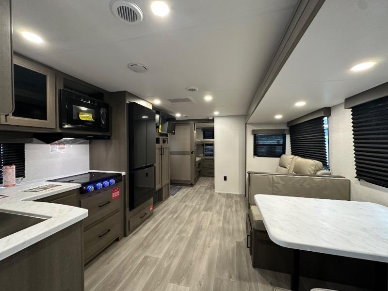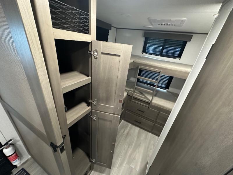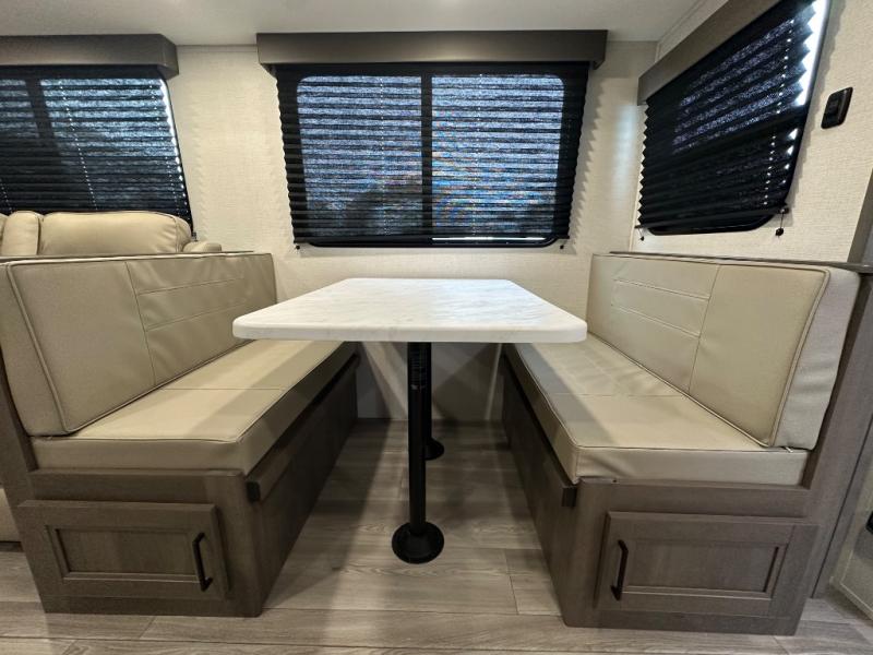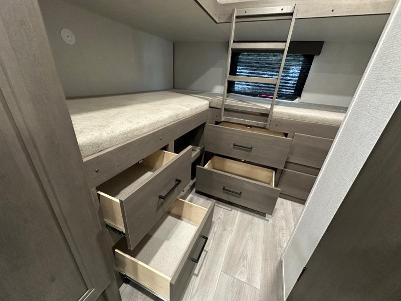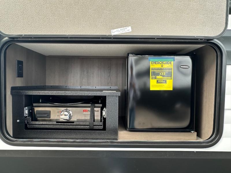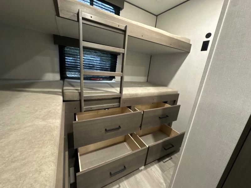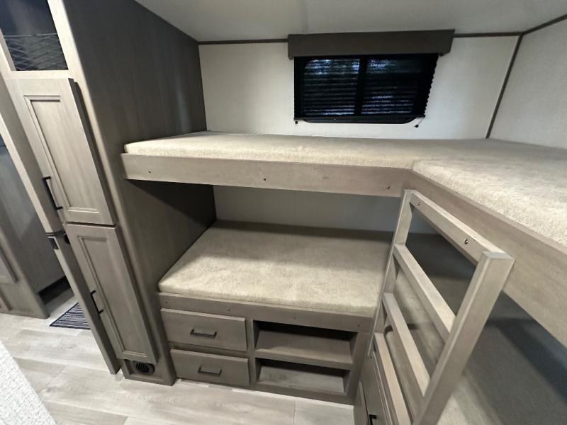 Your crew of nine will love camping in this spacious travel trailer! There are four bunks in the rear bunkhouse, along with storage drawers, and a convenient half bath! A full walk-thru bath will create a front master bedroom you are sure to love, especially with its queen bed, wardrobe storage, and private exterior entry door! The main living area will be a favorite place to hang out with its booth dinette, sleeper sofa and 32" TV. If the weather is nice, you may just find yourselves outdoors since there is an exterior griddle and 1.7 cu. ft. refrigerator!