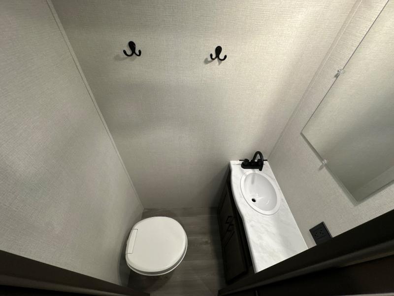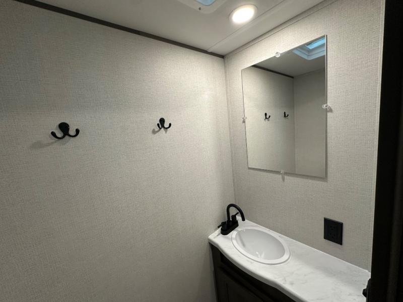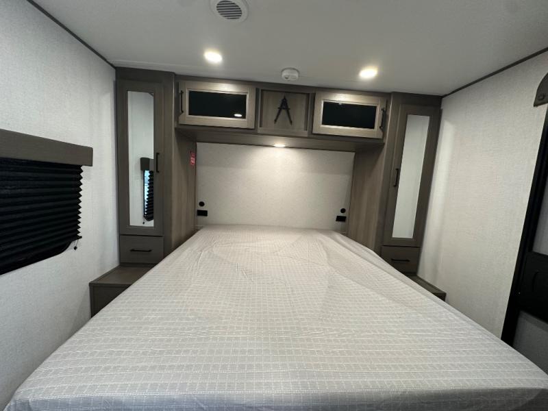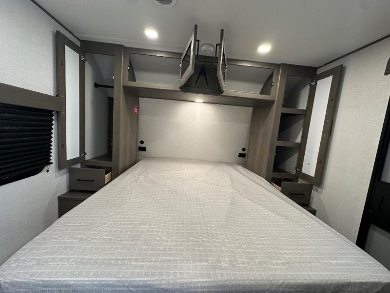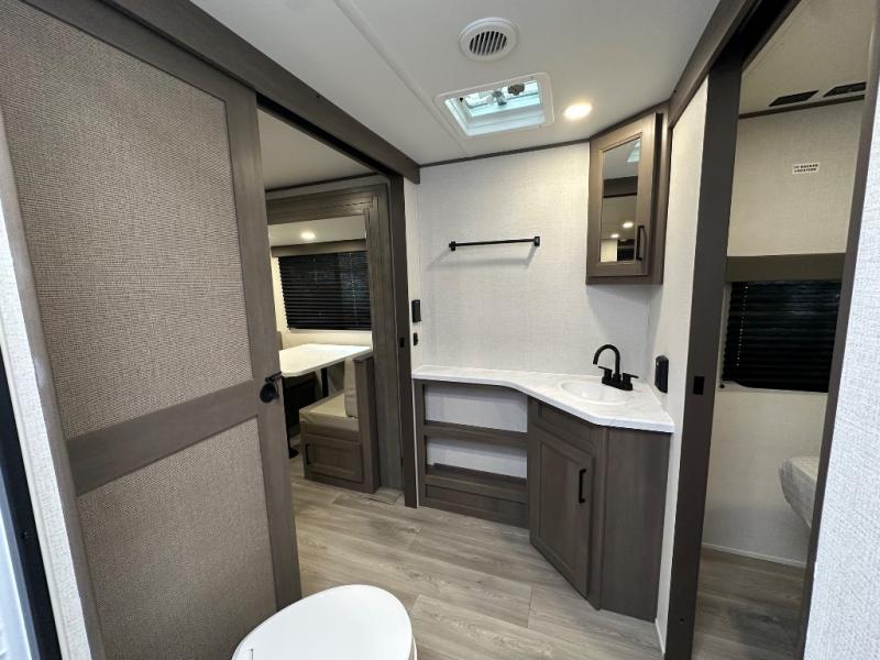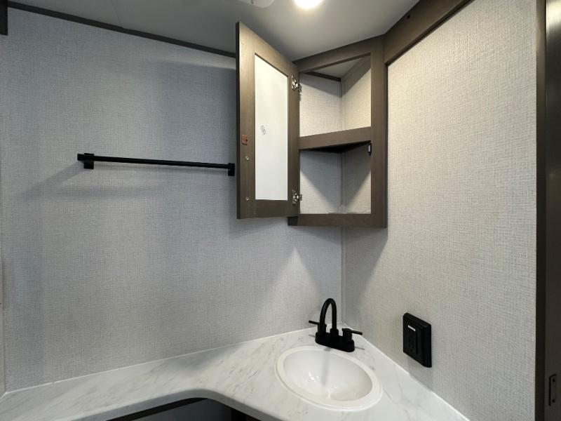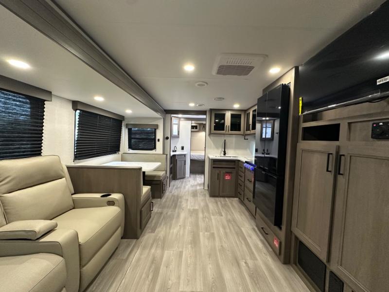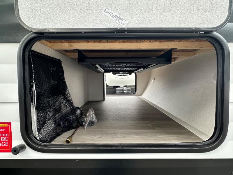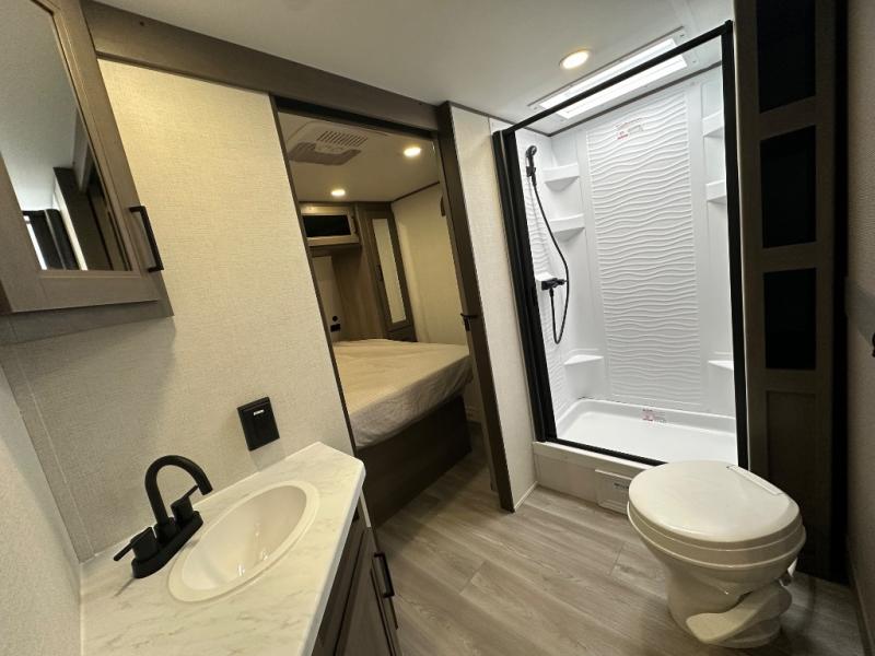 Your crew of nine will love camping in this spacious travel trailer! There are four bunks in the rear bunkhouse, along with storage drawers, and a convenient half bath! A full walk-thru bath will create a front master bedroom you are sure to love, especially with its queen bed, wardrobe storage, and private exterior entry door! The main living area will be a favorite place to hang out with its booth dinette, sleeper sofa and 32" TV. If the weather is nice, you may just find yourselves outdoors since there is an exterior griddle and 1.7 cu. ft. refrigerator!