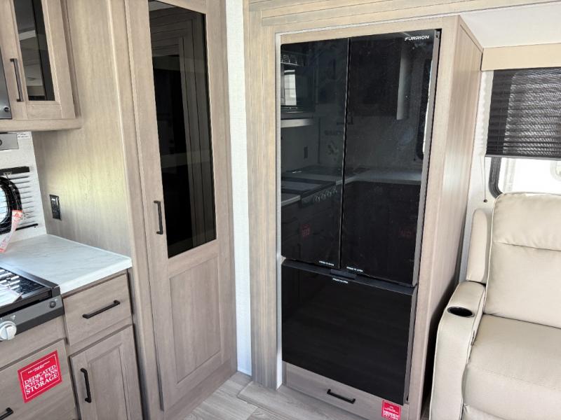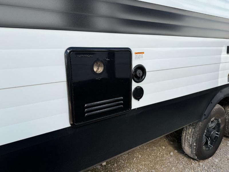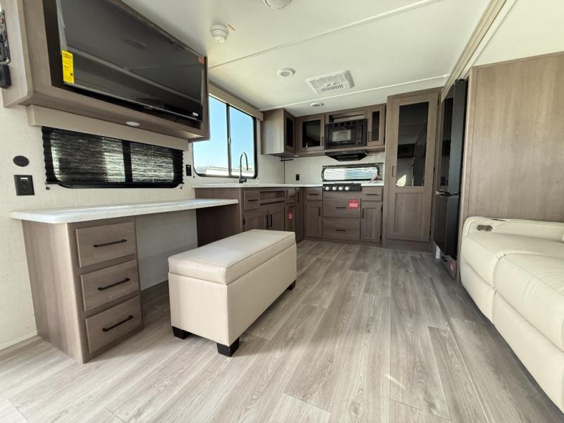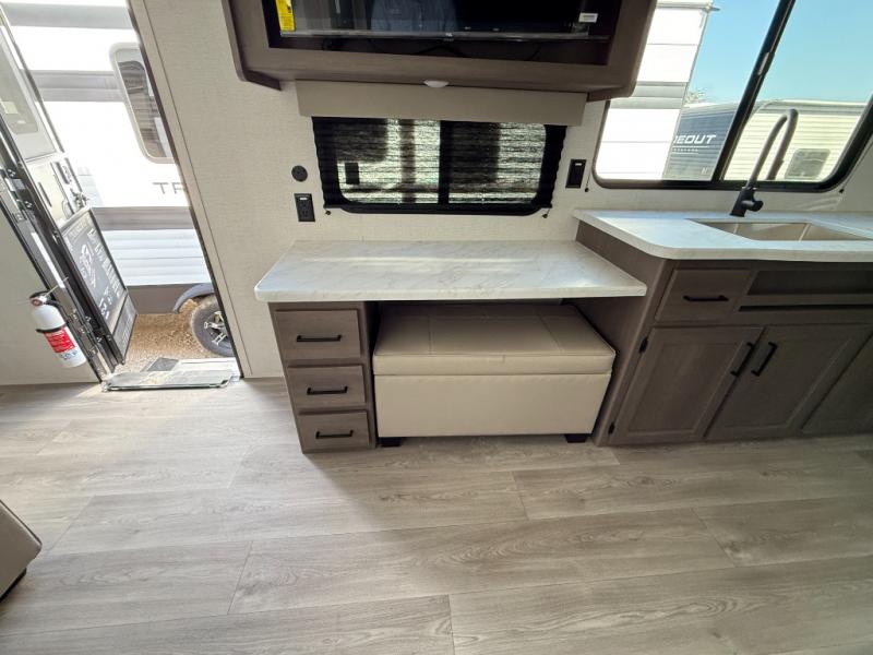 If you're looking for a cozy travel trailer for two, this is the one! You can sleep soundly each night on the king bed slide out, and you'll find plenty of storage in the front wardrobe. There is even washer and dryer prep if you choose to add those appliances. After you've freshened up in the full bath with a walk-in shower, you can head to the rear kitchen to make breakfast. There is ample counter space here, along with a three burner range and an air fryer/convection microwave, plus a pull-out trash can for easy clean up. The breakfast nook provides a fun place to dine together, and if you're needing additional sleeping space you can switch it out for the optional sleeper sofa. A theater seating slide also provides tons of comfort, especially since it's in perfect view of the 32" TV! This model also includes an exterior griddle with a 1.7 cu. ft. refrigerator, protected by the 21' power awning so you can cook in the shade!