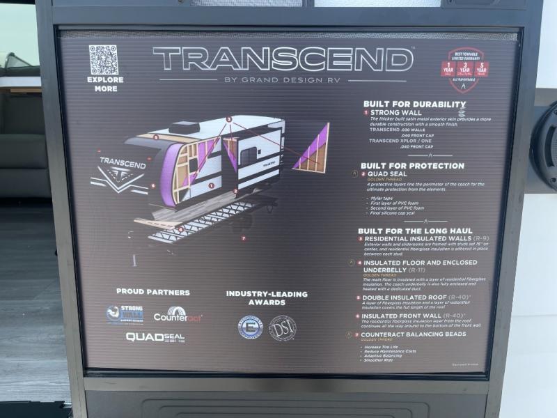 With any Transcend travel trailer by Grand Design, you will enjoy upscale appointments and convenient amenities to make each camping experience one to remember! The Quad Seal technology, residential insulated walls, plus heated and enclosed underbelly with suspended tanks make these units solid and durable. There is a black automotive glass door outside, along with a Safe-T-Rail assist on the main entry door, backup camera prep, and a universal docking station. JBL interior and exterior speakers plus a JBL head unit will let you listen to your favorite tunes as you visit under the power awning with LED strip lights. Inside, you'll enjoy multiple outlets to keep your gadgets charged, thermoformed and seamless countertops, and a 6' 6" interior height so you won't feel closed in. The Solar Prep Package will allow you to enjoy off-grid capabilities with a 200W solar panel, which is wired for up to 600W, a 30 AMP Bluetooth solar controller, a 2000W inverter prep, and more!