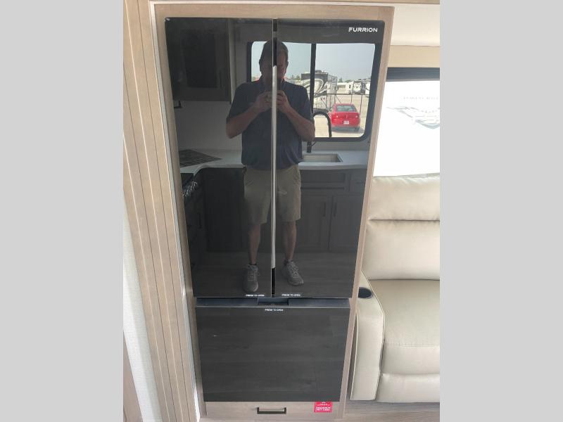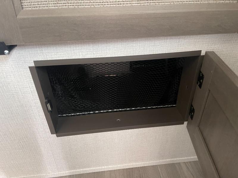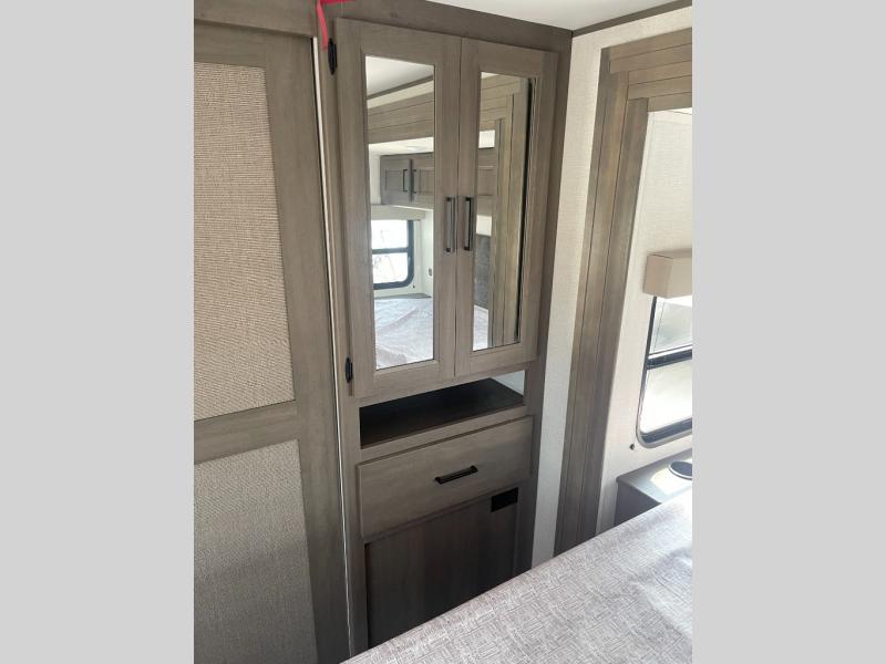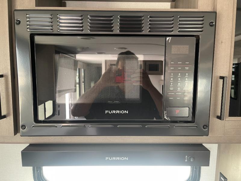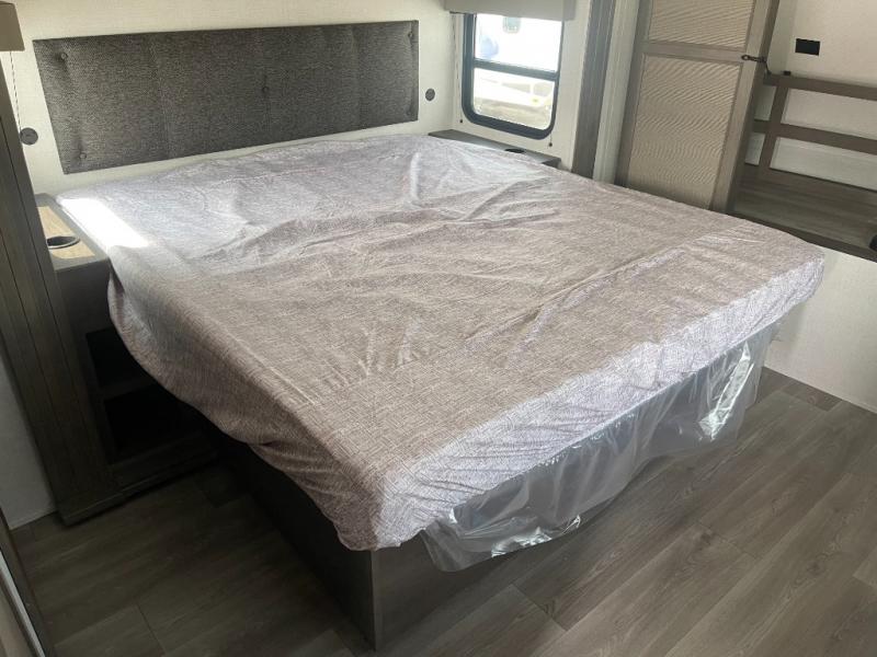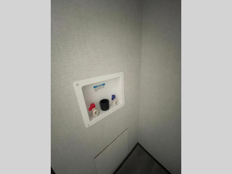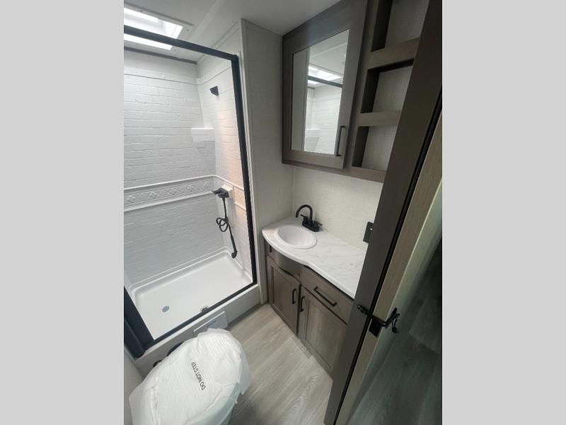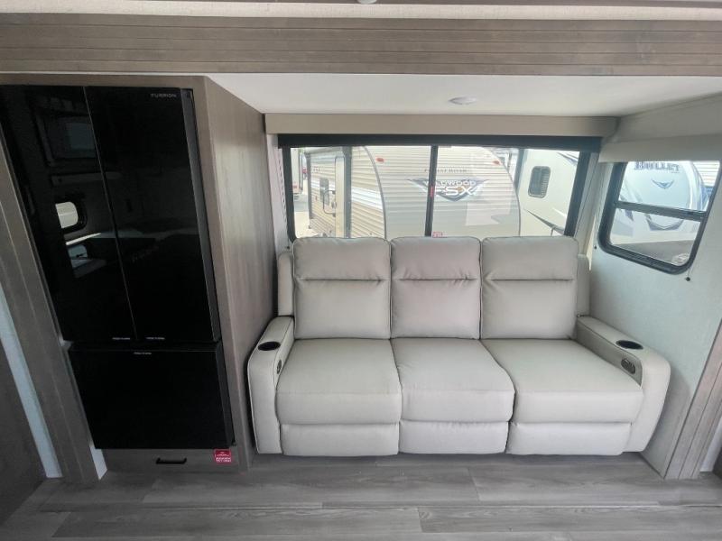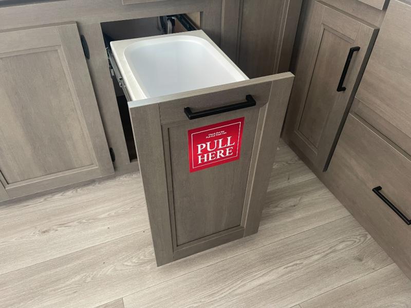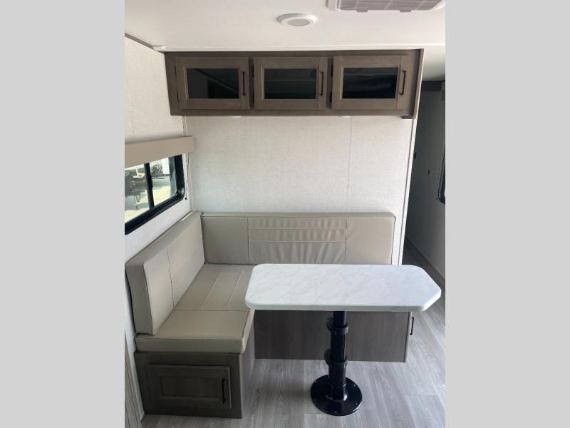 If you're looking for a cozy travel trailer for two, this is the one! You can sleep soundly each night on the king bed slide out, and you'll find plenty of storage in the front wardrobe. There is even washer and dryer prep if you choose to add those appliances. After you've freshened up in the full bath with a walk-in shower, you can head to the rear kitchen to make breakfast. There is ample counter space here, along with a three burner range and an air fryer/convection microwave, plus a pull-out trash can for easy clean up. The breakfast nook provides a fun place to dine together, and if you're needing additional sleeping space you can switch it out for the optional sleeper sofa. A theater seating slide also provides tons of comfort, especially since it's in perfect view of the 32" TV! This model also includes an exterior griddle with a 1.7 cu. ft. refrigerator, protected by the 21' power awning so you can cook in the shade!