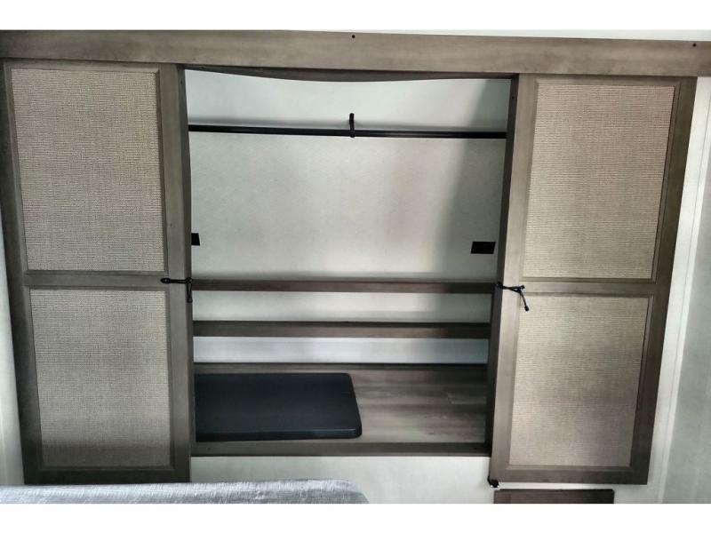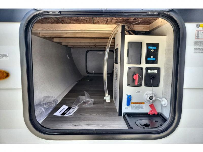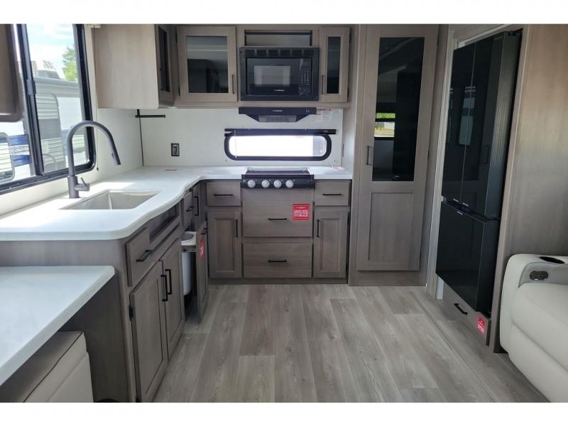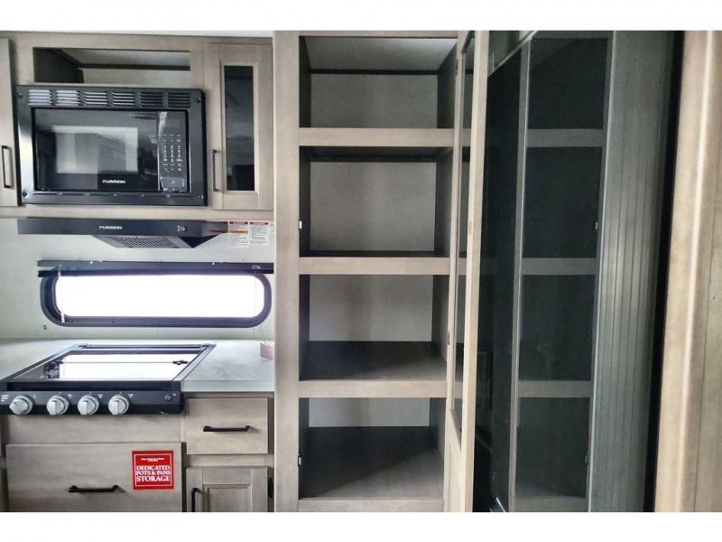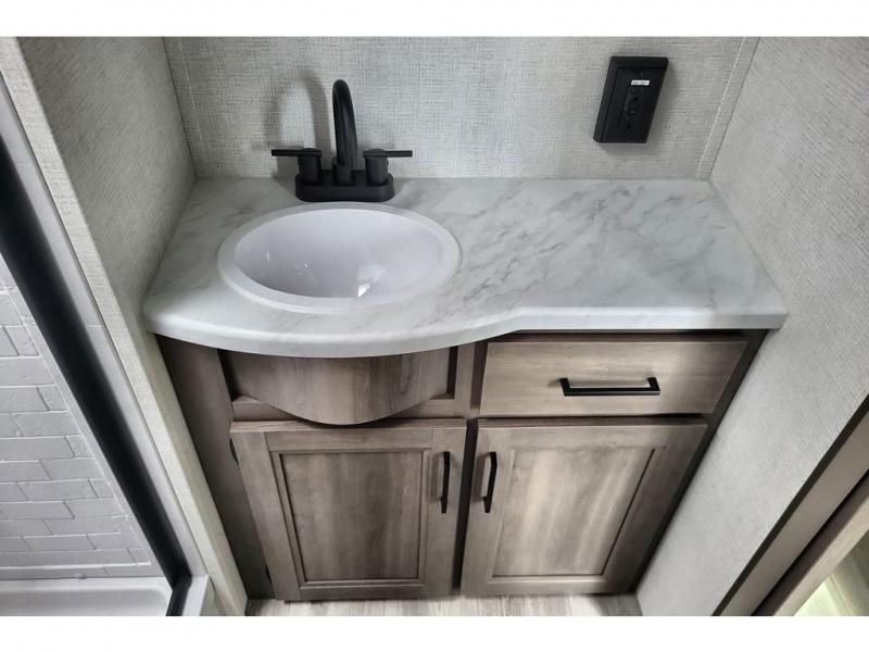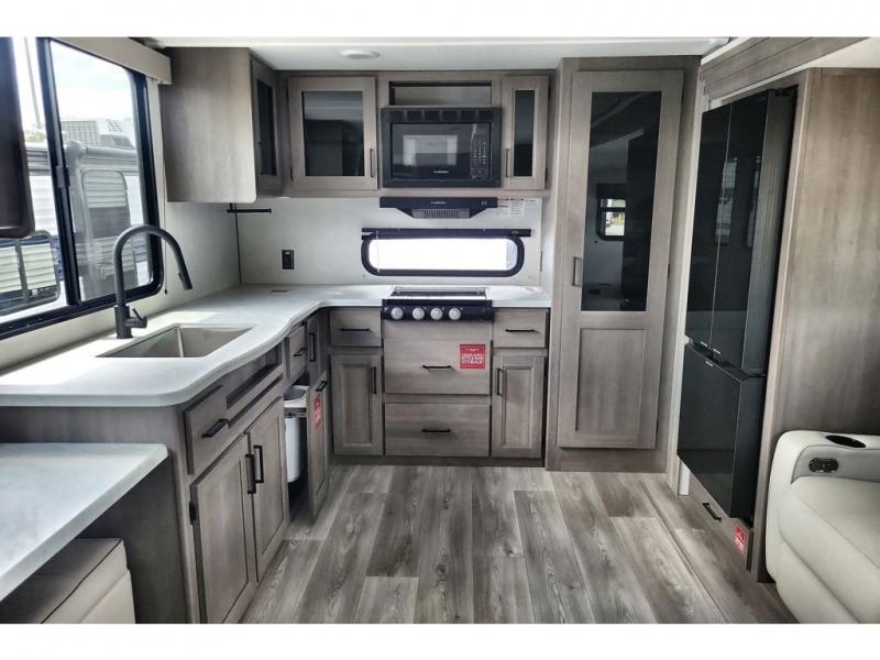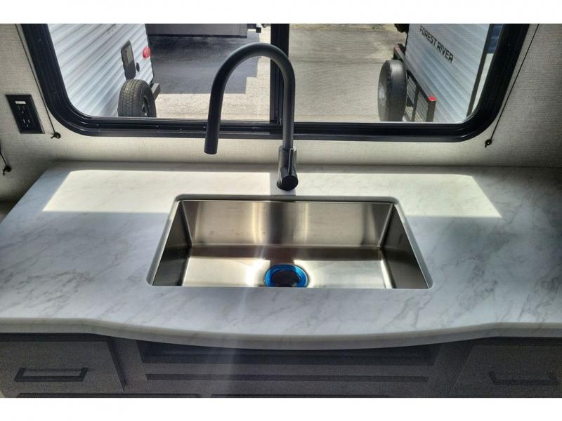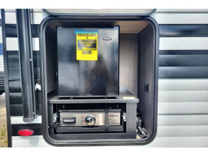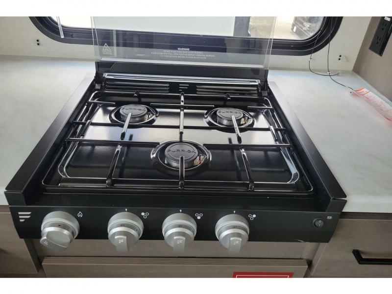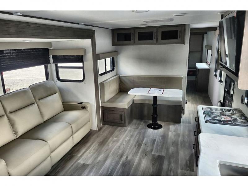 If you're looking for a cozy travel trailer for two, this is the one! You can sleep soundly each night on the king bed slide out, and you'll find plenty of storage in the front wardrobe. There is even washer and dryer prep if you choose to add those appliances. After you've freshened up in the full bath with a walk-in shower, you can head to the rear kitchen to make breakfast. There is ample counter space here, along with a three burner range and an air fryer/convection microwave, plus a pull-out trash can for easy clean up. The breakfast nook provides a fun place to dine together, and if you're needing additional sleeping space you can switch it out for the optional sleeper sofa. A theater seating slide also provides tons of comfort, especially since it's in perfect view of the 32" TV! This model also includes an exterior griddle with a 1.7 cu. ft. refrigerator, protected by the 21' power awning so you can cook in the shade!