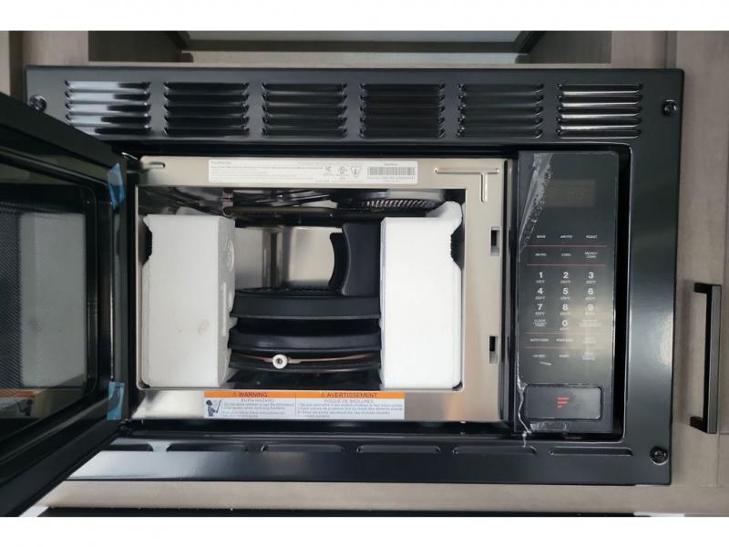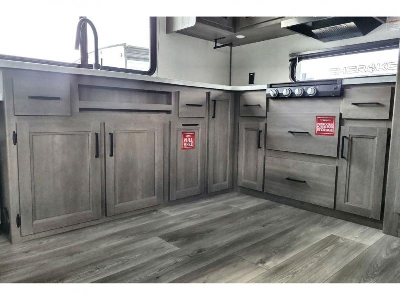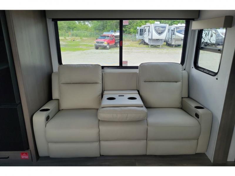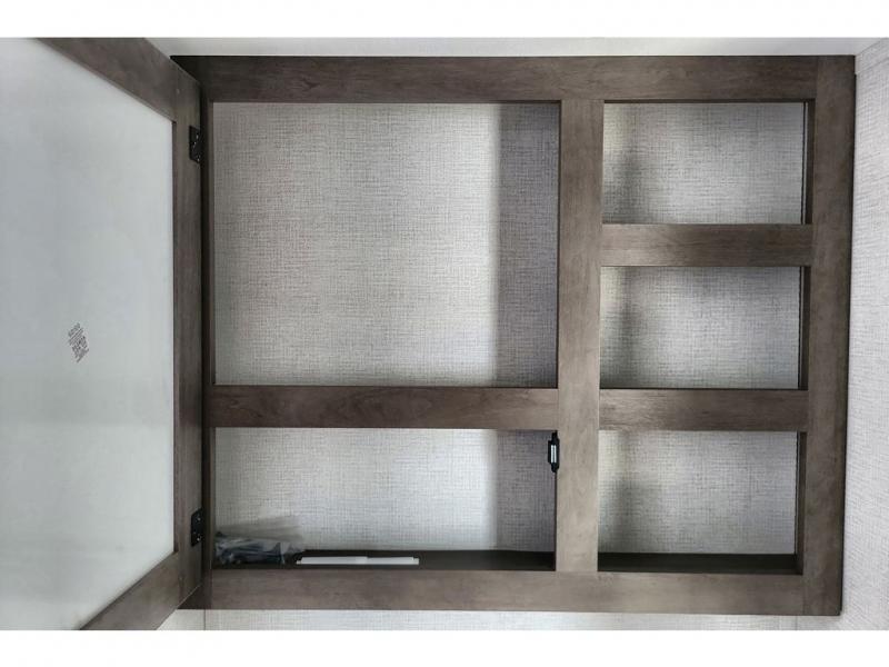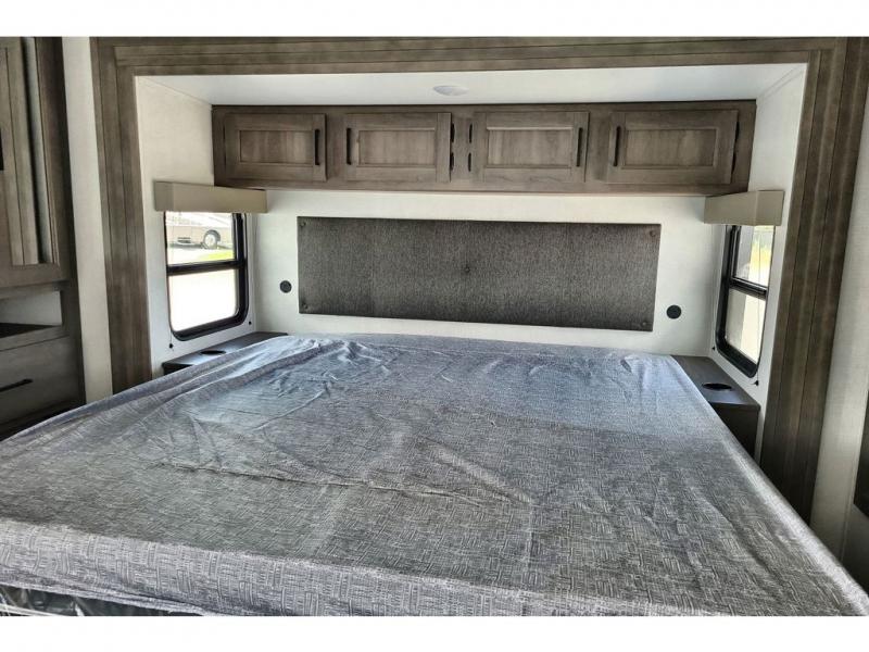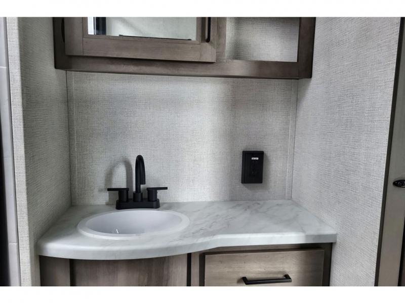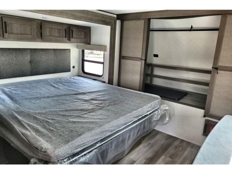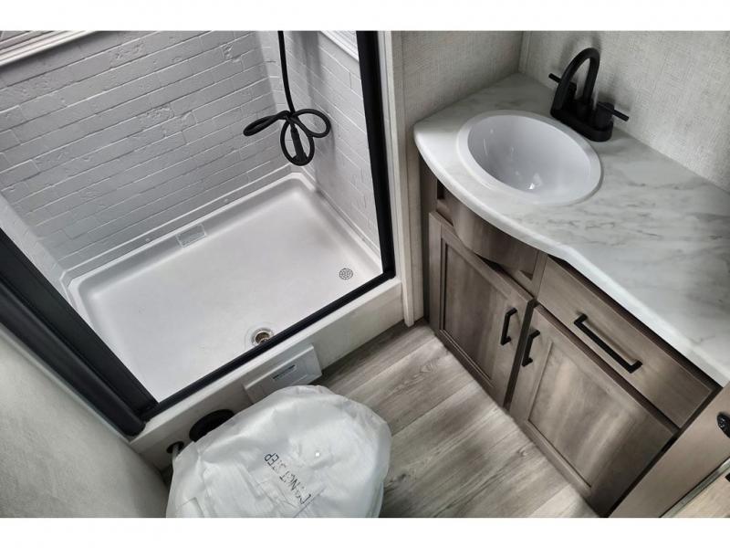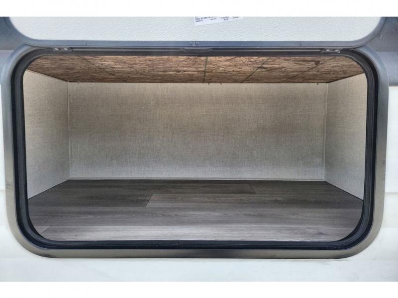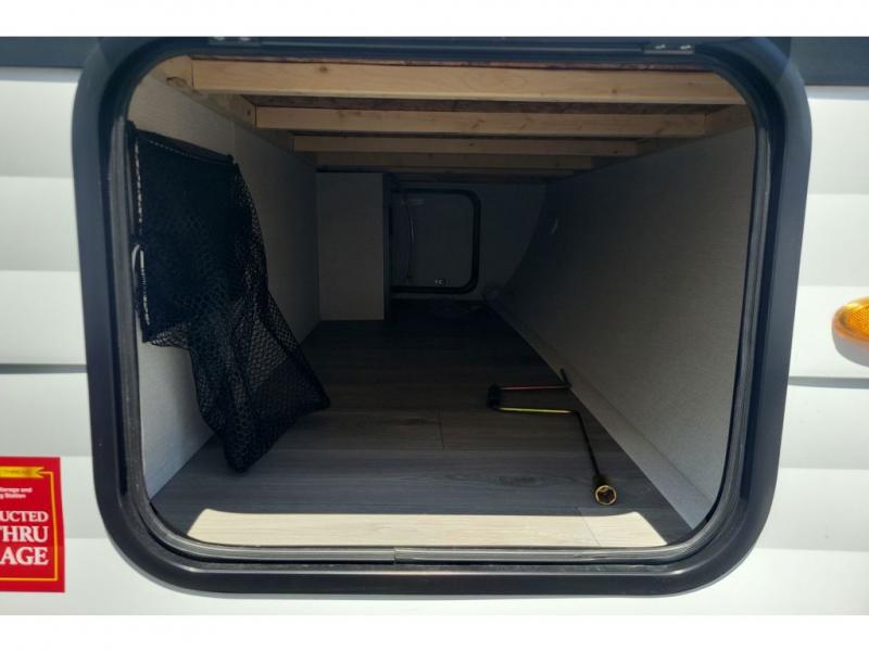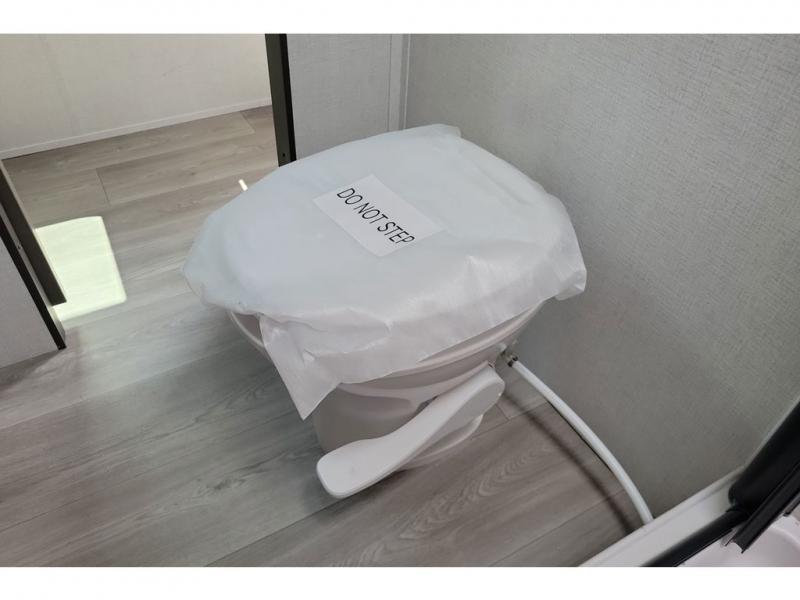 If you're looking for a cozy travel trailer for two, this is the one! You can sleep soundly each night on the king bed slide out, and you'll find plenty of storage in the front wardrobe. There is even washer and dryer prep if you choose to add those appliances. After you've freshened up in the full bath with a walk-in shower, you can head to the rear kitchen to make breakfast. There is ample counter space here, along with a three burner range and an air fryer/convection microwave, plus a pull-out trash can for easy clean up. The breakfast nook provides a fun place to dine together, and if you're needing additional sleeping space you can switch it out for the optional sleeper sofa. A theater seating slide also provides tons of comfort, especially since it's in perfect view of the 32" TV! This model also includes an exterior griddle with a 1.7 cu. ft. refrigerator, protected by the 21' power awning so you can cook in the shade!