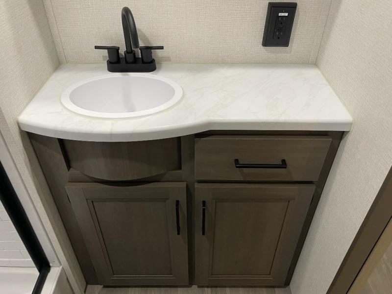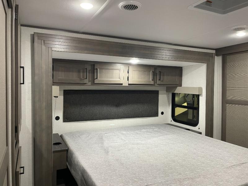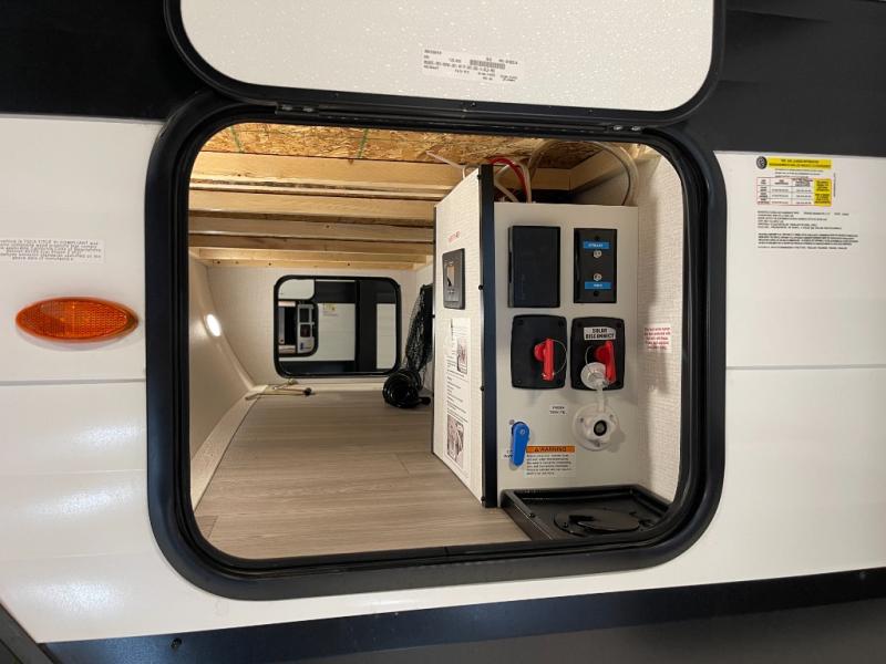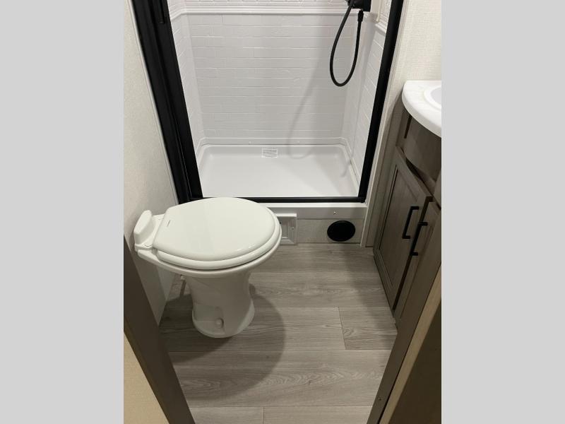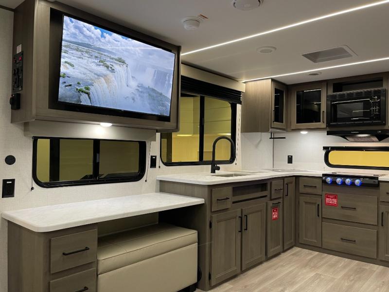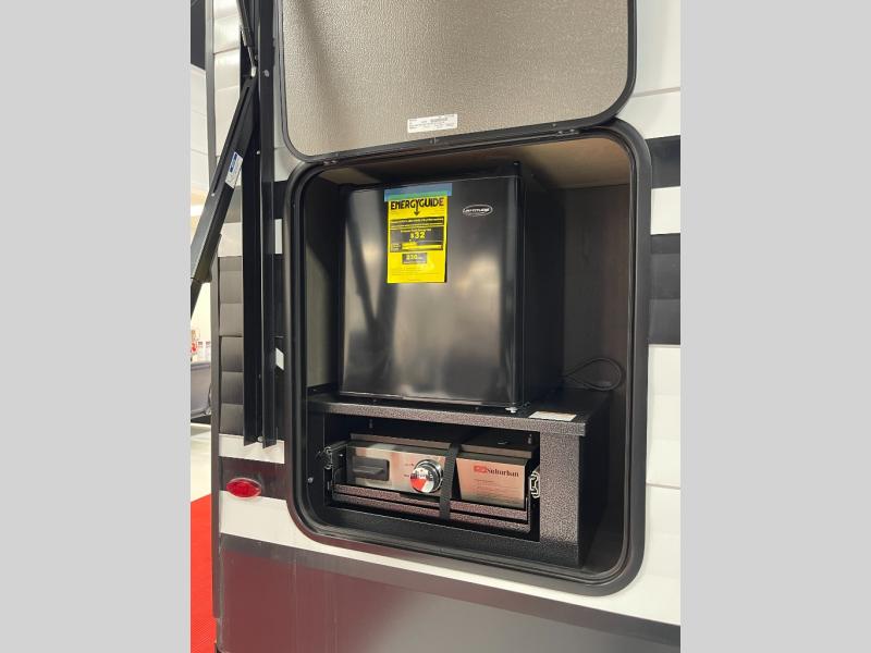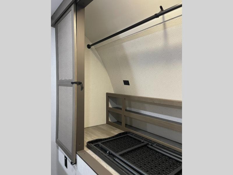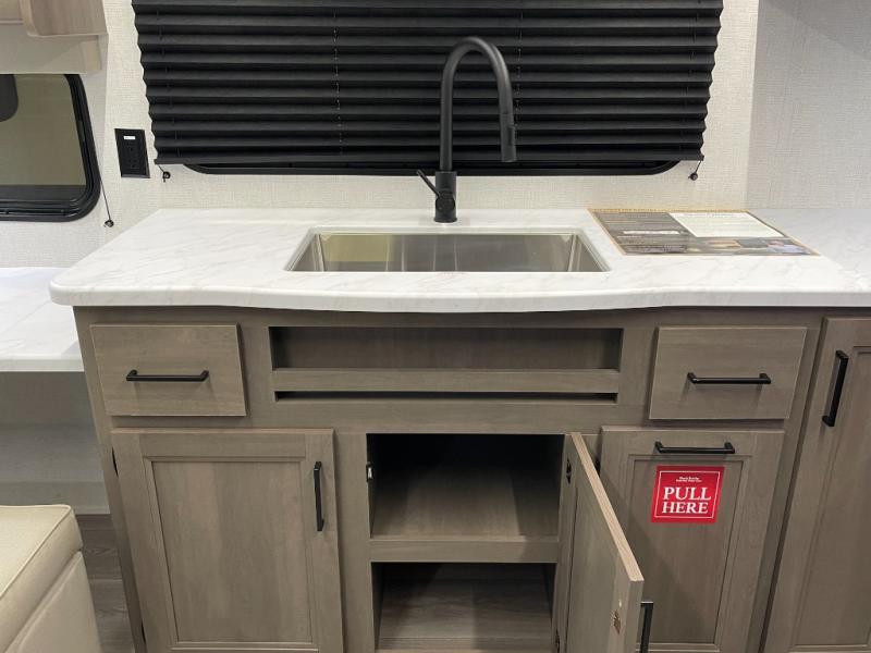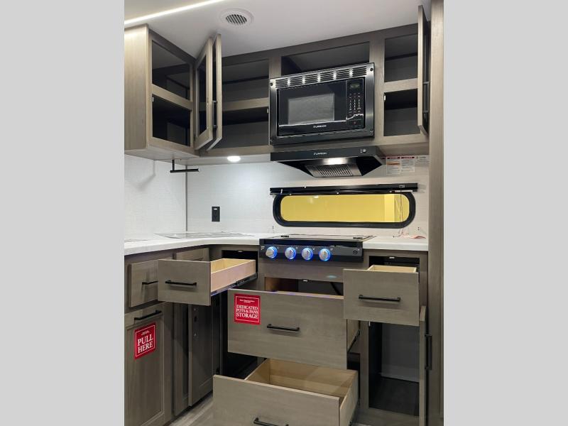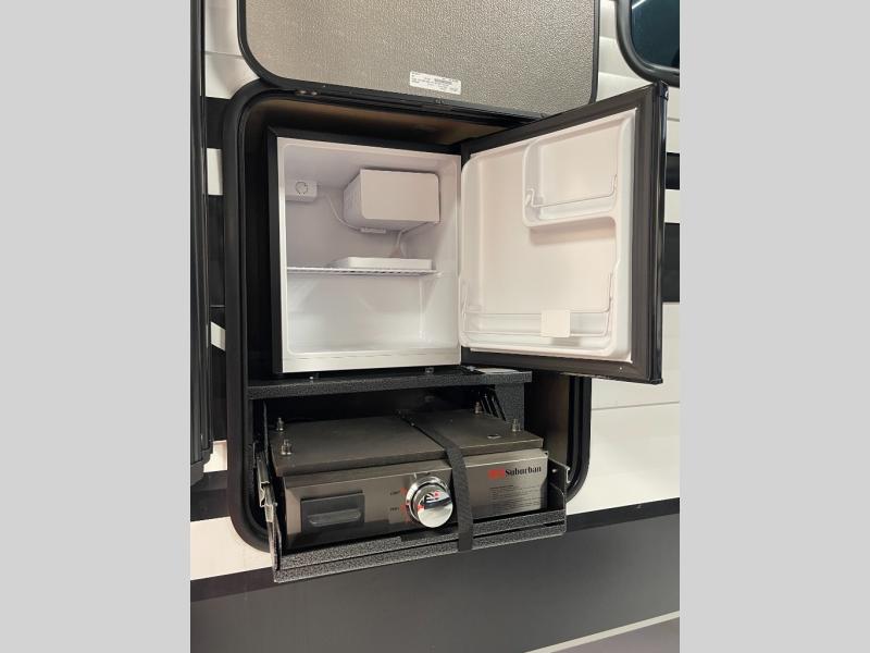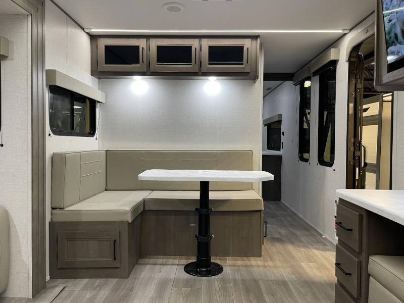 If you're looking for a cozy travel trailer for two, this is the one! You can sleep soundly each night on the king bed slide out, and you'll find plenty of storage in the front wardrobe. There is even washer and dryer prep if you choose to add those appliances. After you've freshened up in the full bath with a walk-in shower, you can head to the rear kitchen to make breakfast. There is ample counter space here, along with a three burner range and an air fryer/convection microwave, plus a pull-out trash can for easy clean up. The breakfast nook provides a fun place to dine together, and if you're needing additional sleeping space you can switch it out for the optional sleeper sofa. A theater seating slide also provides tons of comfort, especially since it's in perfect view of the 32" TV! This model also includes an exterior griddle with a 1.7 cu. ft. refrigerator, protected by the 21' power awning so you can cook in the shade!