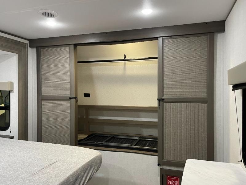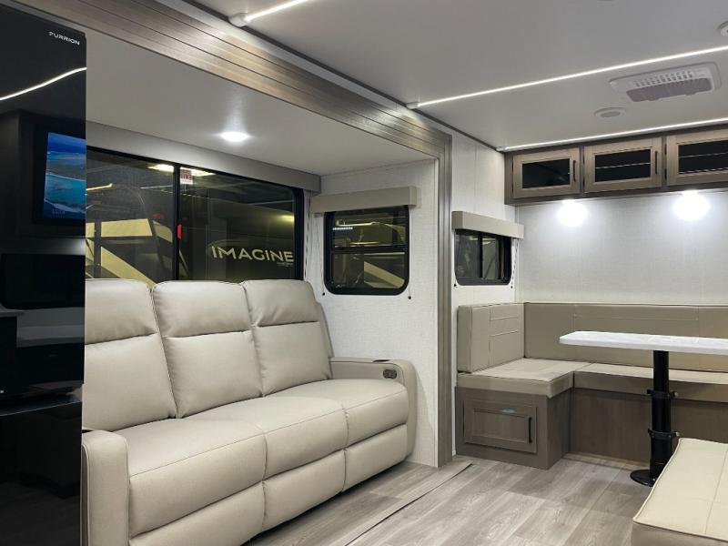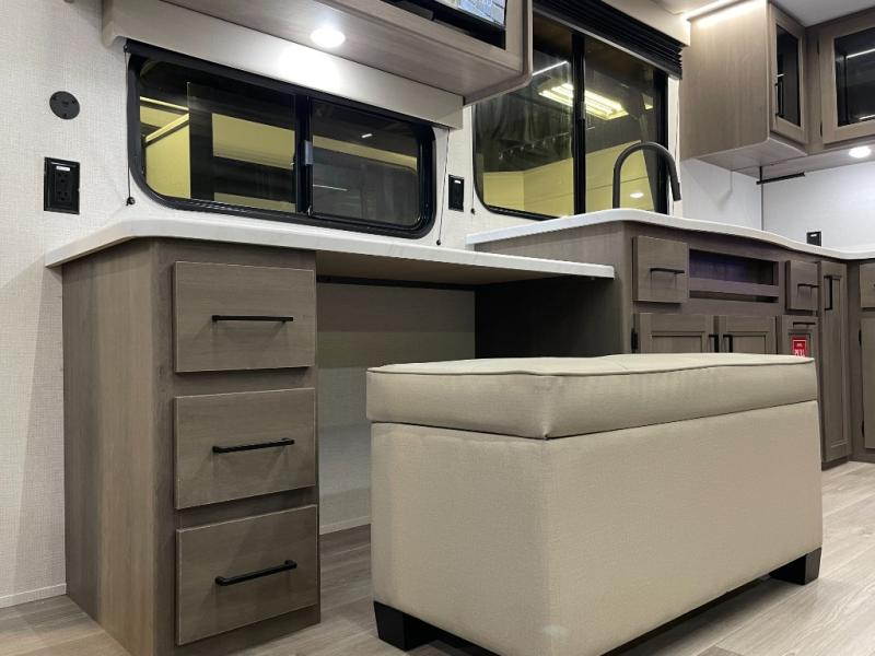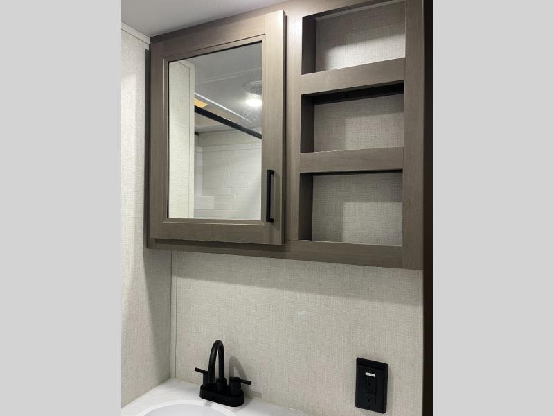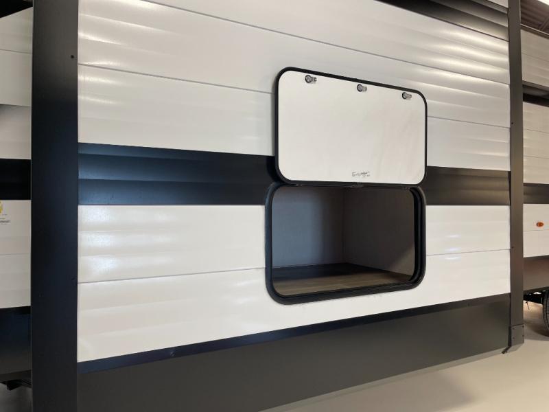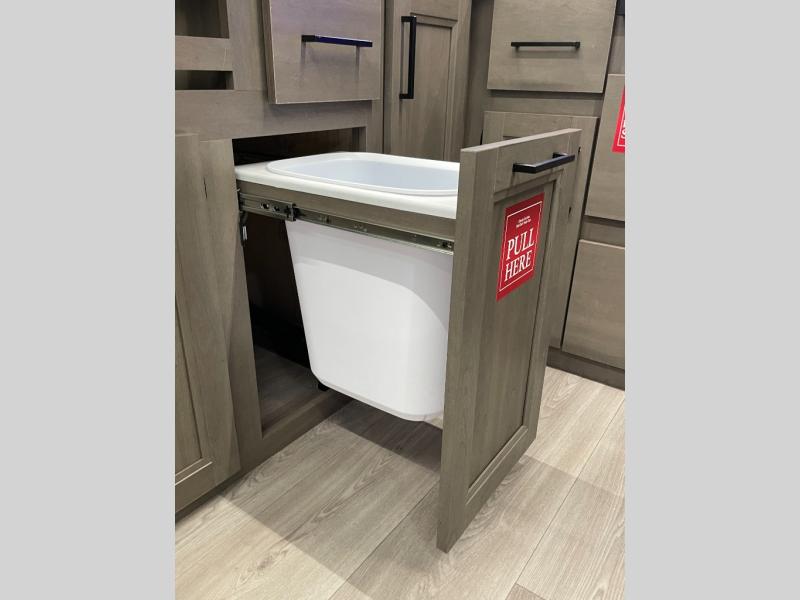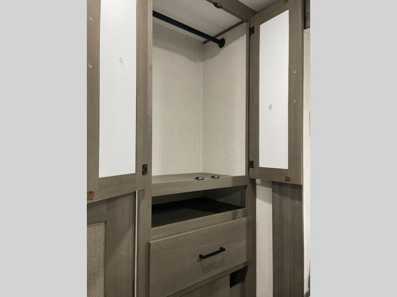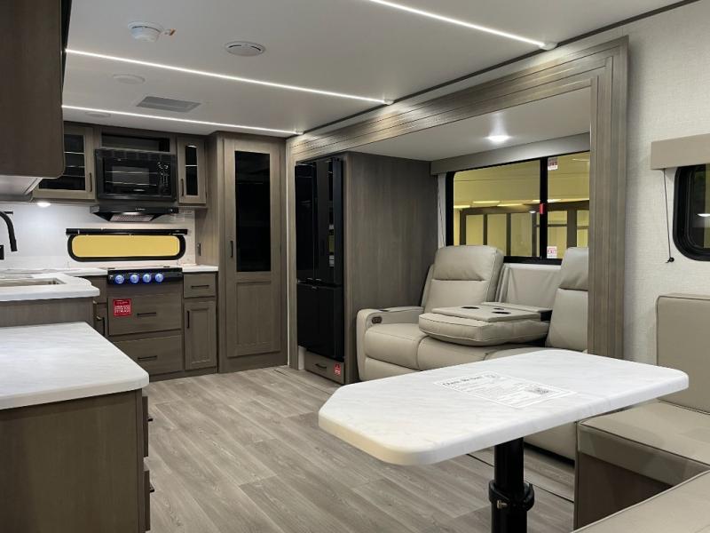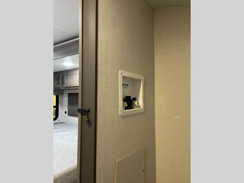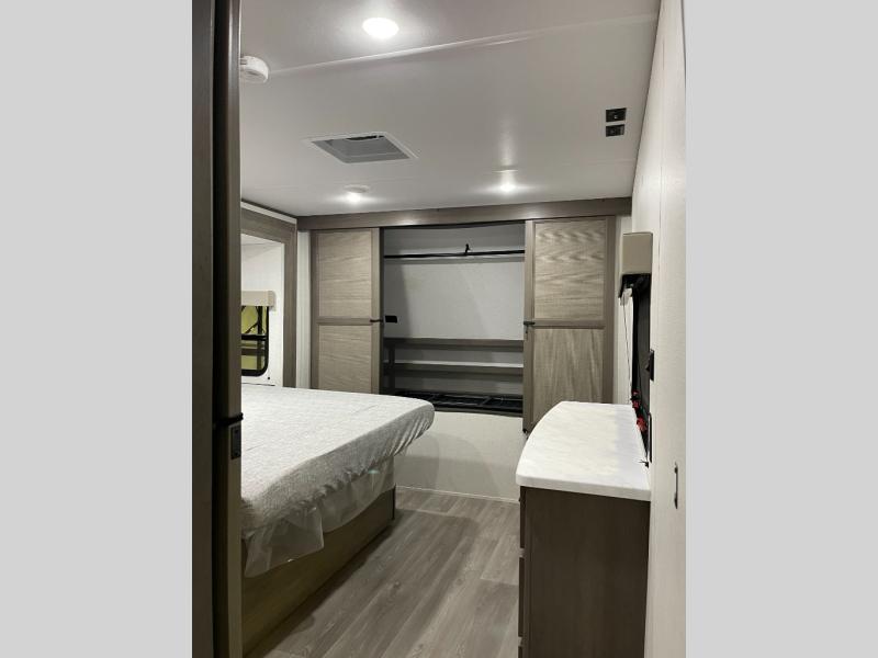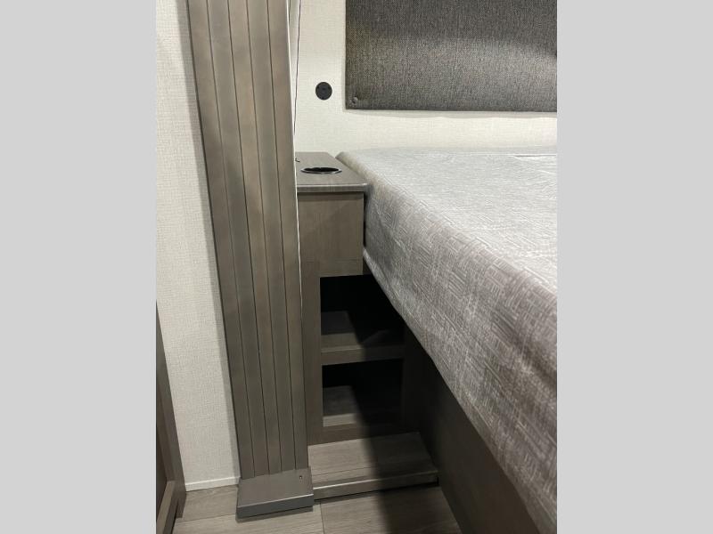 If you're looking for a cozy travel trailer for two, this is the one! You can sleep soundly each night on the king bed slide out, and you'll find plenty of storage in the front wardrobe. There is even washer and dryer prep if you choose to add those appliances. After you've freshened up in the full bath with a walk-in shower, you can head to the rear kitchen to make breakfast. There is ample counter space here, along with a three burner range and an air fryer/convection microwave, plus a pull-out trash can for easy clean up. The breakfast nook provides a fun place to dine together, and if you're needing additional sleeping space you can switch it out for the optional sleeper sofa. A theater seating slide also provides tons of comfort, especially since it's in perfect view of the 32" TV! This model also includes an exterior griddle with a 1.7 cu. ft. refrigerator, protected by the 21' power awning so you can cook in the shade!