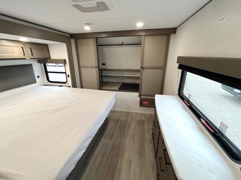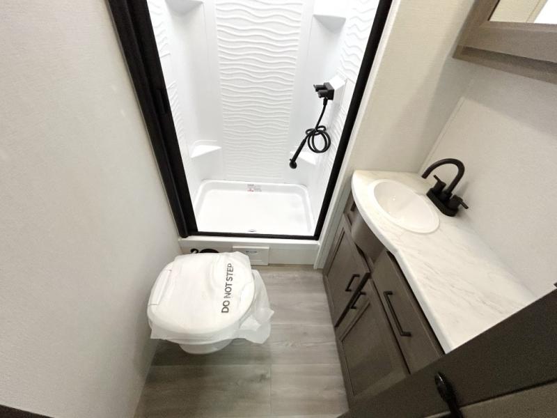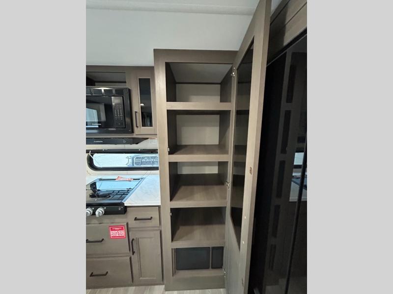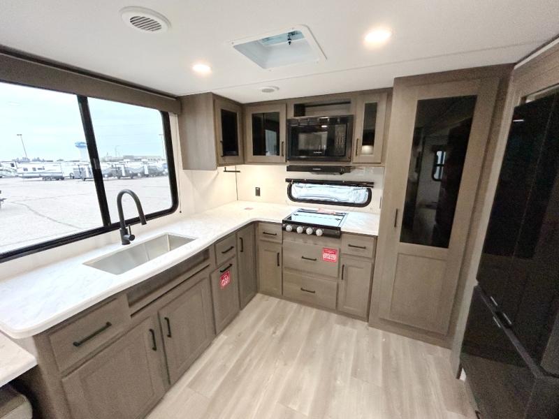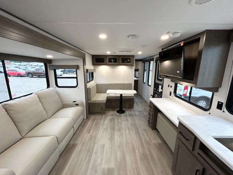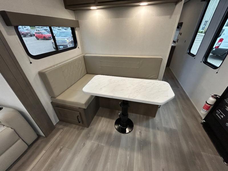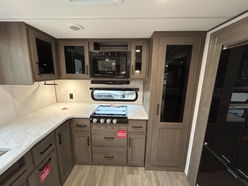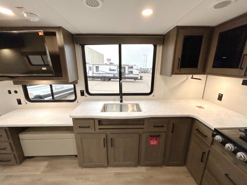 If you're looking for a cozy travel trailer for two, this is the one! You can sleep soundly each night on the king bed slide out, and you'll find plenty of storage in the front wardrobe. There is even washer and dryer prep if you choose to add those appliances. After you've freshened up in the full bath with a walk-in shower, you can head to the rear kitchen to make breakfast. There is ample counter space here, along with a three burner range and an air fryer/convection microwave, plus a pull-out trash can for easy clean up. The breakfast nook provides a fun place to dine together, and if you're needing additional sleeping space you can switch it out for the optional sleeper sofa. A theater seating slide also provides tons of comfort, especially since it's in perfect view of the 32" TV! This model also includes an exterior griddle with a 1.7 cu. ft. refrigerator, protected by the 21' power awning so you can cook in the shade!