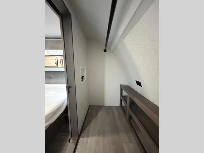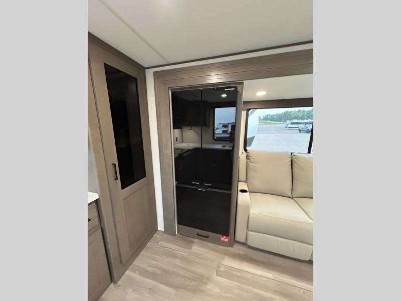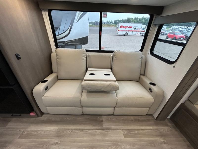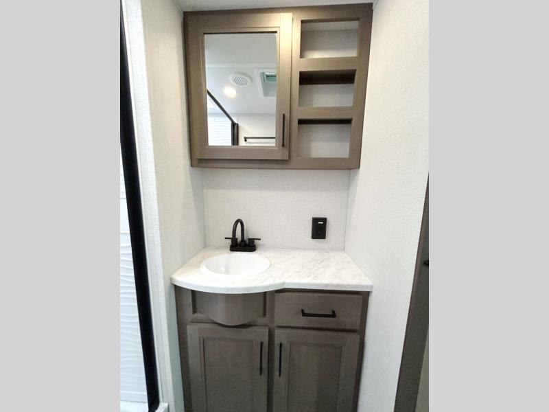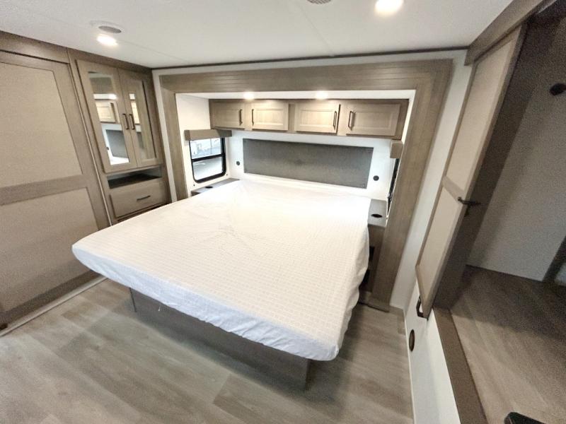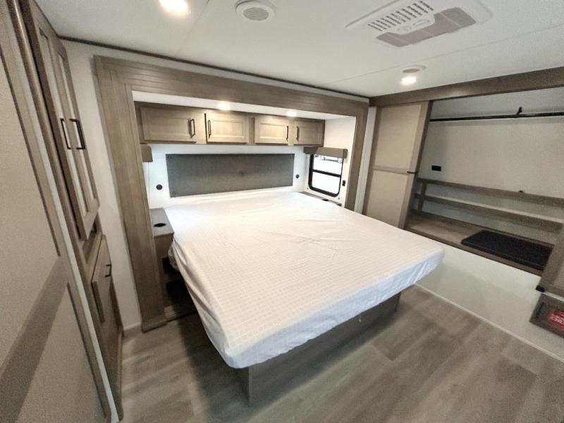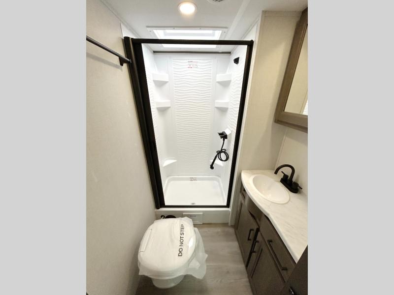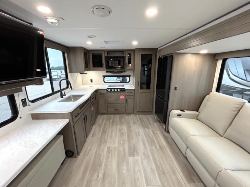 If you're looking for a cozy travel trailer for two, this is the one! You can sleep soundly each night on the king bed slide out, and you'll find plenty of storage in the front wardrobe. There is even washer and dryer prep if you choose to add those appliances. After you've freshened up in the full bath with a walk-in shower, you can head to the rear kitchen to make breakfast. There is ample counter space here, along with a three burner range and an air fryer/convection microwave, plus a pull-out trash can for easy clean up. The breakfast nook provides a fun place to dine together, and if you're needing additional sleeping space you can switch it out for the optional sleeper sofa. A theater seating slide also provides tons of comfort, especially since it's in perfect view of the 32" TV! This model also includes an exterior griddle with a 1.7 cu. ft. refrigerator, protected by the 21' power awning so you can cook in the shade!