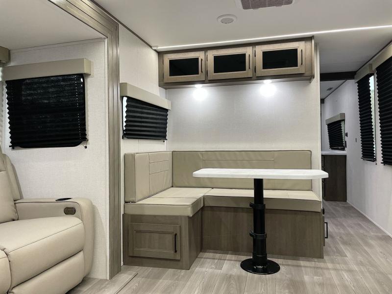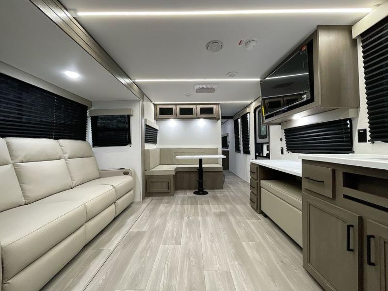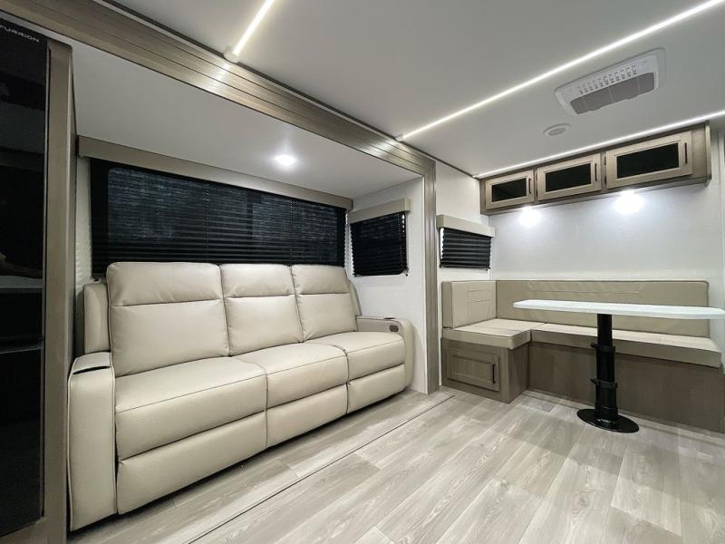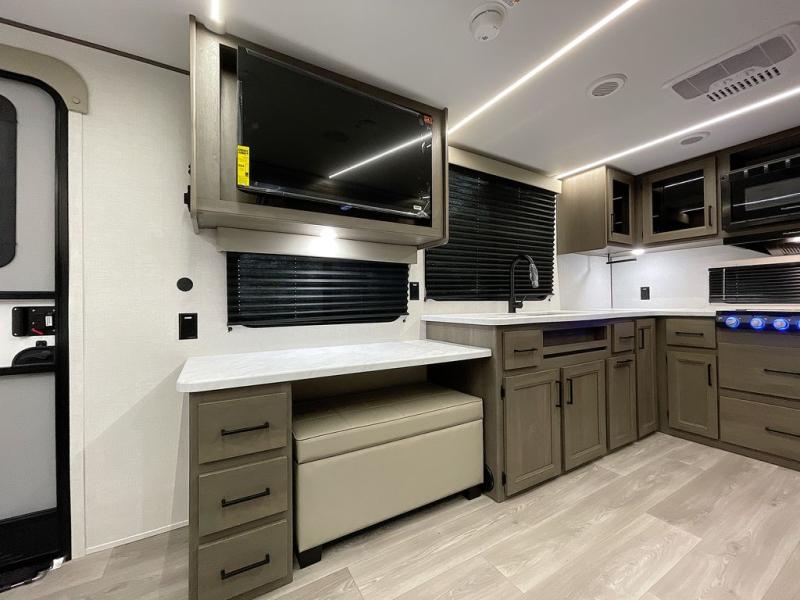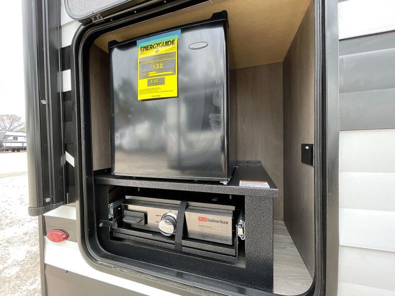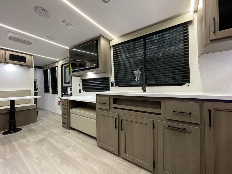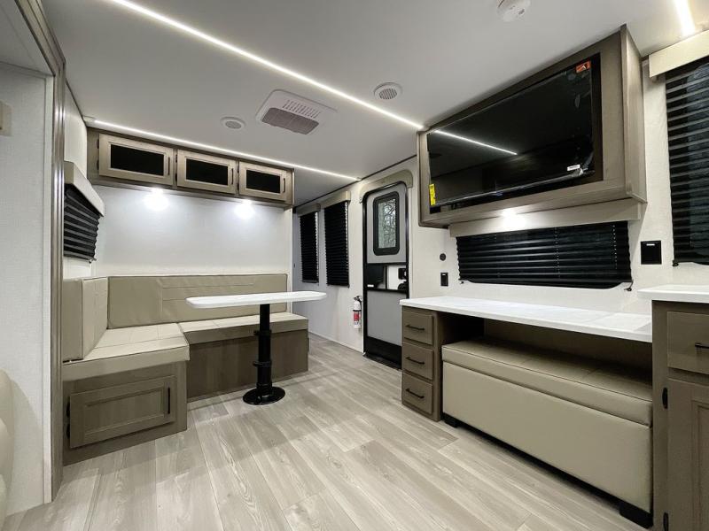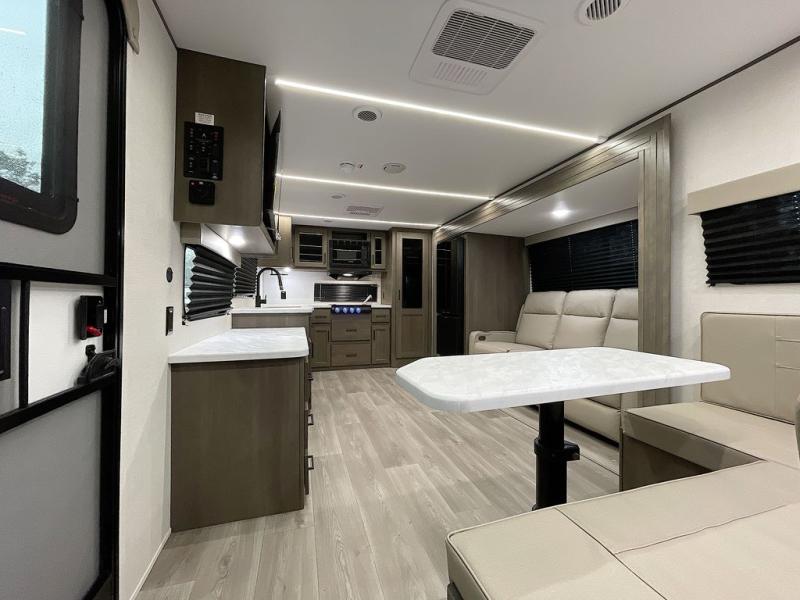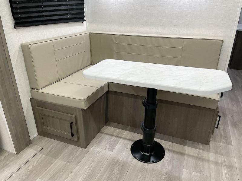 If you're looking for a cozy travel trailer for two, this is the one! You can sleep soundly each night on the king bed slide out, and you'll find plenty of storage in the front wardrobe. There is even washer and dryer prep if you choose to add those appliances. After you've freshened up in the full bath with a walk-in shower, you can head to the rear kitchen to make breakfast. There is ample counter space here, along with a three burner range and an air fryer/convection microwave, plus a pull-out trash can for easy clean up. The breakfast nook provides a fun place to dine together, and if you're needing additional sleeping space you can switch it out for the optional sleeper sofa. A theater seating slide also provides tons of comfort, especially since it's in perfect view of the 32" TV! This model also includes an exterior griddle with a 1.7 cu. ft. refrigerator, protected by the 21' power awning so you can cook in the shade!