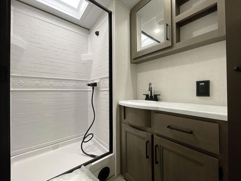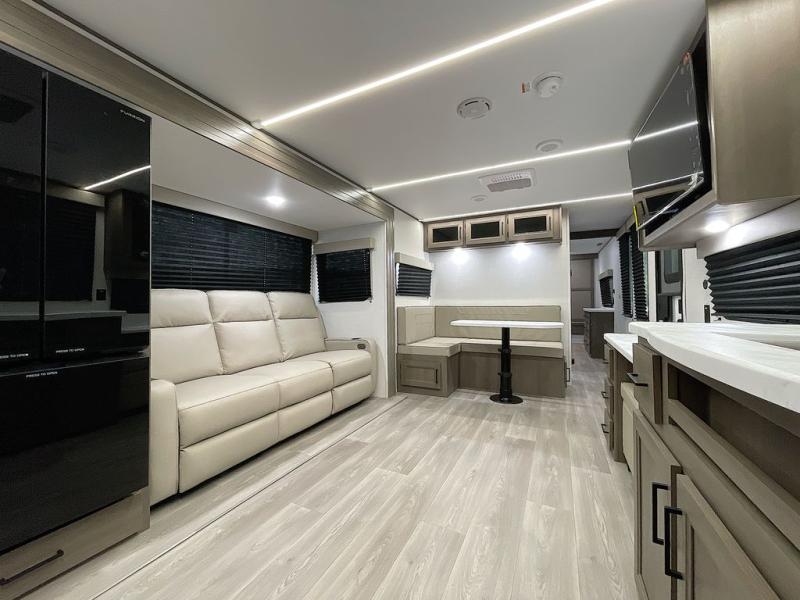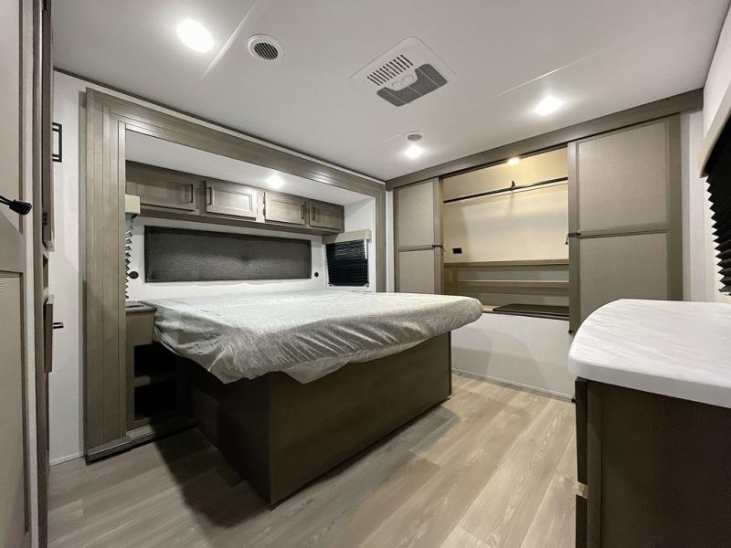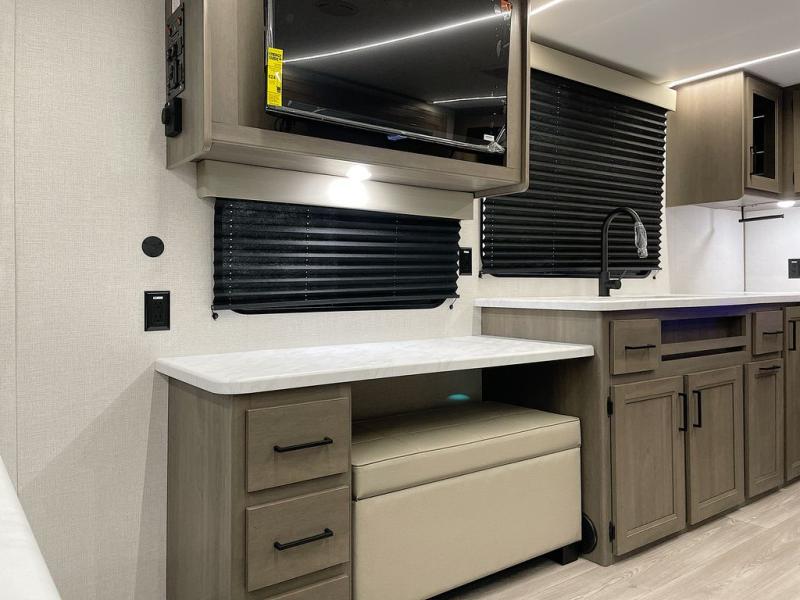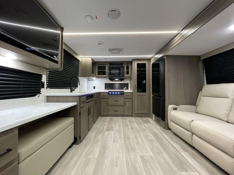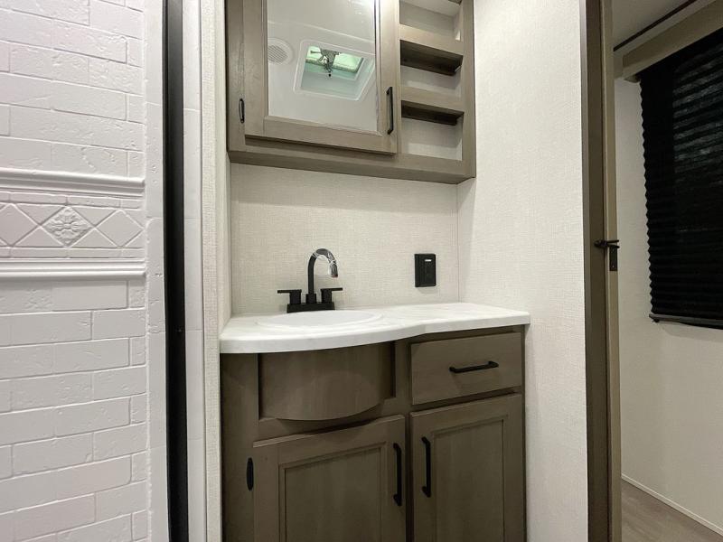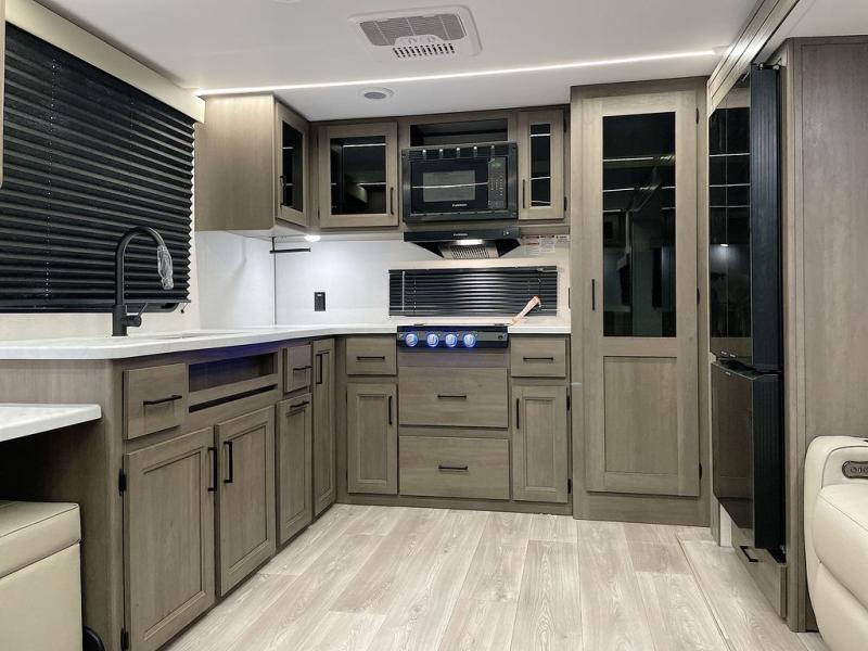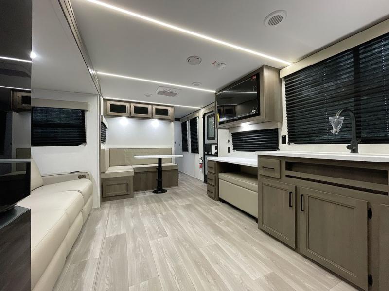 If you're looking for a cozy travel trailer for two, this is the one! You can sleep soundly each night on the king bed slide out, and you'll find plenty of storage in the front wardrobe. There is even washer and dryer prep if you choose to add those appliances. After you've freshened up in the full bath with a walk-in shower, you can head to the rear kitchen to make breakfast. There is ample counter space here, along with a three burner range and an air fryer/convection microwave, plus a pull-out trash can for easy clean up. The breakfast nook provides a fun place to dine together, and if you're needing additional sleeping space you can switch it out for the optional sleeper sofa. A theater seating slide also provides tons of comfort, especially since it's in perfect view of the 32" TV! This model also includes an exterior griddle with a 1.7 cu. ft. refrigerator, protected by the 21' power awning so you can cook in the shade!