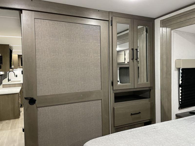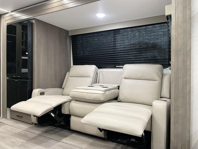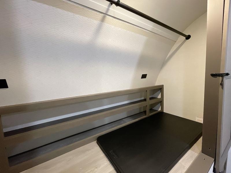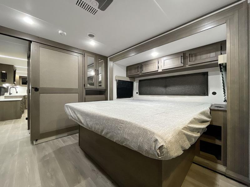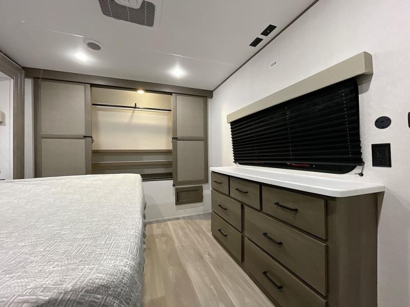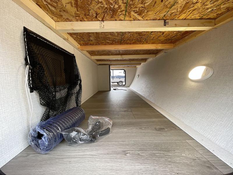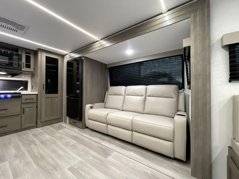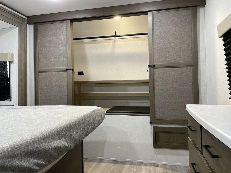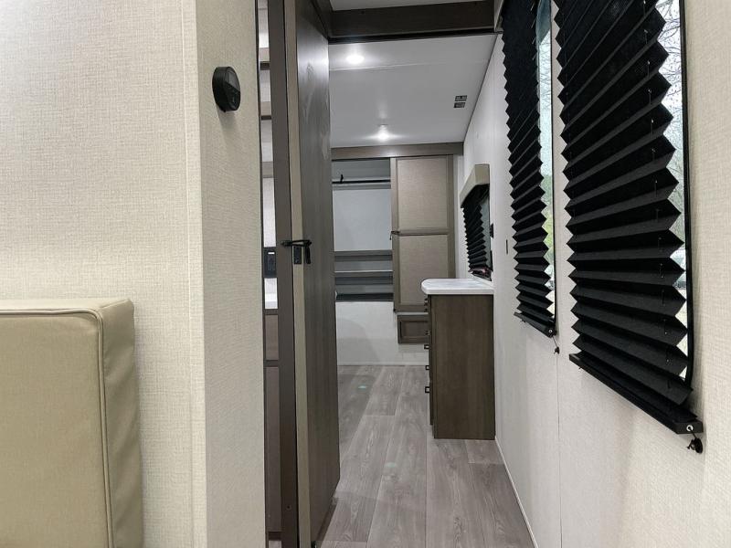 If you're looking for a cozy travel trailer for two, this is the one! You can sleep soundly each night on the king bed slide out, and you'll find plenty of storage in the front wardrobe. There is even washer and dryer prep if you choose to add those appliances. After you've freshened up in the full bath with a walk-in shower, you can head to the rear kitchen to make breakfast. There is ample counter space here, along with a three burner range and an air fryer/convection microwave, plus a pull-out trash can for easy clean up. The breakfast nook provides a fun place to dine together, and if you're needing additional sleeping space you can switch it out for the optional sleeper sofa. A theater seating slide also provides tons of comfort, especially since it's in perfect view of the 32" TV! This model also includes an exterior griddle with a 1.7 cu. ft. refrigerator, protected by the 21' power awning so you can cook in the shade!