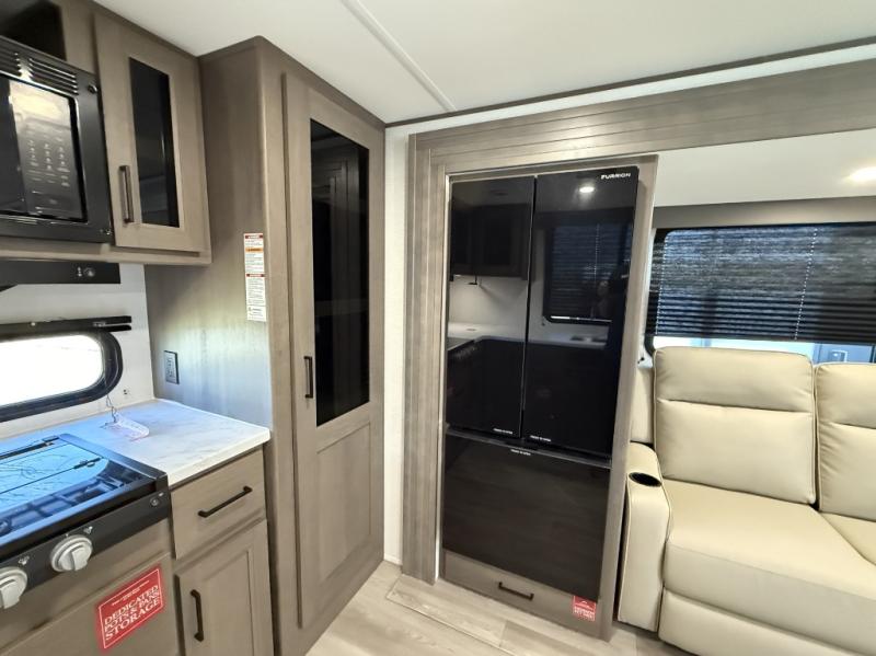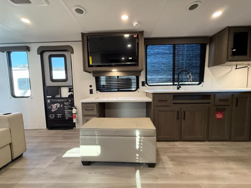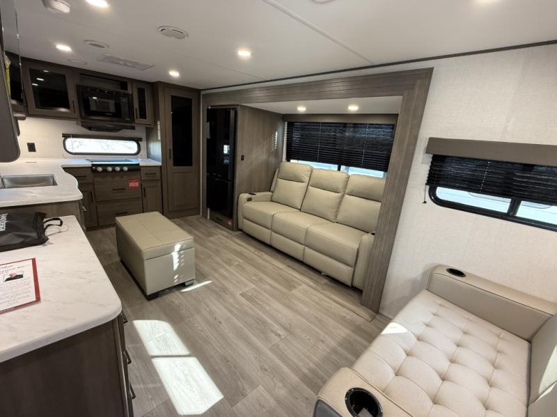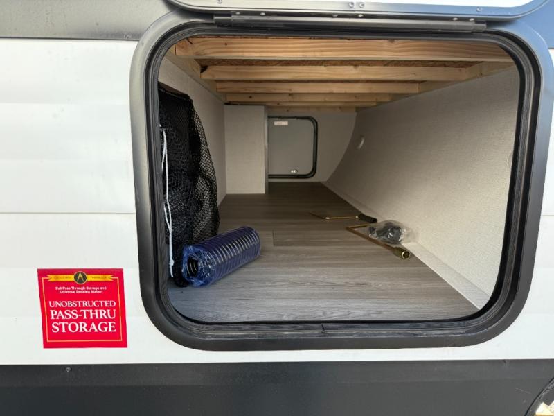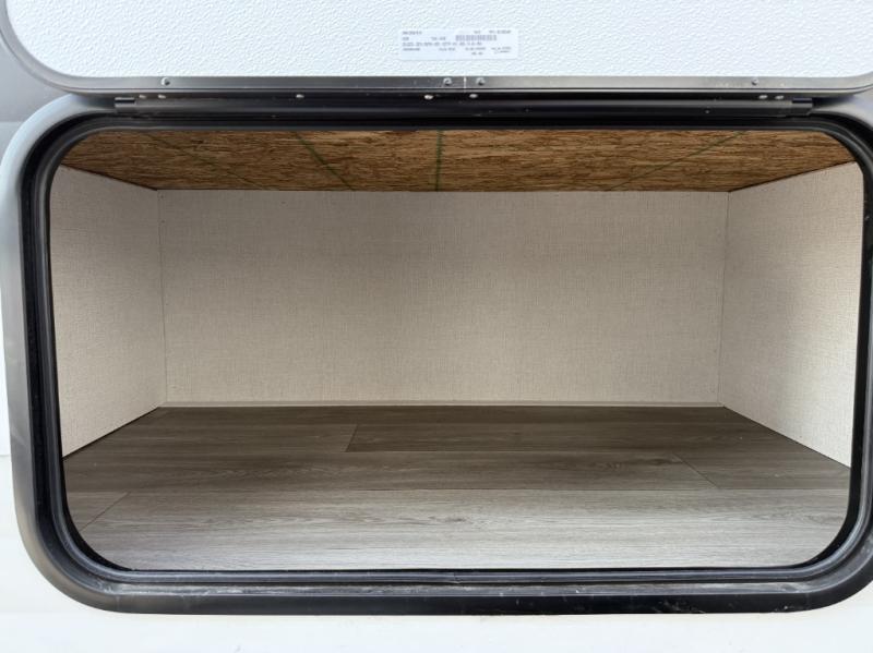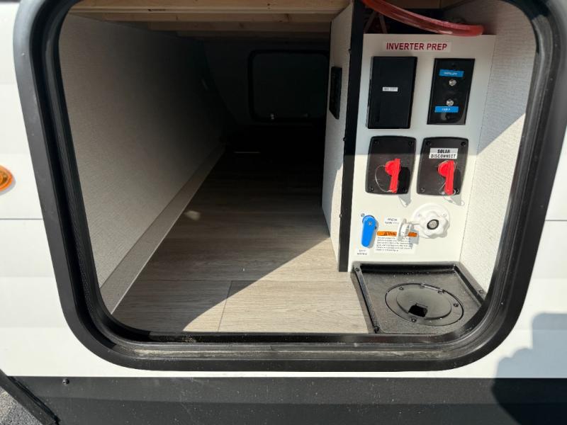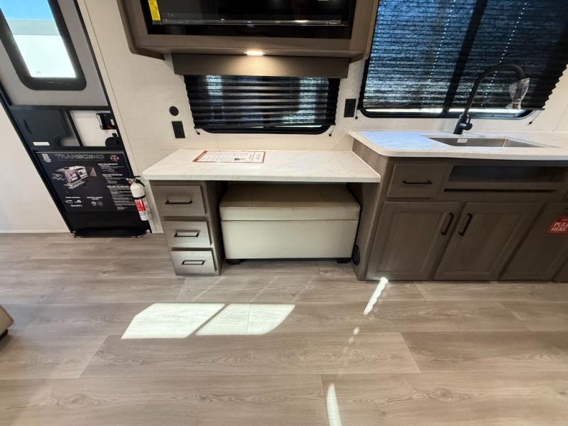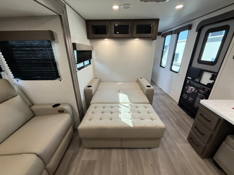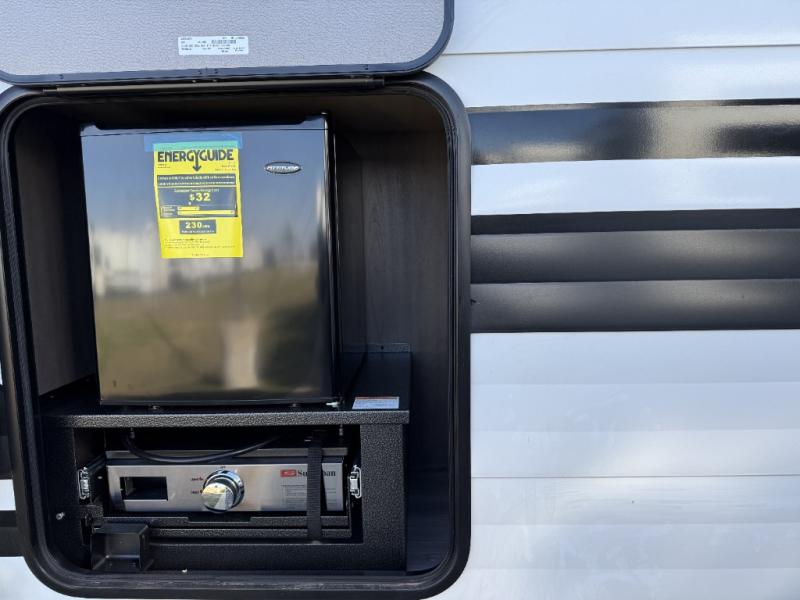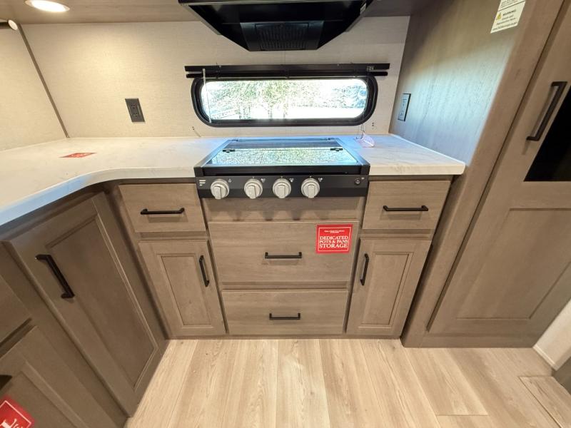 If you're looking for a cozy travel trailer for two, this is the one! You can sleep soundly each night on the king bed slide out, and you'll find plenty of storage in the front wardrobe. There is even washer and dryer prep if you choose to add those appliances. After you've freshened up in the full bath with a walk-in shower, you can head to the rear kitchen to make breakfast. There is ample counter space here, along with a three burner range and an air fryer/convection microwave, plus a pull-out trash can for easy clean up. The breakfast nook provides a fun place to dine together, and if you're needing additional sleeping space you can switch it out for the optional sleeper sofa. A theater seating slide also provides tons of comfort, especially since it's in perfect view of the 32" TV! This model also includes an exterior griddle with a 1.7 cu. ft. refrigerator, protected by the 21' power awning so you can cook in the shade!