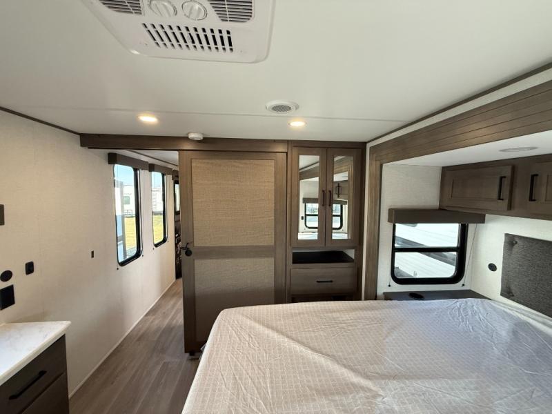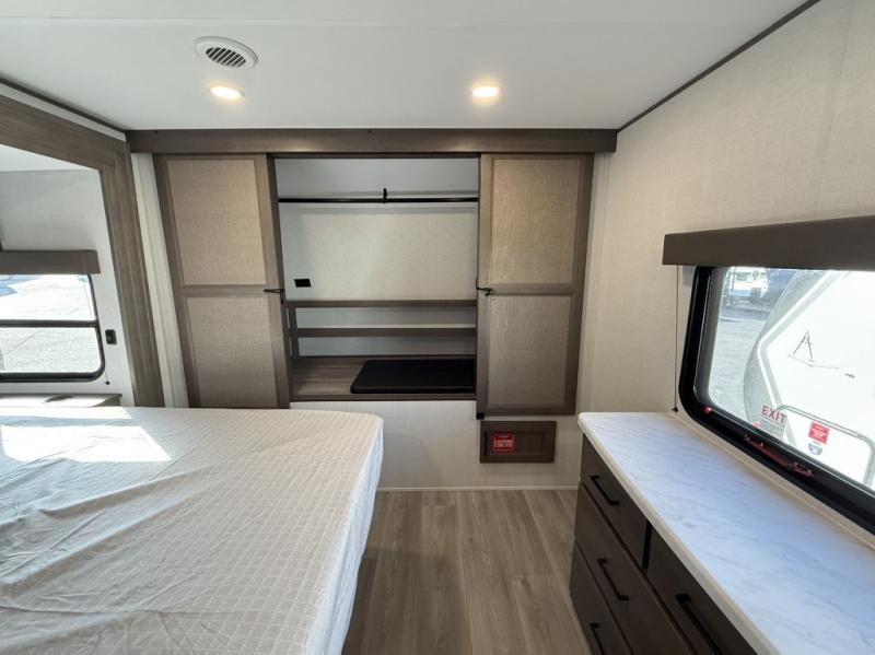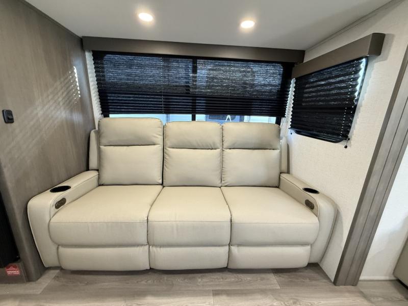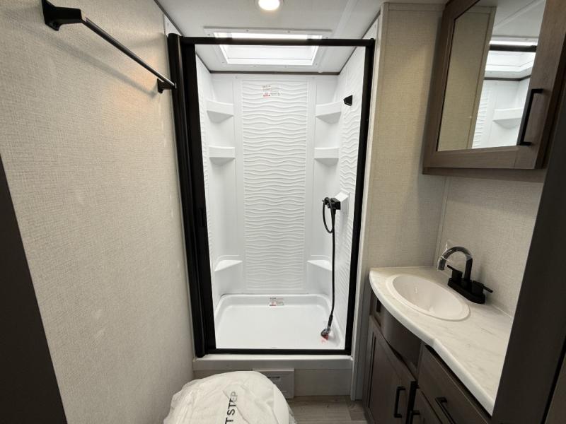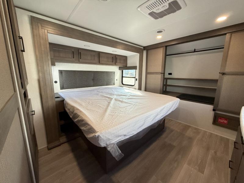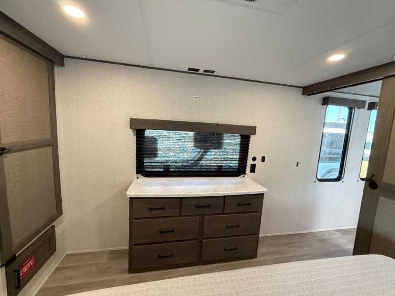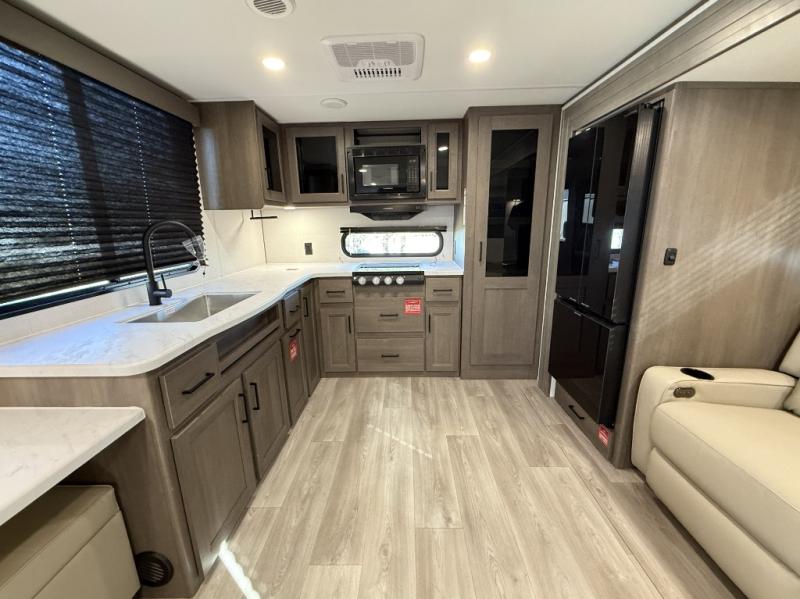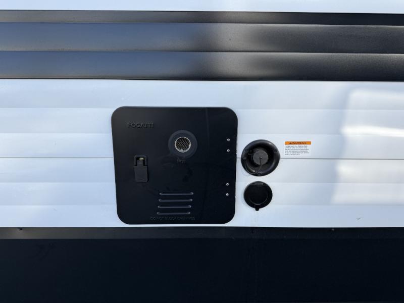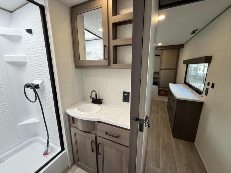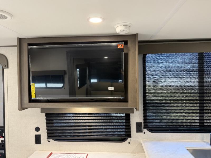 If you're looking for a cozy travel trailer for two, this is the one! You can sleep soundly each night on the king bed slide out, and you'll find plenty of storage in the front wardrobe. There is even washer and dryer prep if you choose to add those appliances. After you've freshened up in the full bath with a walk-in shower, you can head to the rear kitchen to make breakfast. There is ample counter space here, along with a three burner range and an air fryer/convection microwave, plus a pull-out trash can for easy clean up. The breakfast nook provides a fun place to dine together, and if you're needing additional sleeping space you can switch it out for the optional sleeper sofa. A theater seating slide also provides tons of comfort, especially since it's in perfect view of the 32" TV! This model also includes an exterior griddle with a 1.7 cu. ft. refrigerator, protected by the 21' power awning so you can cook in the shade!
