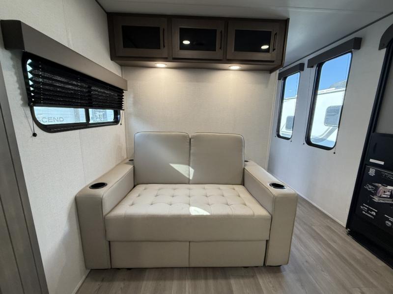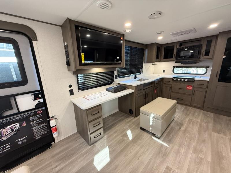 With any Transcend travel trailer by Grand Design, you will enjoy upscale appointments and convenient amenities to make each camping experience one to remember! The Quad Seal technology, residential insulated walls, plus heated and enclosed underbelly with suspended tanks make these units solid and durable. There is a black automotive glass door outside, along with a Safe-T-Rail assist on the main entry door, backup camera prep, and a universal docking station. JBL interior and exterior speakers plus a JBL head unit will let you listen to your favorite tunes as you visit under the power awning with LED strip lights. Inside, you'll enjoy multiple outlets to keep your gadgets charged, thermoformed and seamless countertops, and a 6' 6" interior height so you won't feel closed in. The Solar Prep Package will allow you to enjoy off-grid capabilities with a 200W solar panel, which is wired for up to 600W, a 30 AMP Bluetooth solar controller, a 2000W inverter prep, and more!