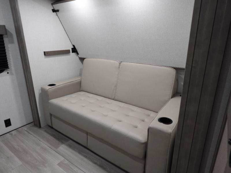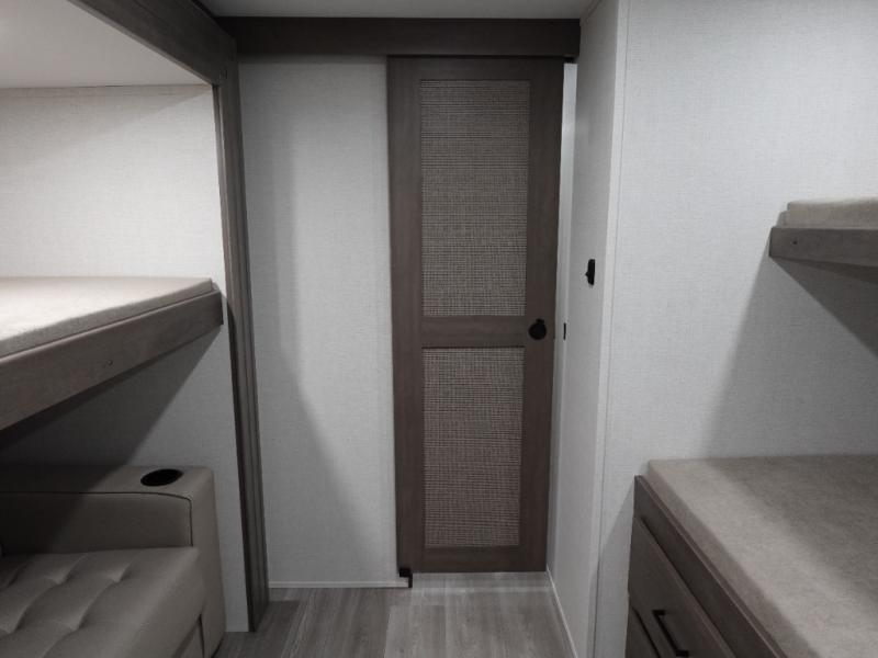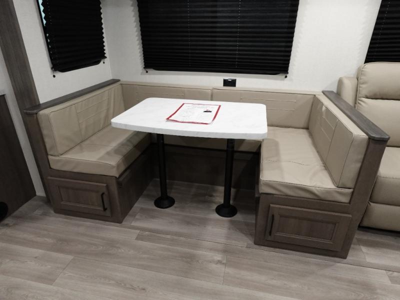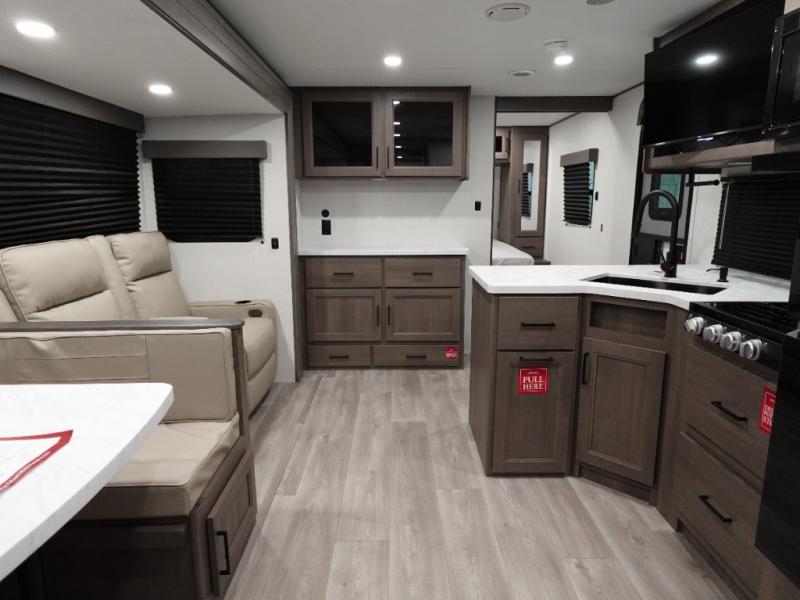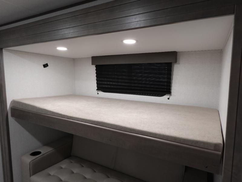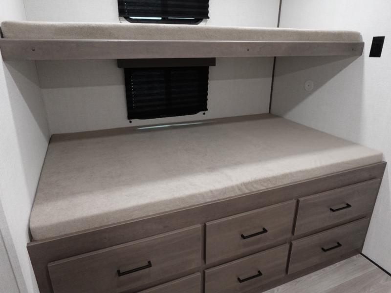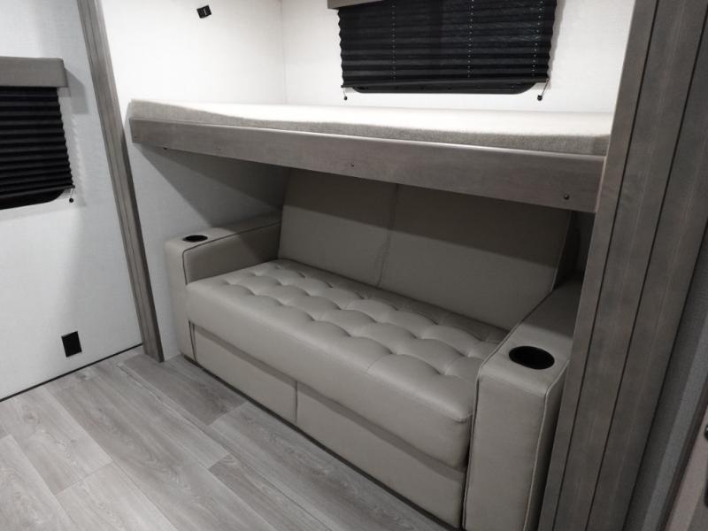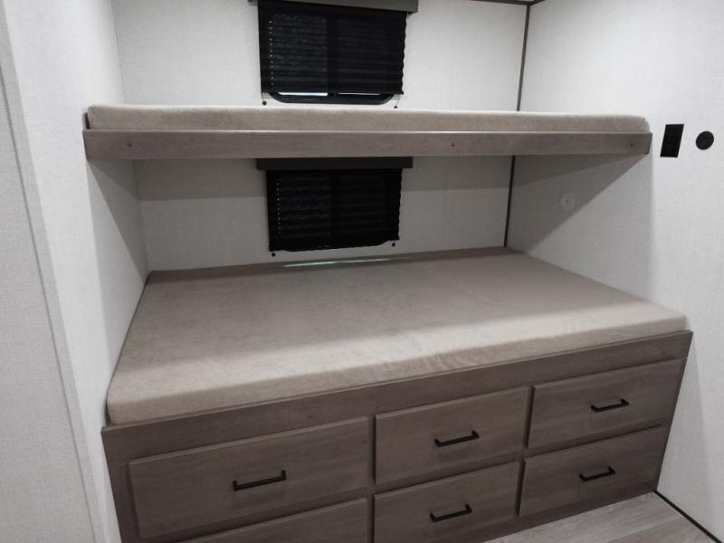 If you're looking for a travel trailer that can house your whole gang, this unit is the one! The rear private bunkhouse can sleep up to five since there is a sleeper sofa and three bunks, plus there are storage drawers for your guests' things. A front private bedroom will be perfect for the owners with a queen bed, storage space, and a convenient laundry chute! Whether you cook outside on the exterior griddle or inside on the three burner range, you'll be able to make your best meals. There is also a 12V French door refrigerator with a glass front and bottom freezer and a convection microwave/combo air fryer for easy meals! A U-shaped dinette and theater seats within the living room slide provides even more seating and sleeping space, or you can choose the optional theater seat in place of the sofa if you're not needing the extra sleeping space!