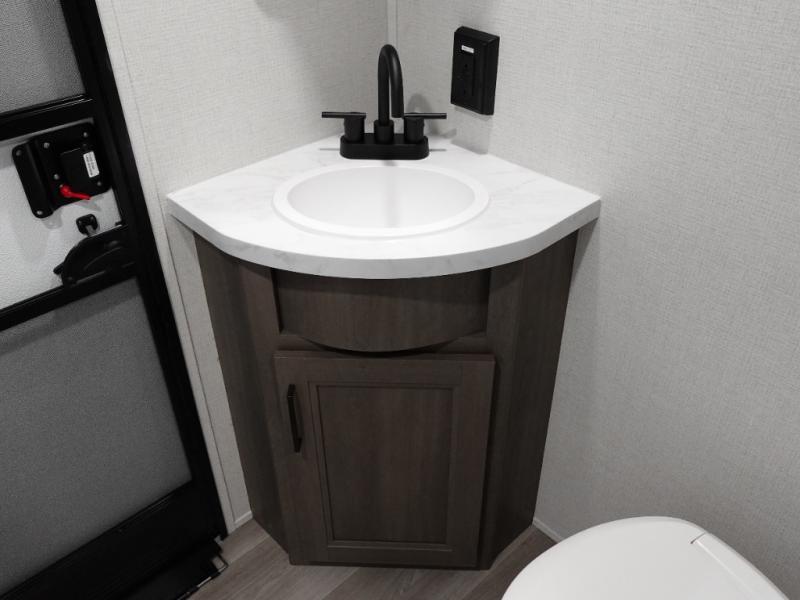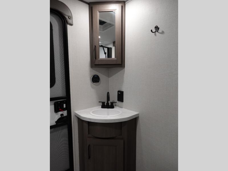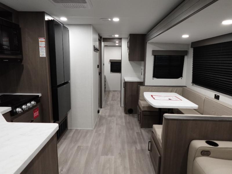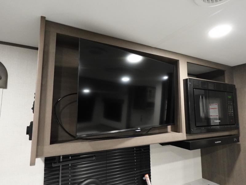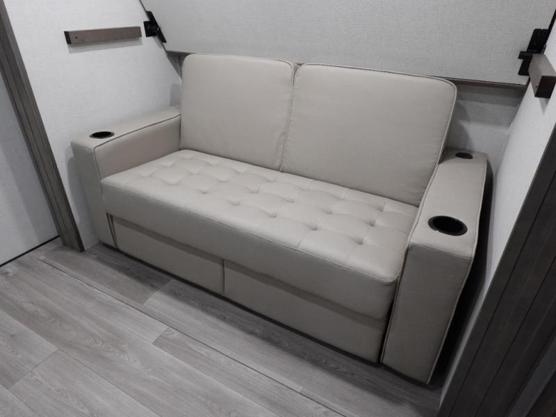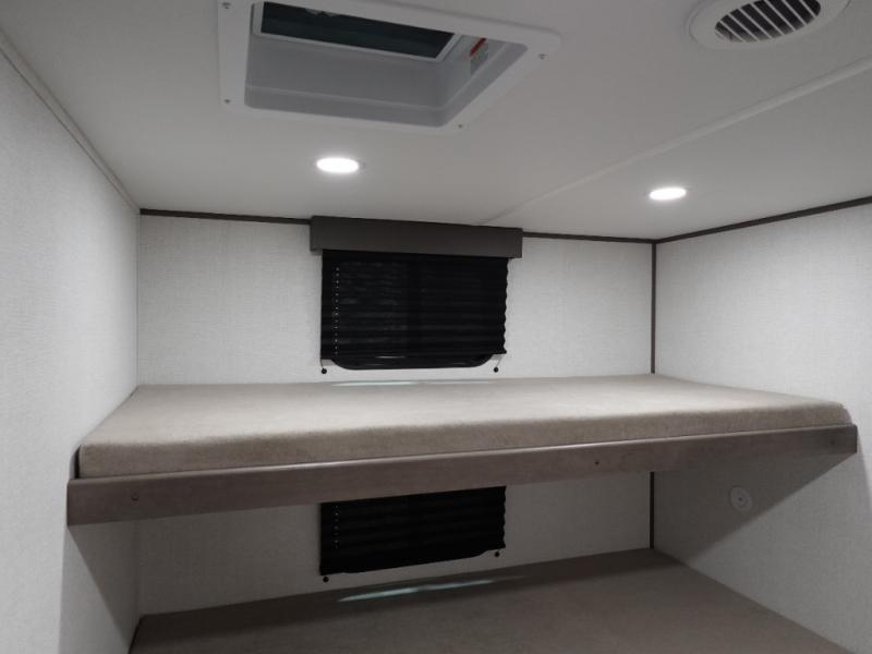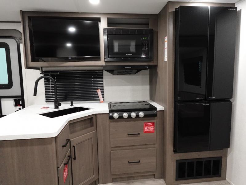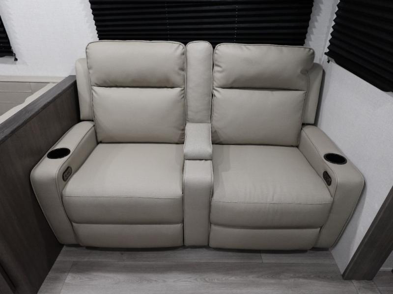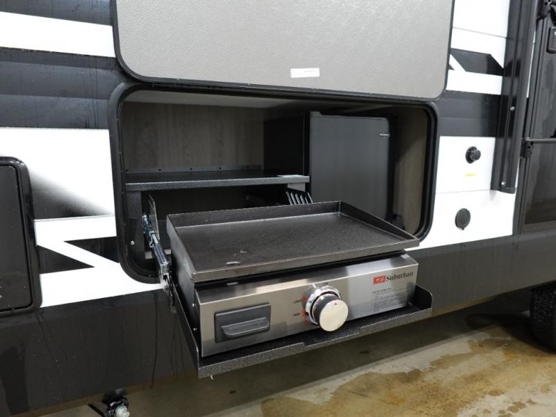 If you're looking for a travel trailer that can house your whole gang, this unit is the one! The rear private bunkhouse can sleep up to five since there is a sleeper sofa and three bunks, plus there are storage drawers for your guests' things. A front private bedroom will be perfect for the owners with a queen bed, storage space, and a convenient laundry chute! Whether you cook outside on the exterior griddle or inside on the three burner range, you'll be able to make your best meals. There is also a 12V French door refrigerator with a glass front and bottom freezer and a convection microwave/combo air fryer for easy meals! A U-shaped dinette and theater seats within the living room slide provides even more seating and sleeping space, or you can choose the optional theater seat in place of the sofa if you're not needing the extra sleeping space!