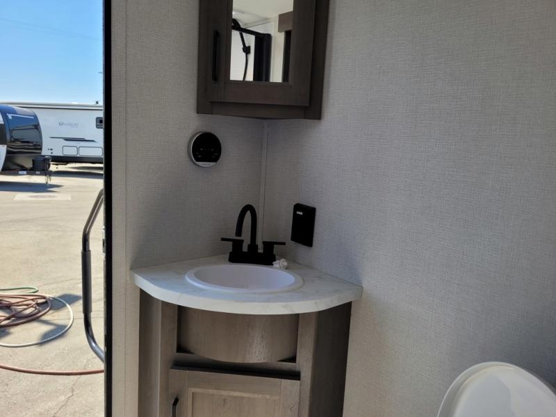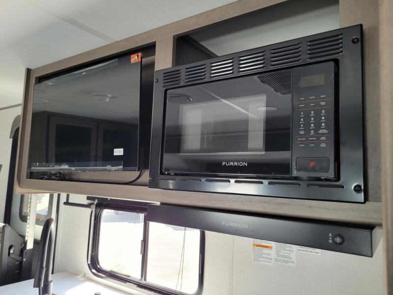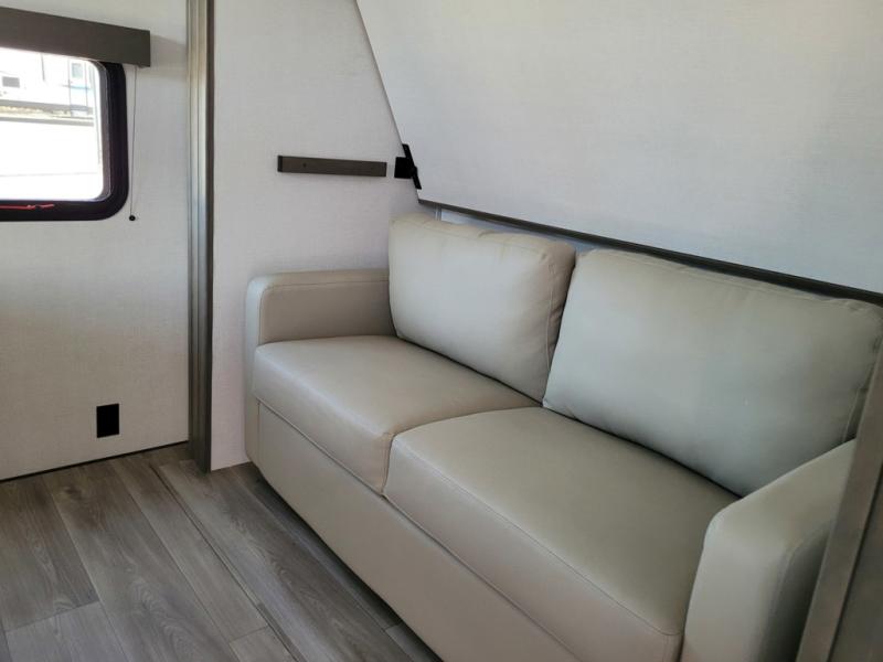 If you're looking for a travel trailer that can house your whole gang, this unit is the one! The rear private bunkhouse can sleep up to five since there is a sleeper sofa and three bunks, plus there are storage drawers for your guests' things. A front private bedroom will be perfect for the owners with a queen bed, storage space, and a convenient laundry chute! Whether you cook outside on the exterior griddle or inside on the three burner range, you'll be able to make your best meals. There is also a 12V French door refrigerator with a glass front and bottom freezer and a convection microwave/combo air fryer for easy meals! A U-shaped dinette and 60" sleeper sofa within the living room slide provides even more seating and sleeping space, or you can choose the optional theater seat in place of the sofa if you're not needing the extra sleeping space!