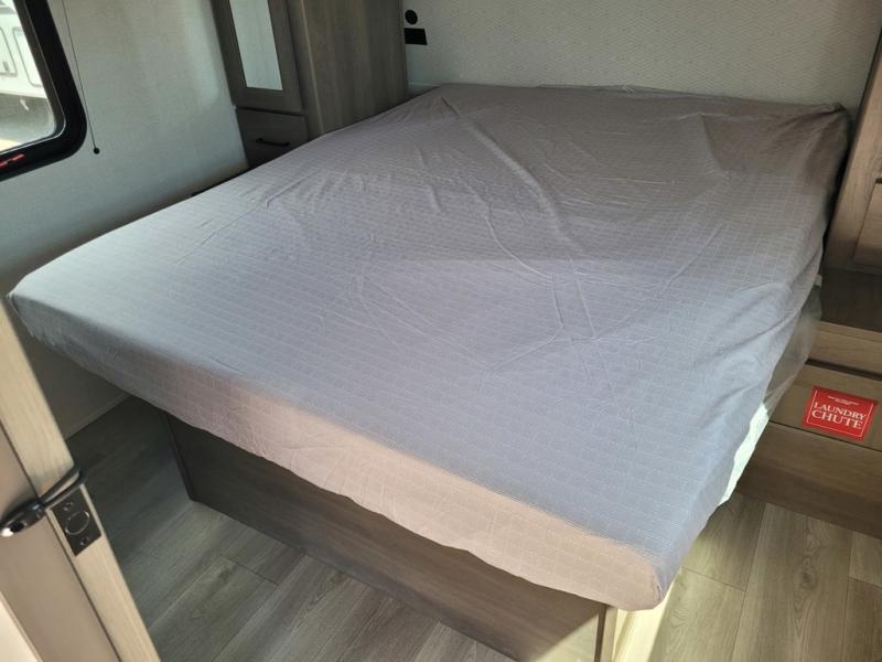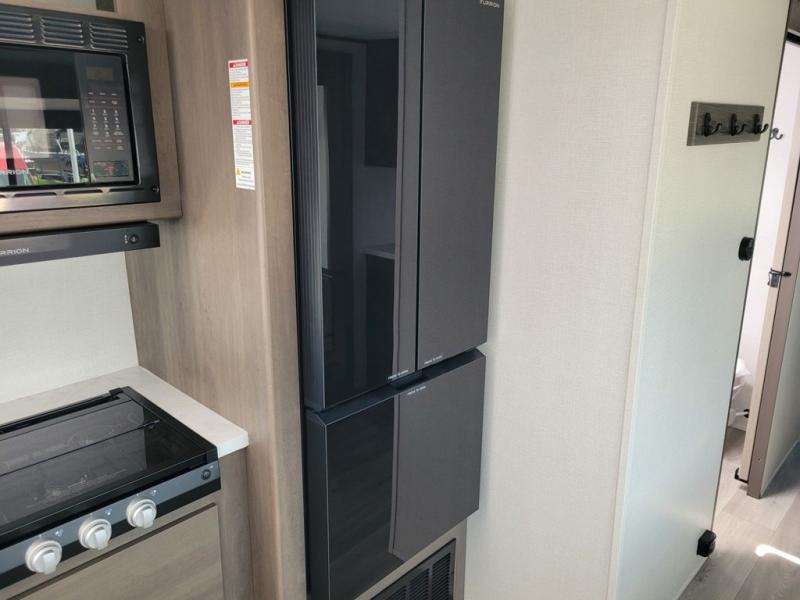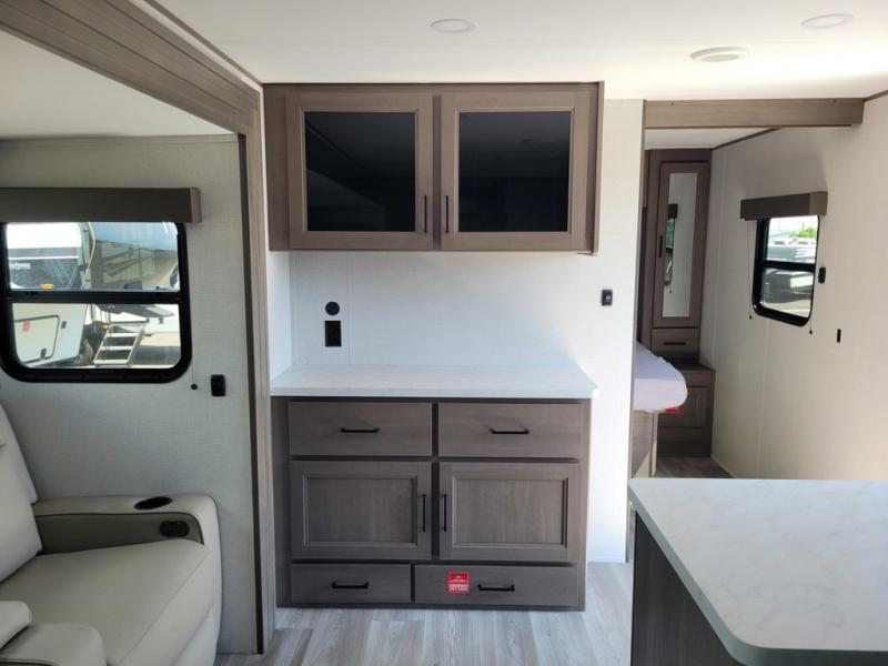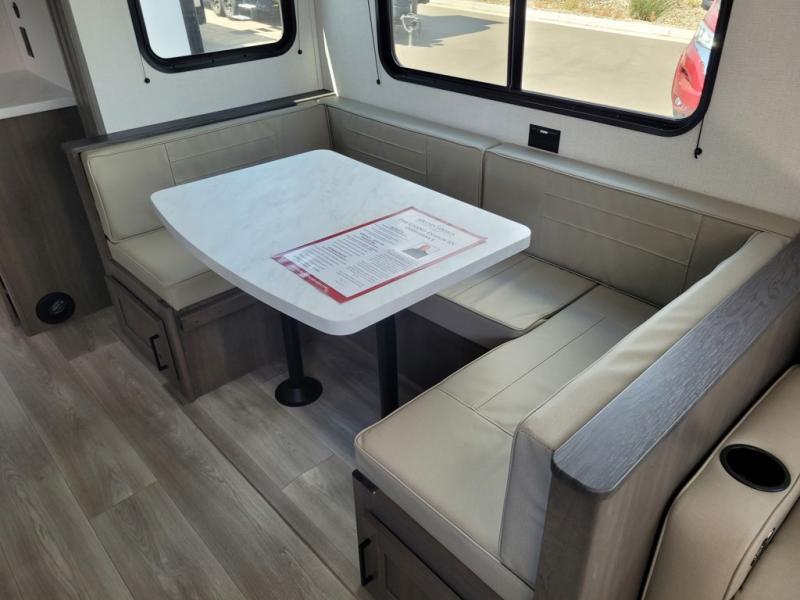 If you're looking for a travel trailer that can house your whole gang, this unit is the one! The rear private bunkhouse can sleep up to five since there is a sleeper sofa and three bunks, plus there are storage drawers for your guests' things. A front private bedroom will be perfect for the owners with a queen bed, storage space, and a convenient laundry chute! Whether you cook outside on the exterior griddle or inside on the three burner range, you'll be able to make your best meals. There is also a 12V French door refrigerator with a glass front and bottom freezer and a convection microwave/combo air fryer for easy meals! A U-shaped dinette and 60" sleeper sofa within the living room slide provides even more seating and sleeping space, or you can choose the optional theater seat in place of the sofa if you're not needing the extra sleeping space!