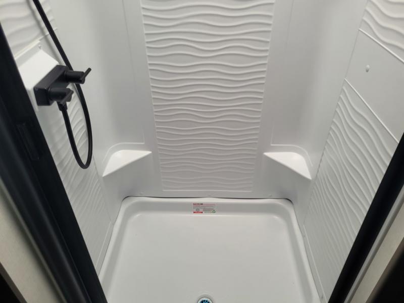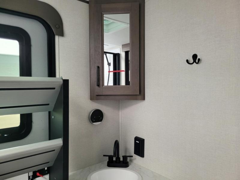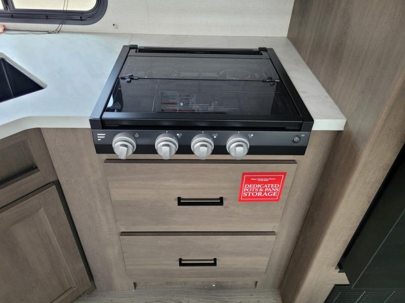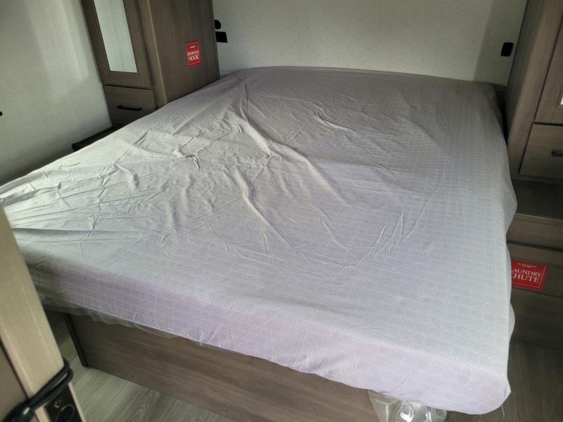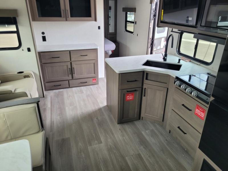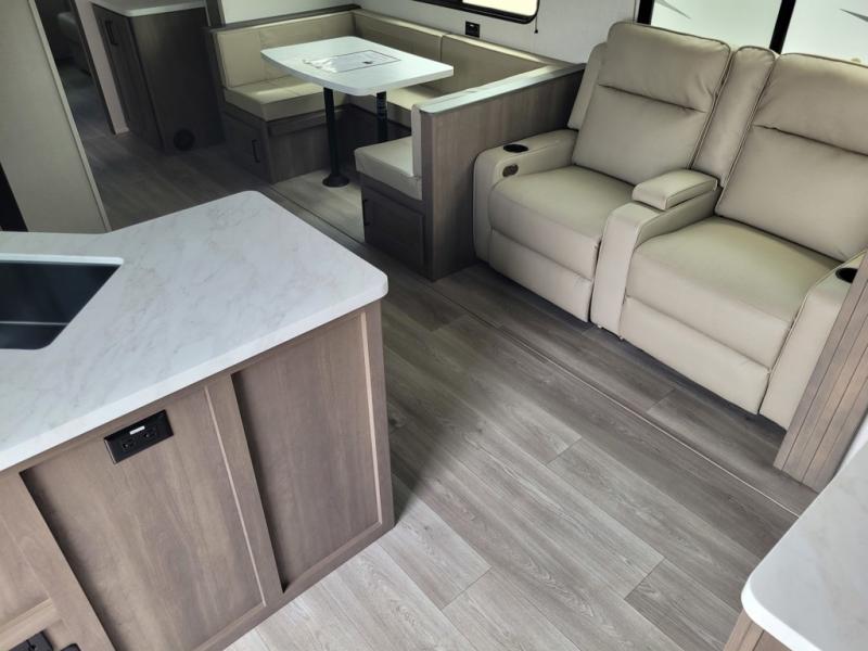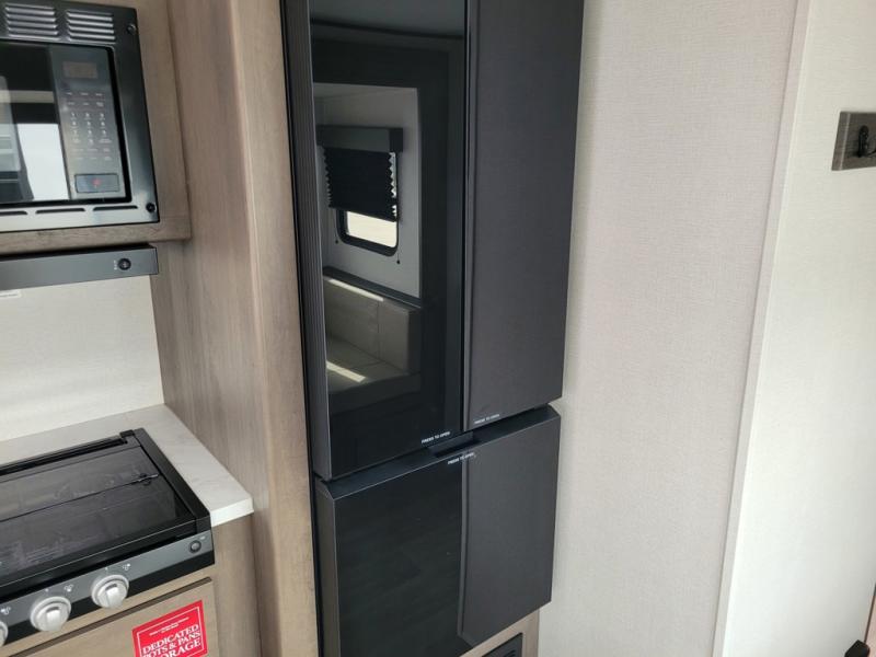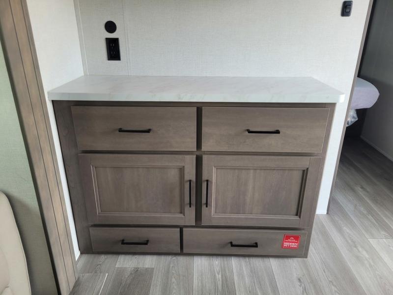 If you're looking for a travel trailer that can house your whole gang, this unit is the one! The rear private bunkhouse can sleep up to five since there is a sleeper sofa and three bunks, plus there are storage drawers for your guests' things. A front private bedroom will be perfect for the owners with a queen bed, storage space, and a convenient laundry chute! Whether you cook outside on the exterior griddle or inside on the three burner range, you'll be able to make your best meals. There is also a 12V French door refrigerator with a glass front and bottom freezer and a convection microwave/combo air fryer for easy meals! A U-shaped dinette and 60" sleeper sofa within the living room slide provides even more seating and sleeping space, or you can choose the optional theater seat in place of the sofa if you're not needing the extra sleeping space!