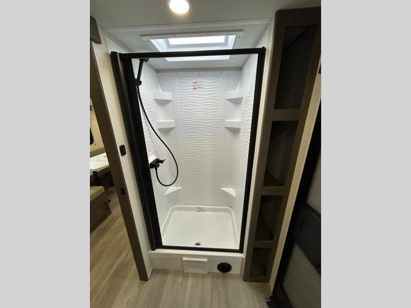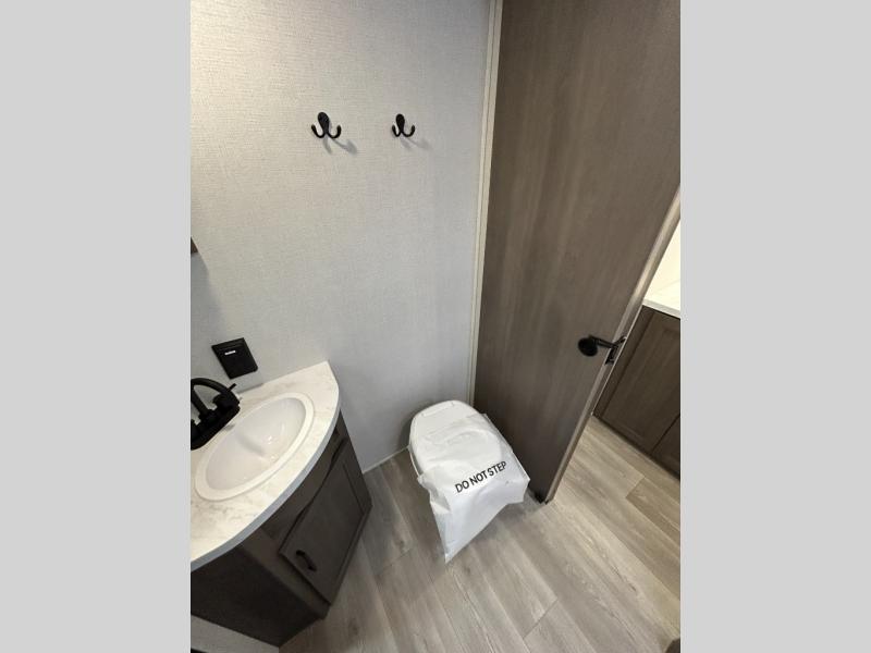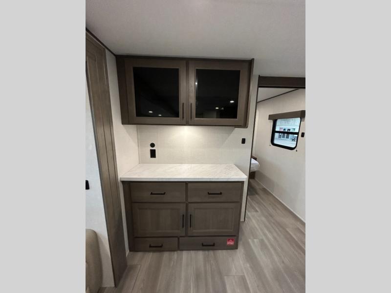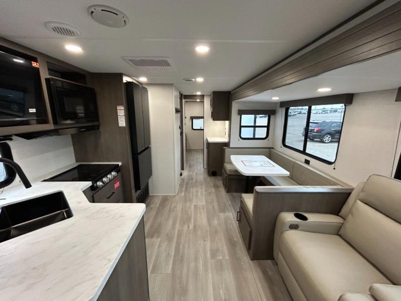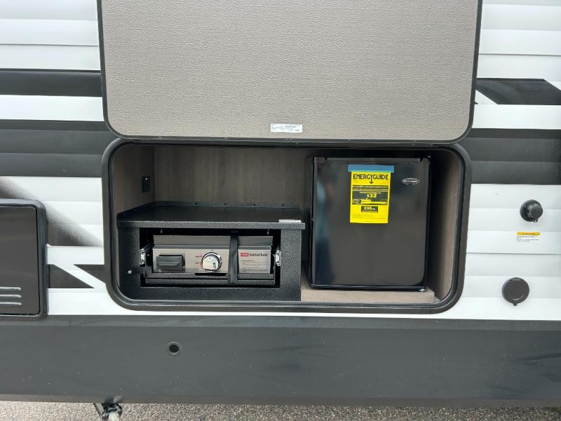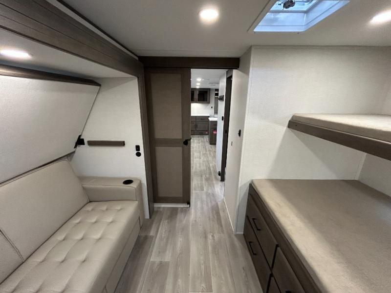 If you're looking for a travel trailer that can house your whole gang, this unit is the one! The rear private bunkhouse can sleep up to five since there is a sleeper sofa and three bunks, plus there are storage drawers for your guests' things. A front private bedroom will be perfect for the owners with a queen bed, storage space, and a convenient laundry chute! Whether you cook outside on the exterior griddle or inside on the three burner range, you'll be able to make your best meals. There is also a 12V French door refrigerator with a glass front and bottom freezer and a convection microwave/combo air fryer for easy meals! A U-shaped dinette and 60" sleeper sofa within the living room slide provides even more seating and sleeping space, or you can choose the optional theater seat in place of the sofa if you're not needing the extra sleeping space!