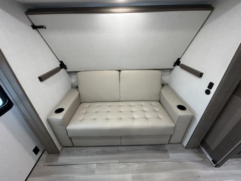 If you're looking for a travel trailer that can house your whole gang, this unit is the one! The rear private bunkhouse can sleep up to five since there is a sleeper sofa and three bunks, plus there are storage drawers for your guests' things. A front private bedroom will be perfect for the owners with a queen bed, storage space, and a convenient laundry chute! Whether you cook outside on the exterior griddle or inside on the three burner range, you'll be able to make your best meals. There is also a 12V French door refrigerator with a glass front and bottom freezer and a convection microwave/combo air fryer for easy meals! A U-shaped dinette and 60" sleeper sofa within the living room slide provides even more seating and sleeping space, or you can choose the optional theater seat in place of the sofa if you're not needing the extra sleeping space!