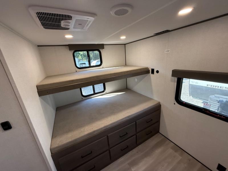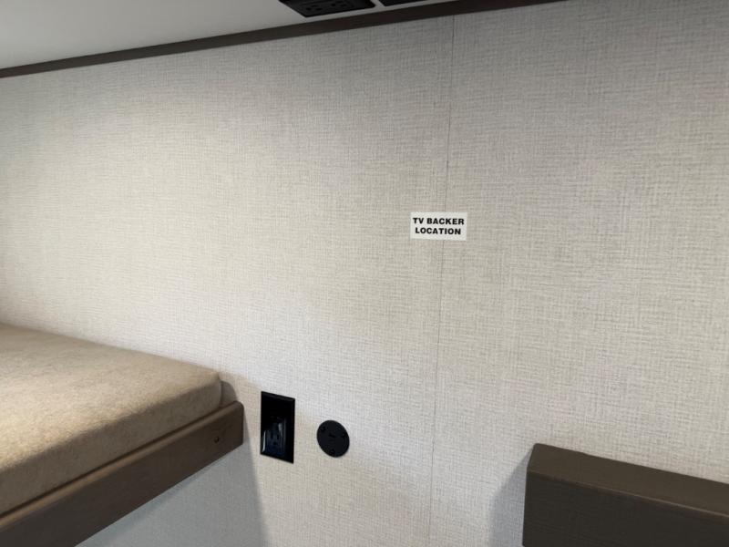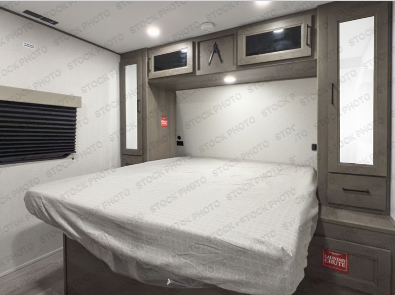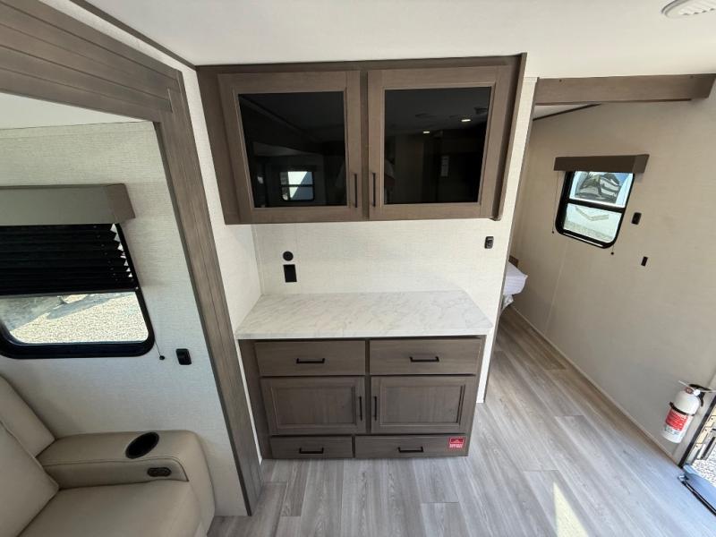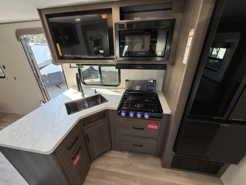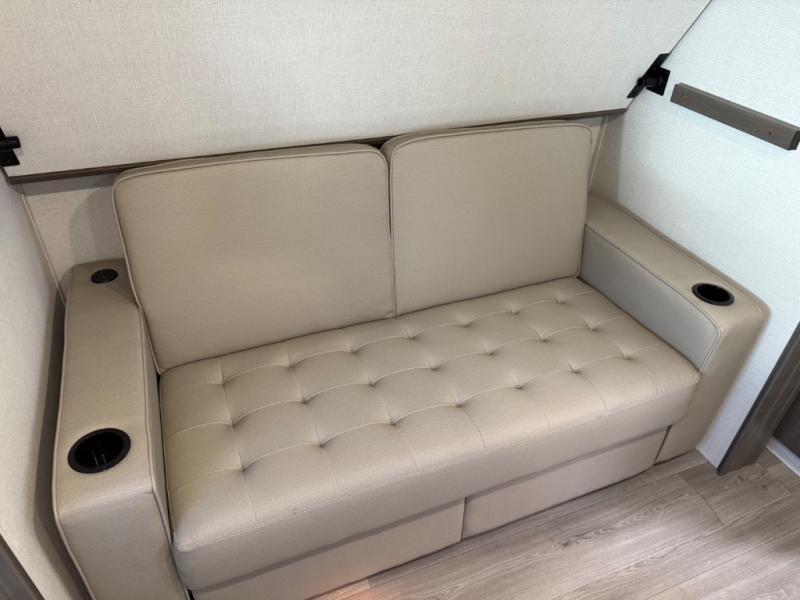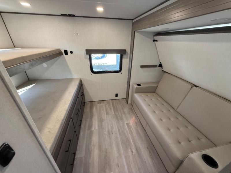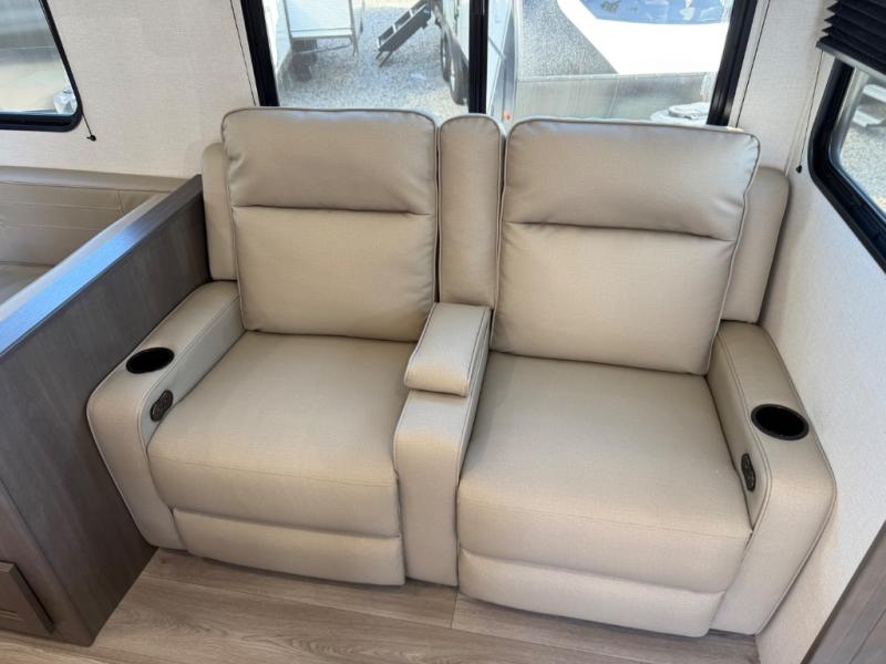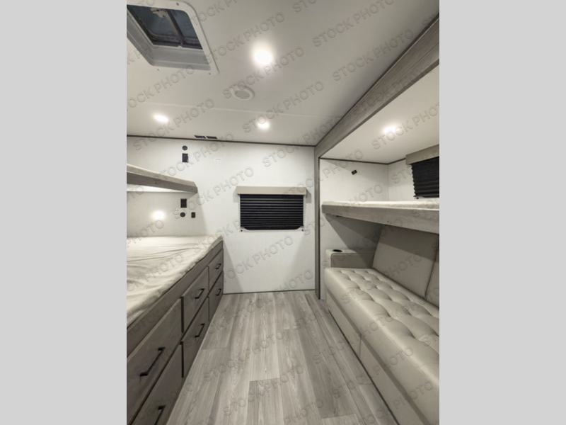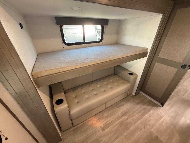 If you're looking for a travel trailer that can house your whole gang, this unit is the one! The rear private bunkhouse can sleep up to five since there is a sleeper sofa and three bunks, plus there are storage drawers for your guests' things. A front private bedroom will be perfect for the owners with a queen bed, storage space, and a convenient laundry chute! Whether you cook outside on the exterior griddle or inside on the three burner range, you'll be able to make your best meals. There is also a 12V French door refrigerator with a glass front and bottom freezer and a convection microwave/combo air fryer for easy meals! A U-shaped dinette and 60" sleeper sofa within the living room slide provides even more seating and sleeping space, or you can choose the optional theater seat in place of the sofa if you're not needing the extra sleeping space!