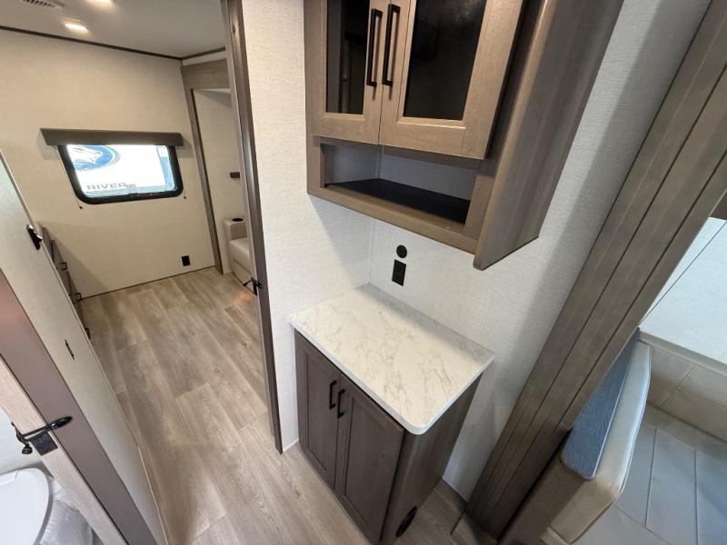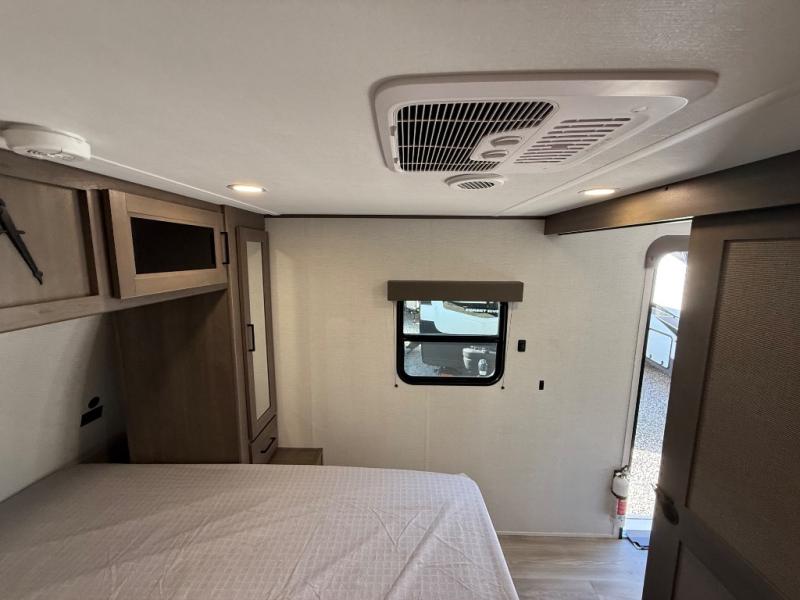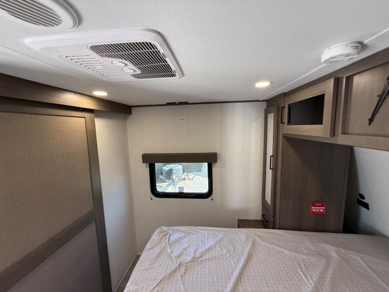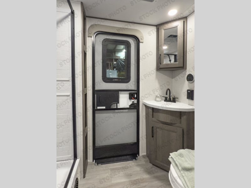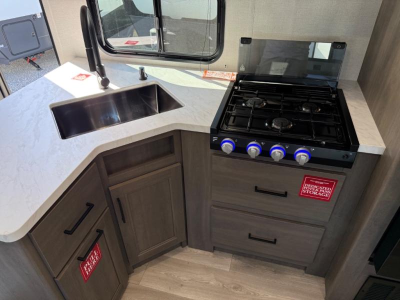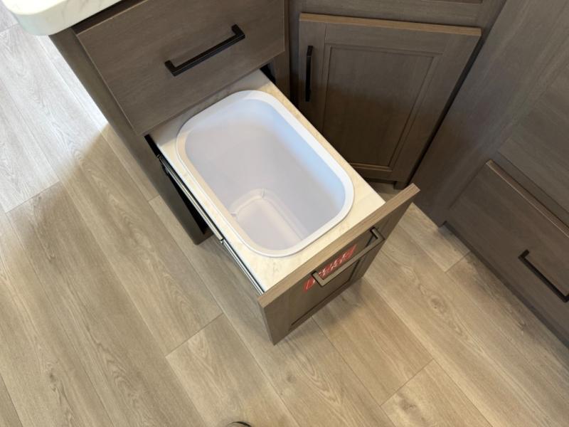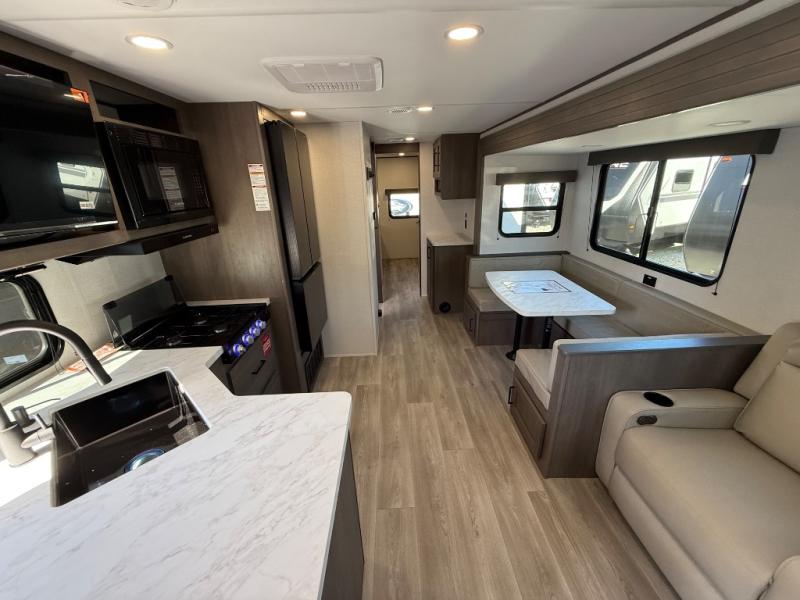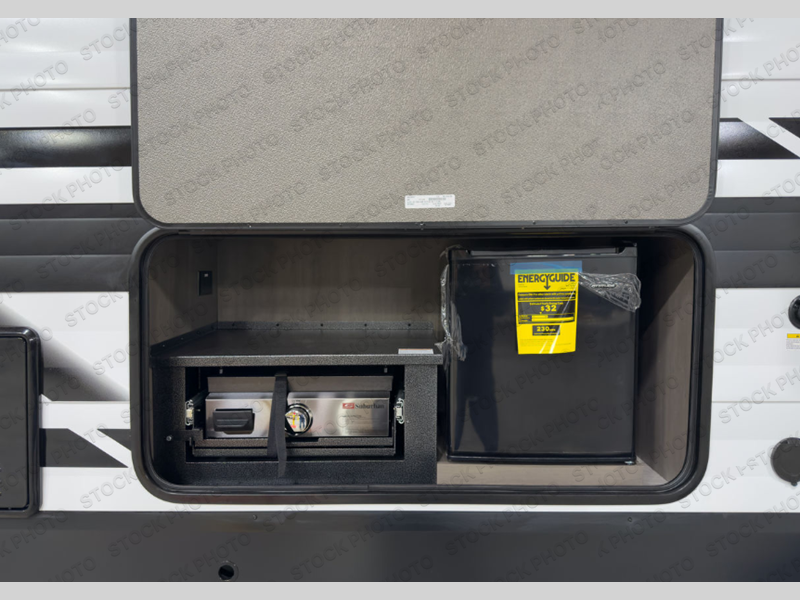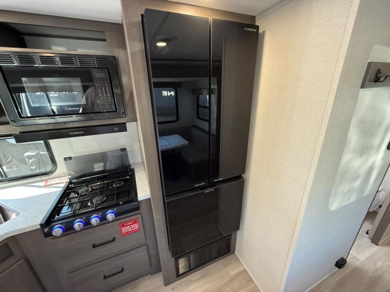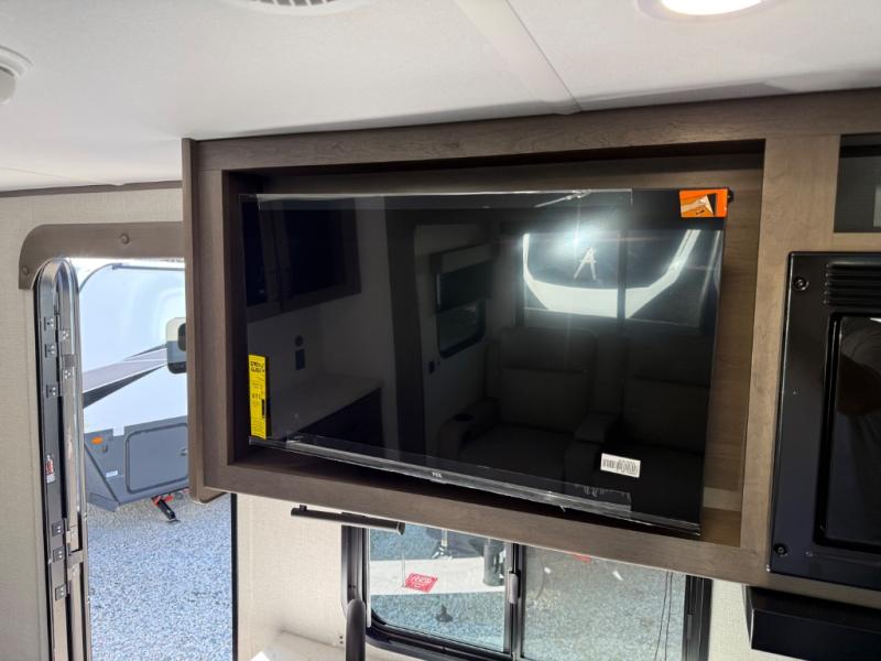 If you're looking for a travel trailer that can house your whole gang, this unit is the one! The rear private bunkhouse can sleep up to five since there is a sleeper sofa and three bunks, plus there are storage drawers for your guests' things. A front private bedroom will be perfect for the owners with a queen bed, storage space, and a convenient laundry chute! Whether you cook outside on the exterior griddle or inside on the three burner range, you'll be able to make your best meals. There is also a 12V French door refrigerator with a glass front and bottom freezer and a convection microwave/combo air fryer for easy meals! A U-shaped dinette and 60" sleeper sofa within the living room slide provides even more seating and sleeping space, or you can choose the optional theater seat in place of the sofa if you're not needing the extra sleeping space!