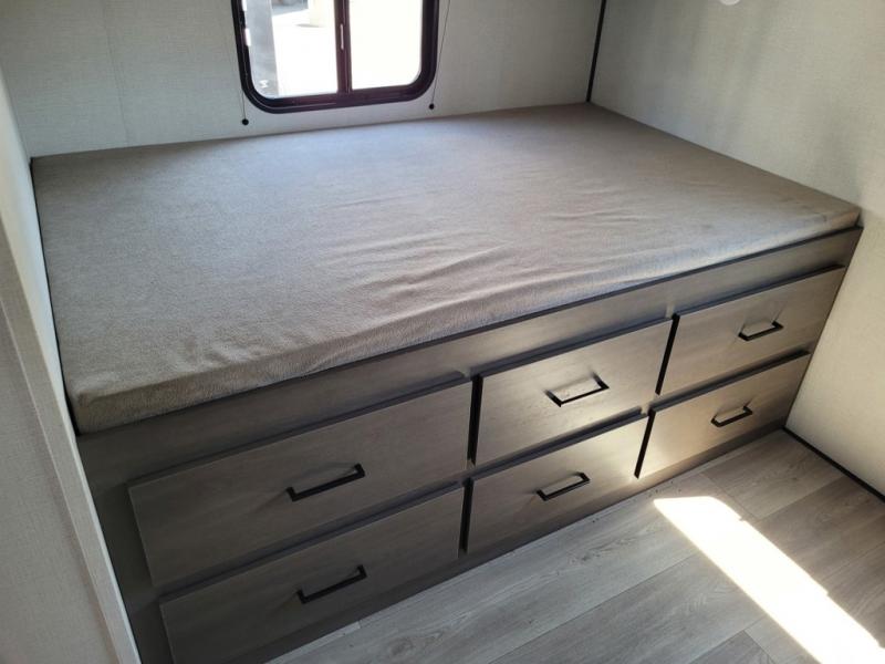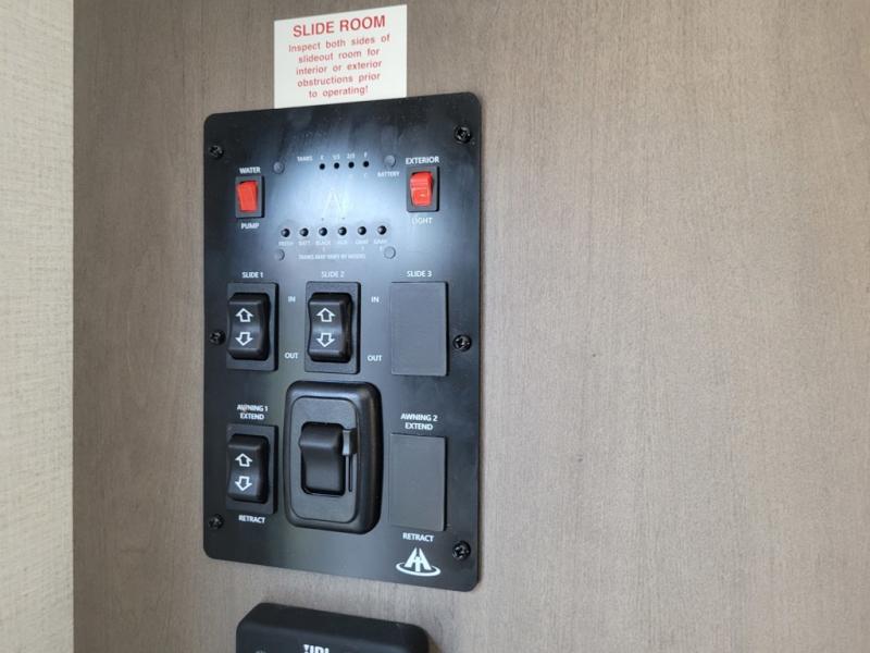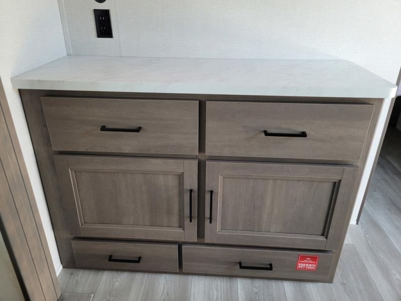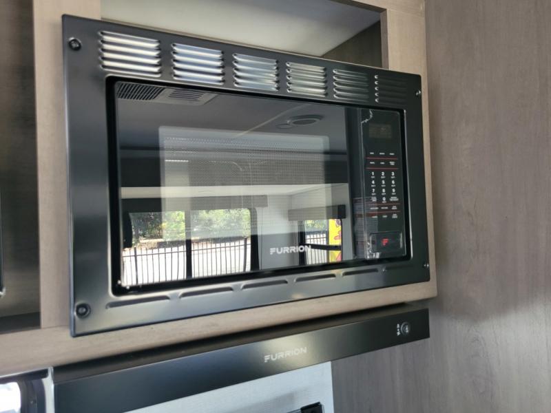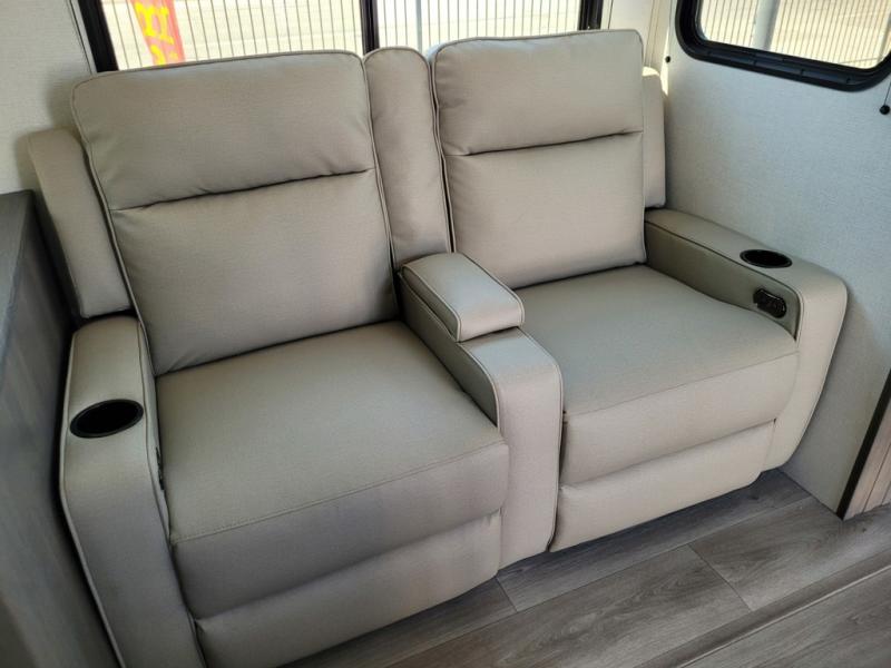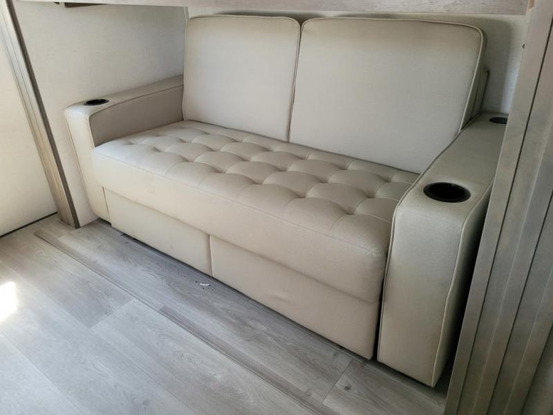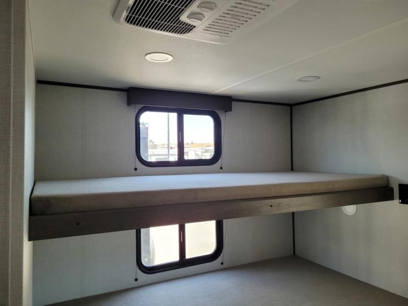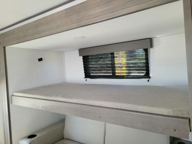 If you're looking for a travel trailer that can house your whole gang, this unit is the one! The rear private bunkhouse can sleep up to five since there is a sleeper sofa and three bunks, plus there are storage drawers for your guests' things. A front private bedroom will be perfect for the owners with a queen bed, storage space, and a convenient laundry chute! Whether you cook outside on the exterior griddle or inside on the three burner range, you'll be able to make your best meals. There is also a 12V French door refrigerator with a glass front and bottom freezer and a convection microwave/combo air fryer for easy meals! A U-shaped dinette and 60" sleeper sofa within the living room slide provides even more seating and sleeping space, or you can choose the optional theater seat in place of the sofa if you're not needing the extra sleeping space!