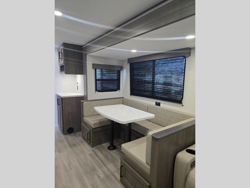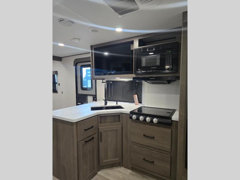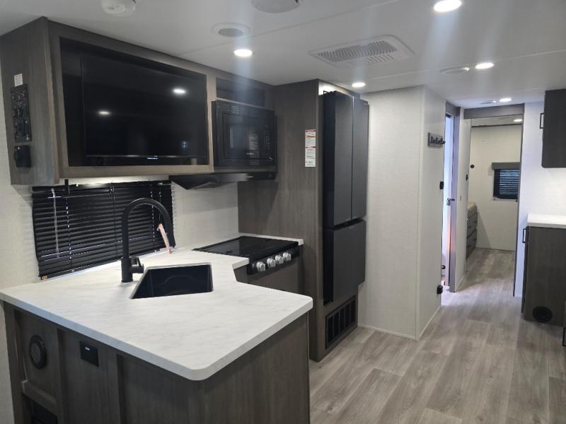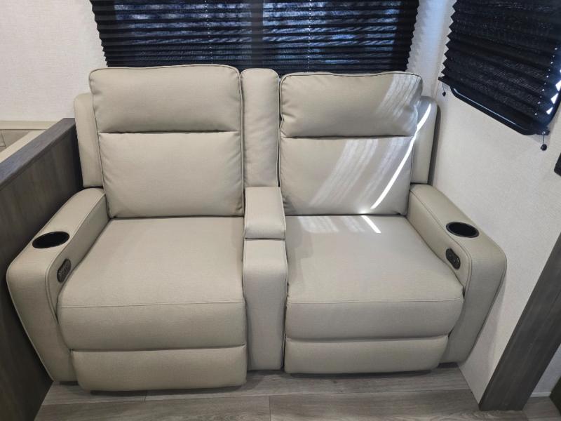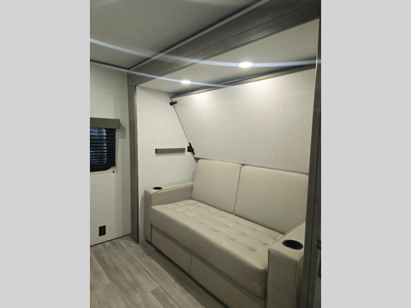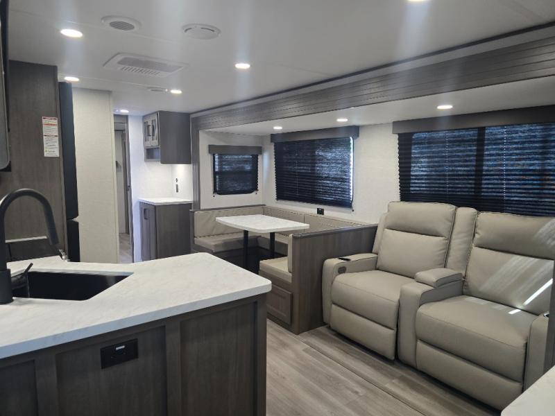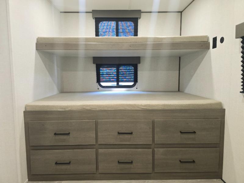 If you're looking for a travel trailer that can house your whole gang, this unit is the one! The rear private bunkhouse can sleep up to five since there is a sleeper sofa and three bunks, plus there are storage drawers for your guests' things. A front private bedroom will be perfect for the owners with a queen bed, storage space, and a convenient laundry chute! Whether you cook outside on the exterior griddle or inside on the three burner range, you'll be able to make your best meals. There is also a 12V French door refrigerator with a glass front and bottom freezer and a convection microwave/combo air fryer for easy meals! A U-shaped dinette and 60" sleeper sofa within the living room slide provides even more seating and sleeping space, or you can choose the optional theater seat in place of the sofa if you're not needing the extra sleeping space!