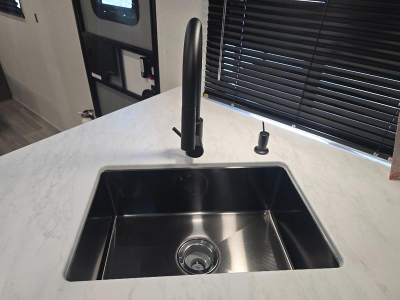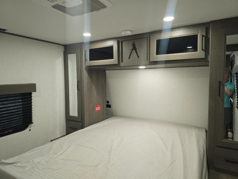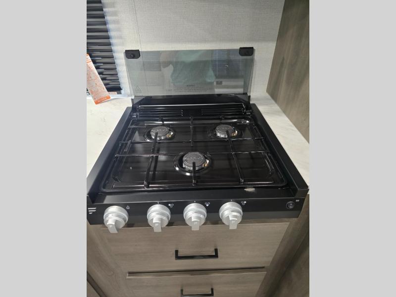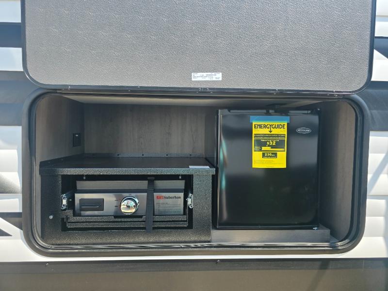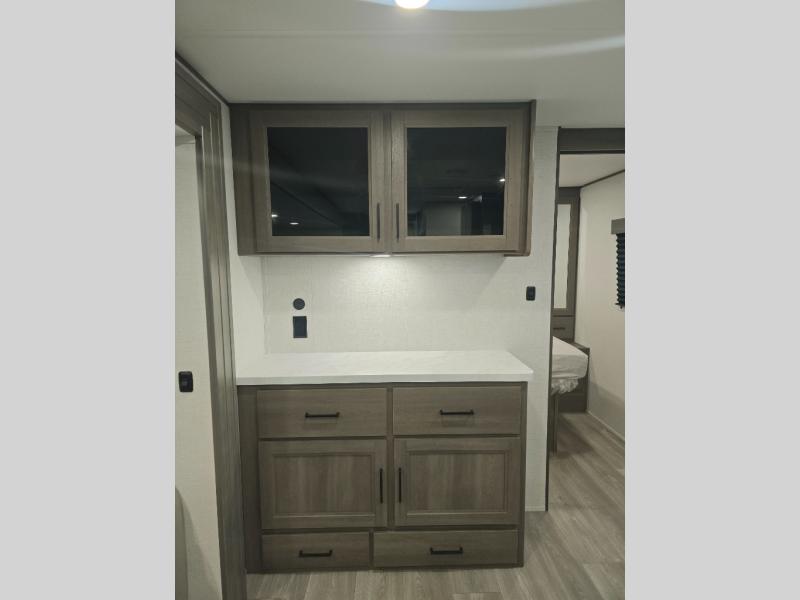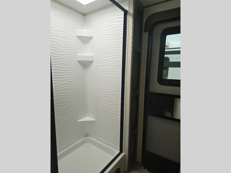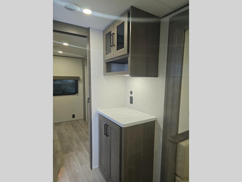 If you're looking for a travel trailer that can house your whole gang, this unit is the one! The rear private bunkhouse can sleep up to five since there is a sleeper sofa and three bunks, plus there are storage drawers for your guests' things. A front private bedroom will be perfect for the owners with a queen bed, storage space, and a convenient laundry chute! Whether you cook outside on the exterior griddle or inside on the three burner range, you'll be able to make your best meals. There is also a 12V French door refrigerator with a glass front and bottom freezer and a convection microwave/combo air fryer for easy meals! A U-shaped dinette and 60" sleeper sofa within the living room slide provides even more seating and sleeping space, or you can choose the optional theater seat in place of the sofa if you're not needing the extra sleeping space!